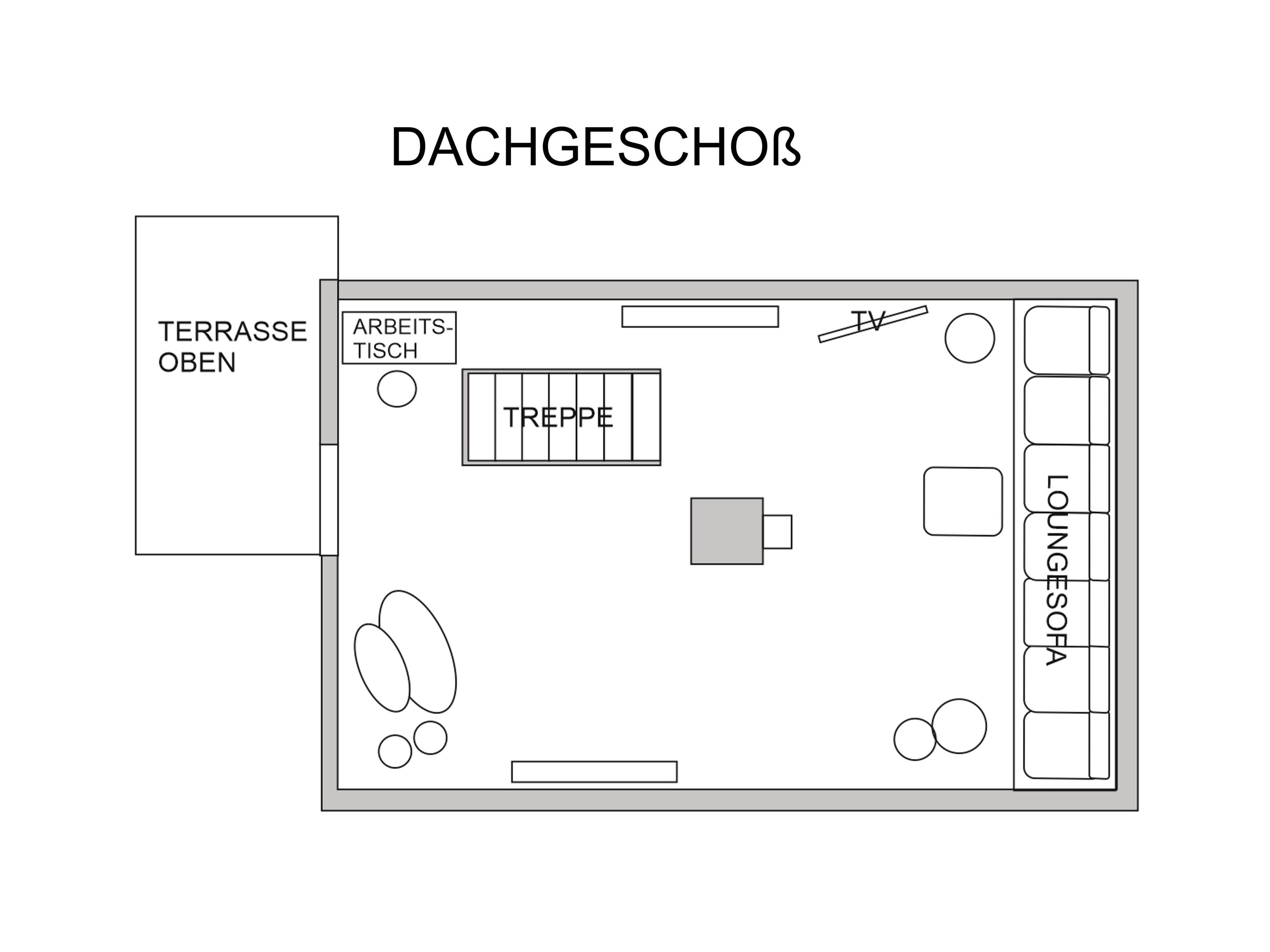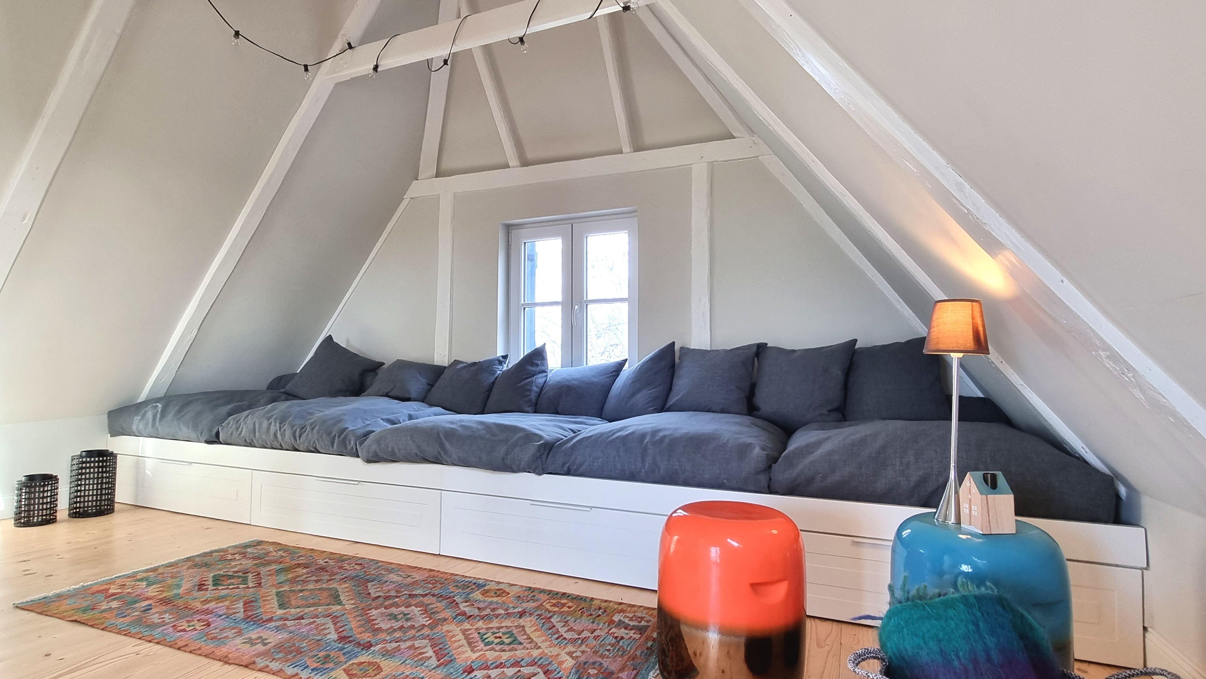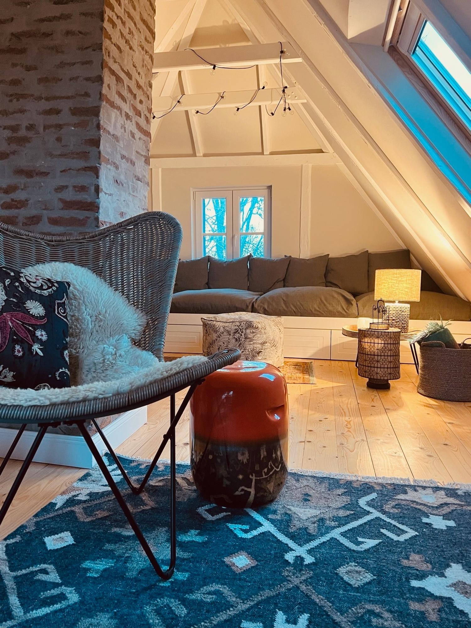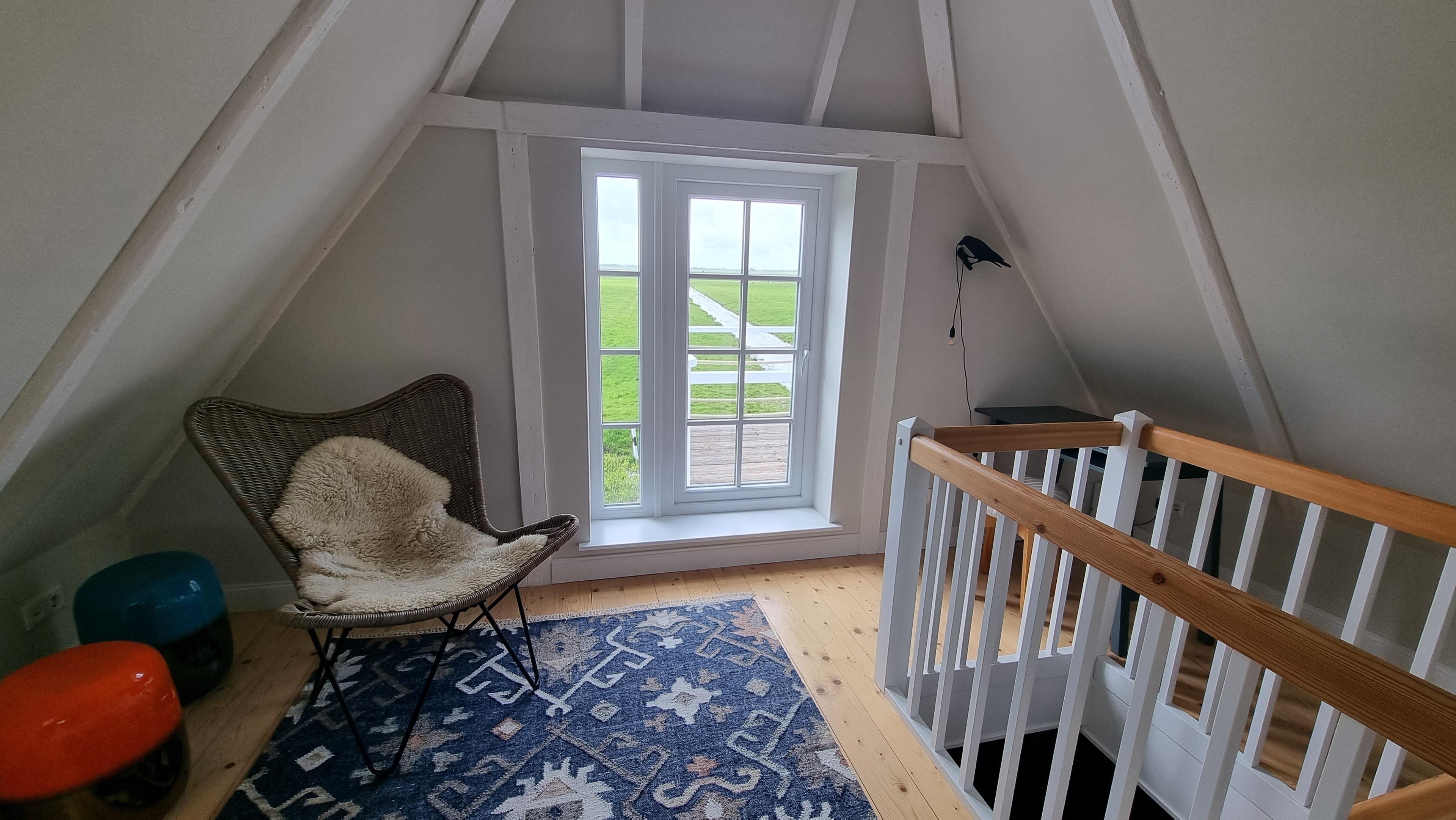 Im Dachgeschoss finden Sie ein riesiges Loungesofa mit viel Platz und vielen Kissen für ein Gefühl der Geborgenheit beim Lesen, Ruhen oder Fernsehen. Hier befindet sich auch ein kleiner Arbeitstisch und eine Terrasse von denen aus man einen herrlichen Blick über Weiden bis zum Horizont und den Sonnenuntergang hat.