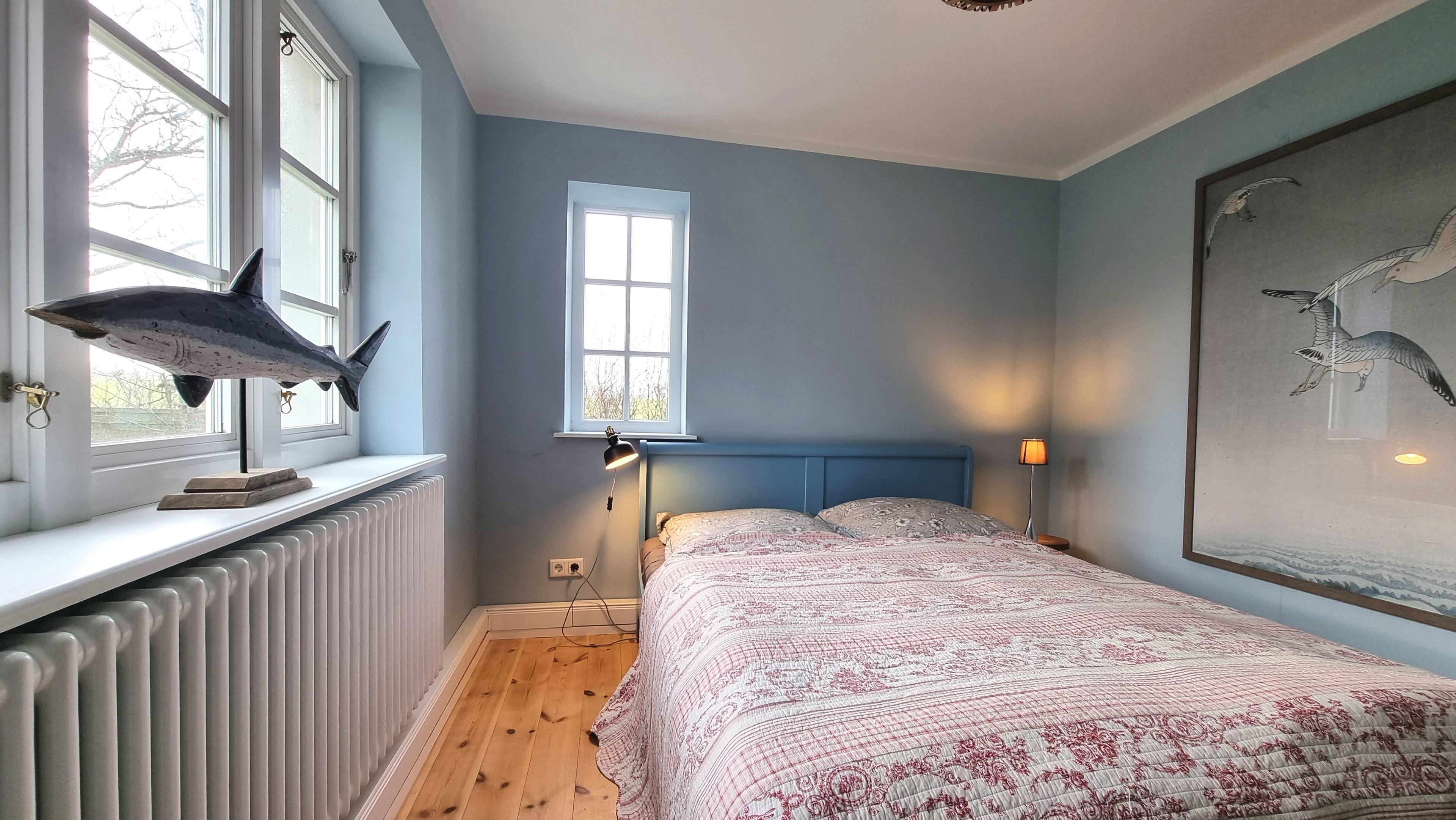 Ein Duschbad mit Waschmaschine befindet sich auch im Erdgeschoss, Genau wie das Schlafzimmer mit Doppelbett. Vom Schlafzimmer haben Sie Blick in den großen Garten.
