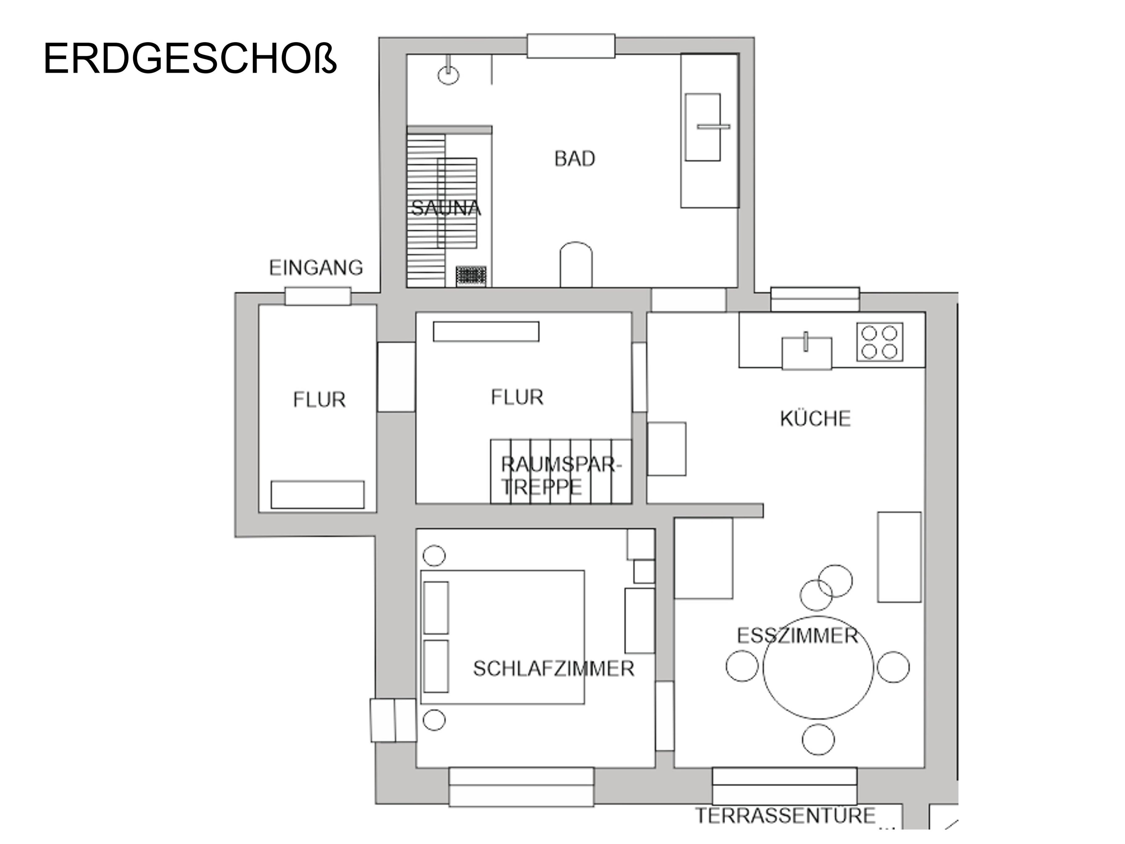 Der Eingang führt Sie direkt in einen kleinen Vorraum mit Kleiderschrank in dem Sie Ihre Jacken und Schuhe ablegen können. Von dort aus geht es durch den Flur mit der Treppe ins Wohnzimmer mit Terrasse im Dachgeschoss. Anschliessend betreten Sie die Wohnküche mit Esstisch und Kachelofen mit dem das ganze Haus zusätzlich beheizt werden kann. Von hier aus haben Sie Zutritt zur Gartenterrasse.