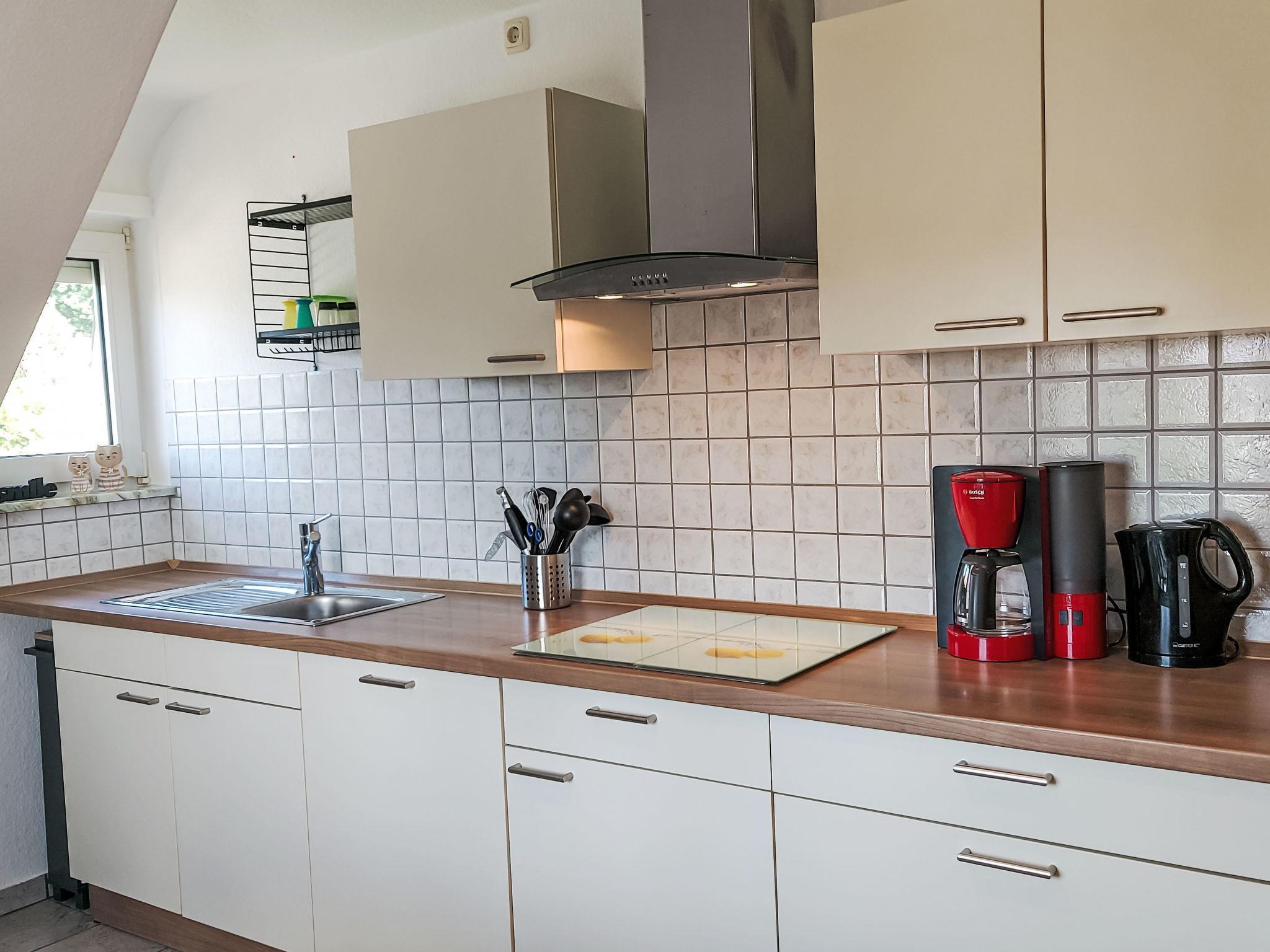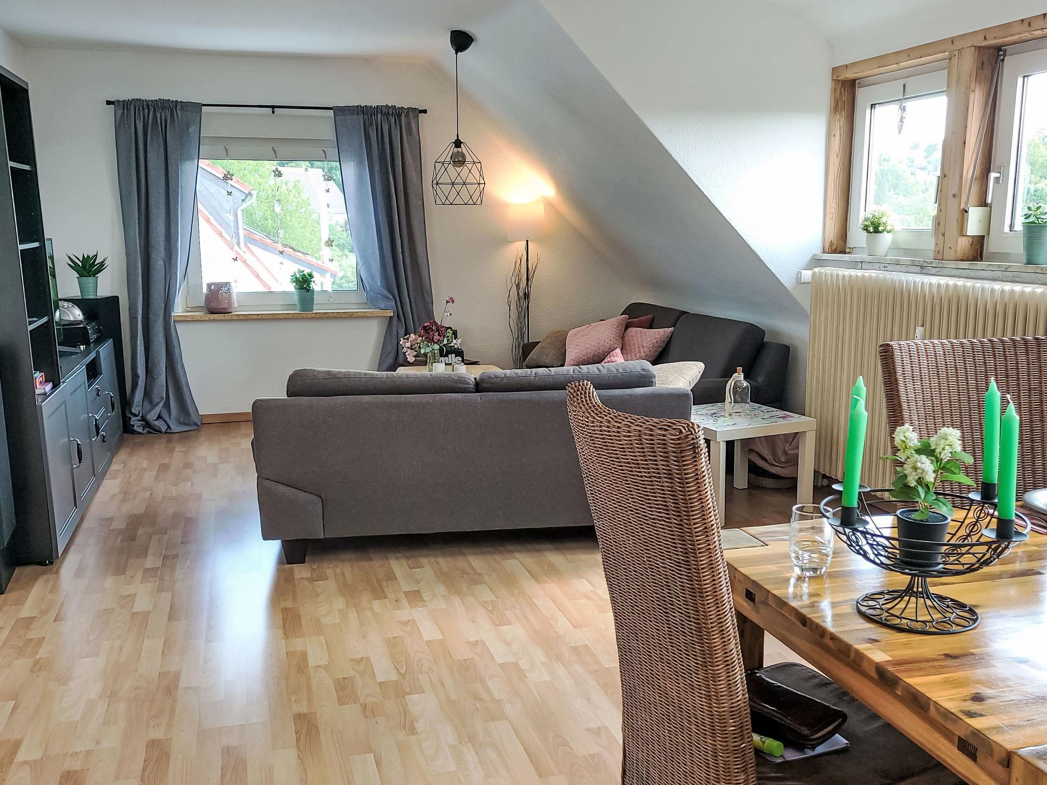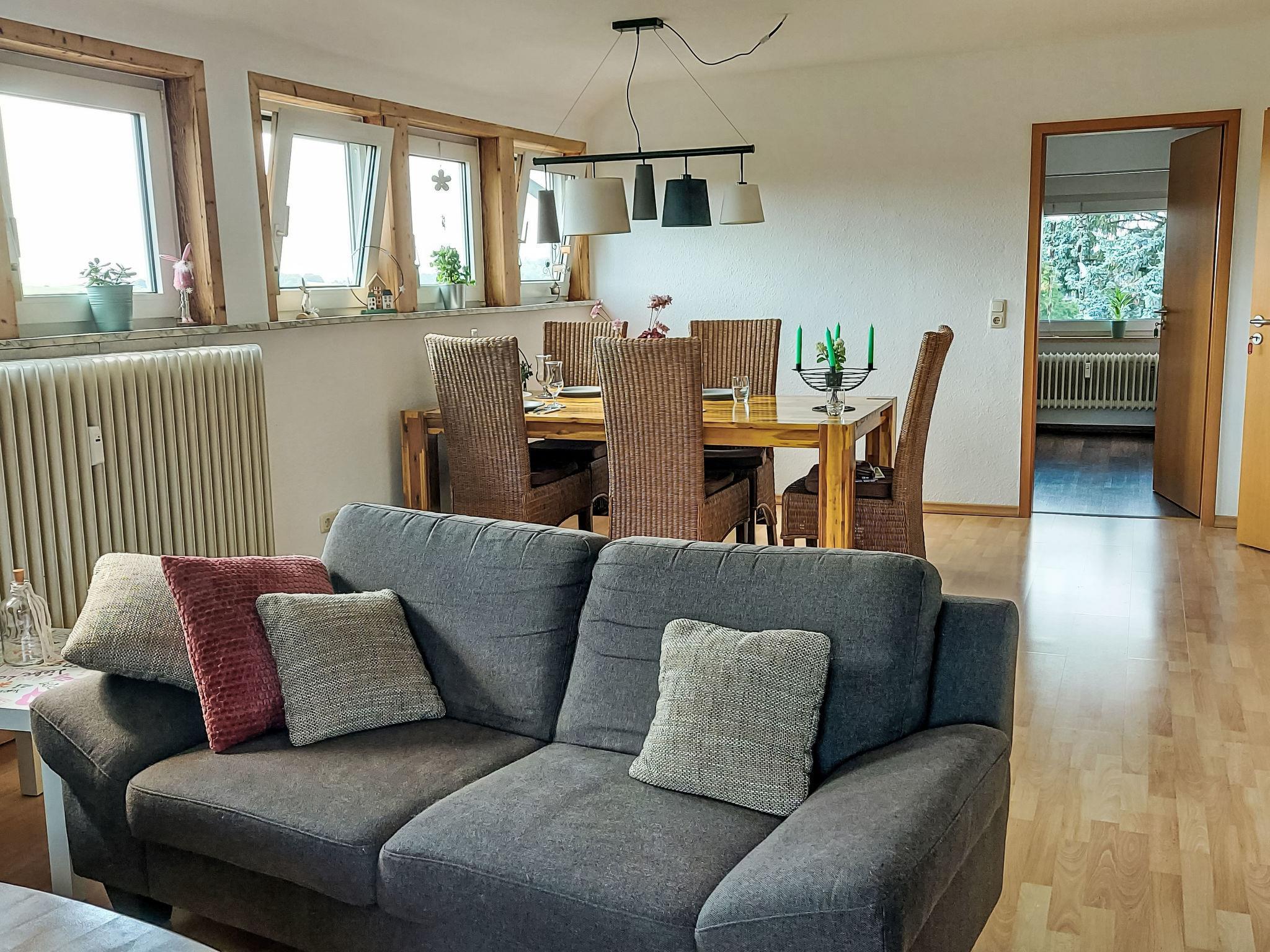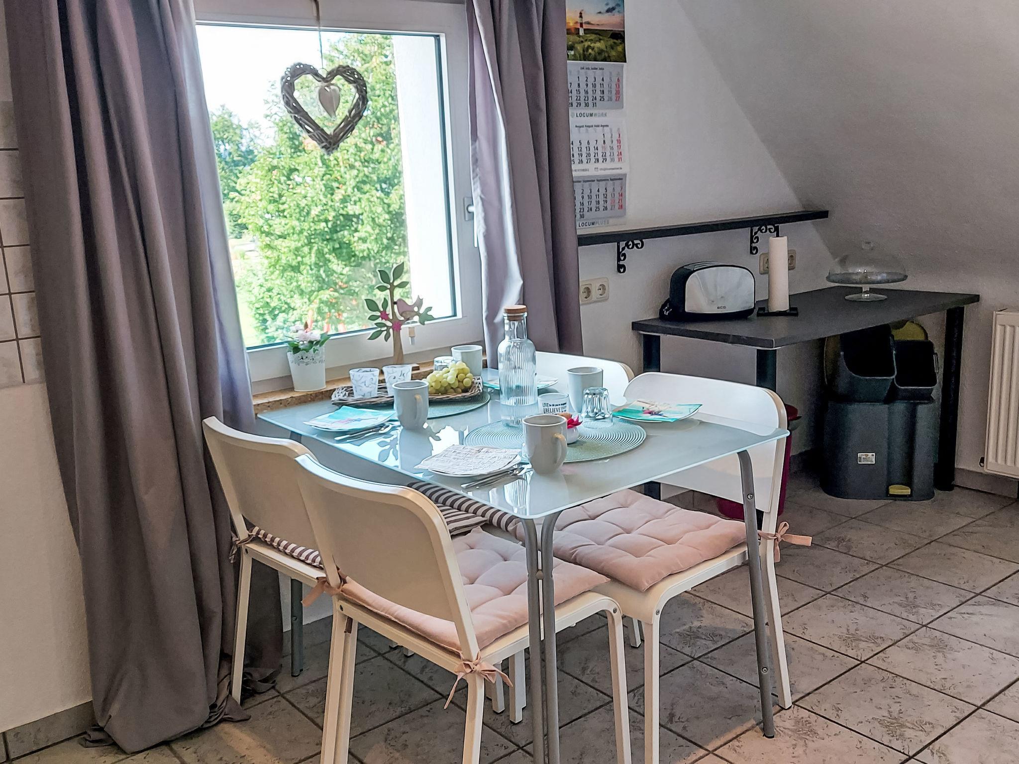 "Phoebe", 3-room apartment 80 m2, on the upper floor. Bright, with sloping ceilings, renovated in 2024, very tasteful and cosy furnishings: living/dining room with satellite TV (flat screen), hi-fi system. Large kitchen (oven, dishwasher, 4 ceramic glass hob hotplates, toaster, kettle, microwave, freezer, electric coffee machine, Capsules for coffee machine (Senseo)) with dining table. Shower/WC. Gas heating. Large terrace. Terrace furniture. Beautiful view of the countryside. Facilities: children's high chair, baby cot, hair dryer. Internet (WiFi, free). Please note: non-smokers only. Maximum 2 pets/ dogs allowed. Smoke alarm, fire extinguisher.