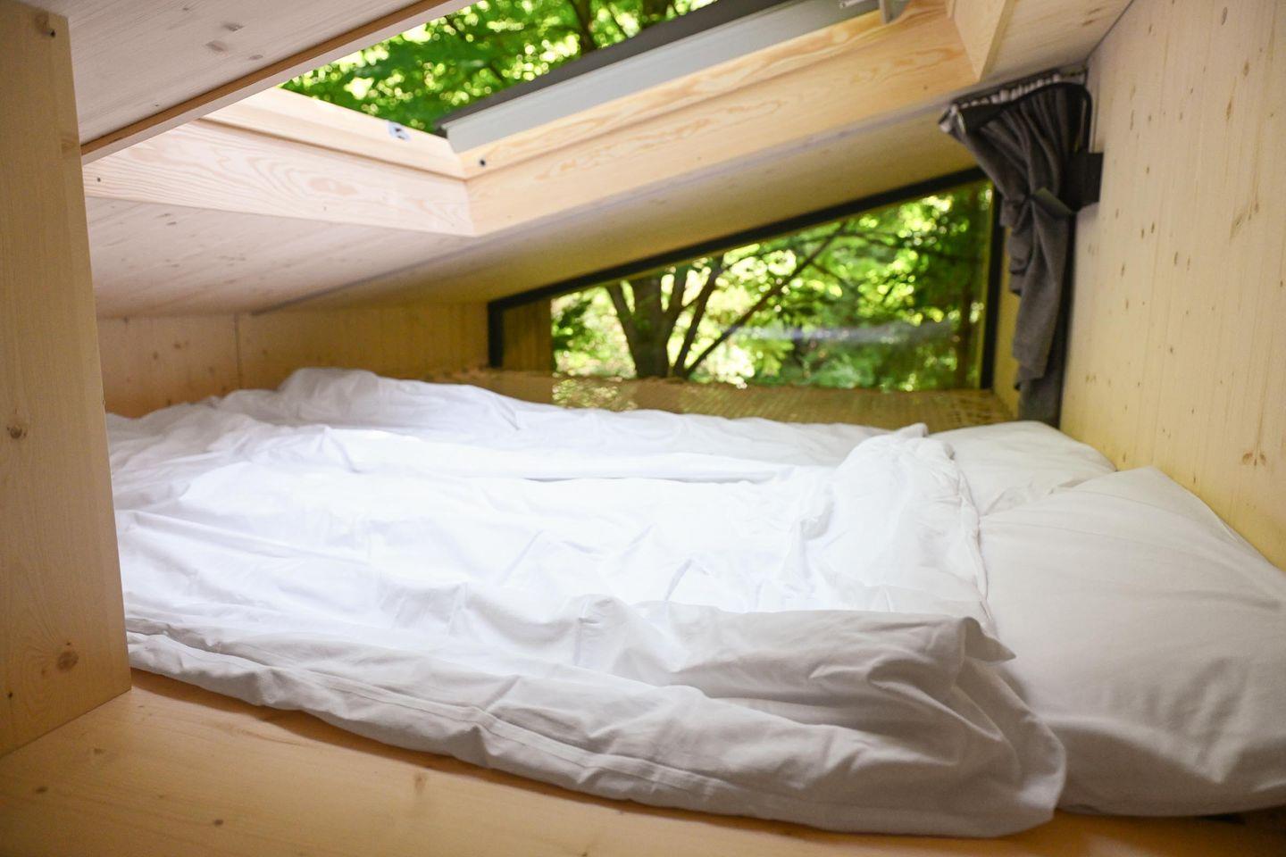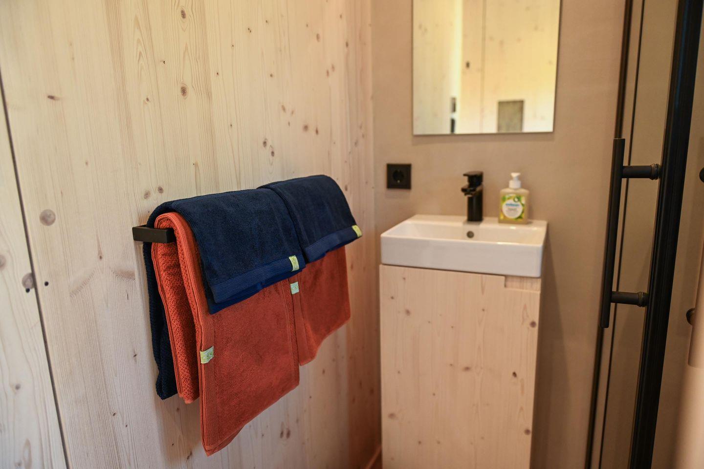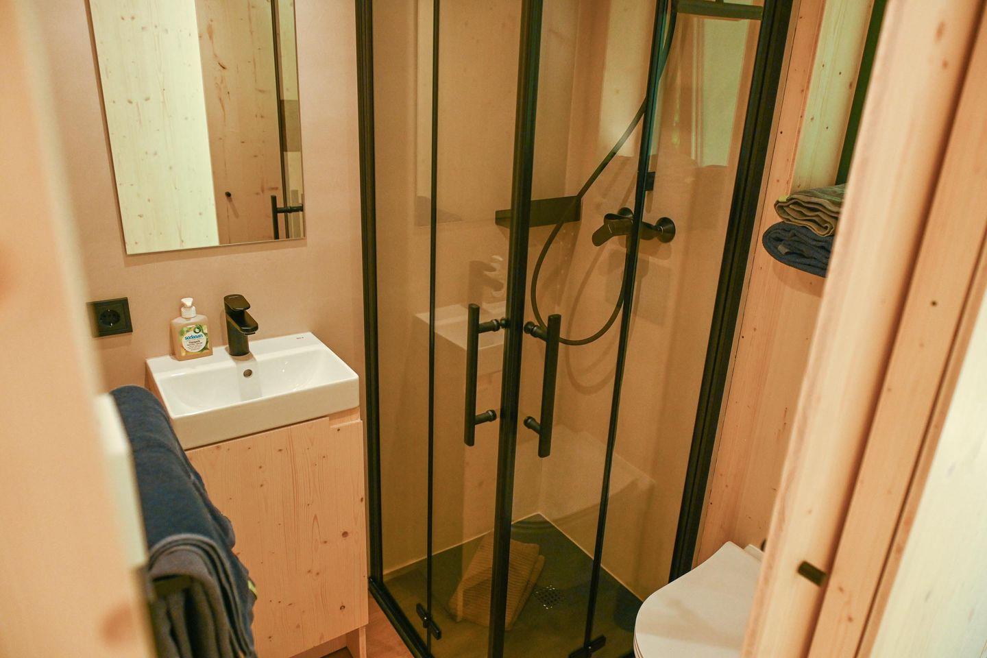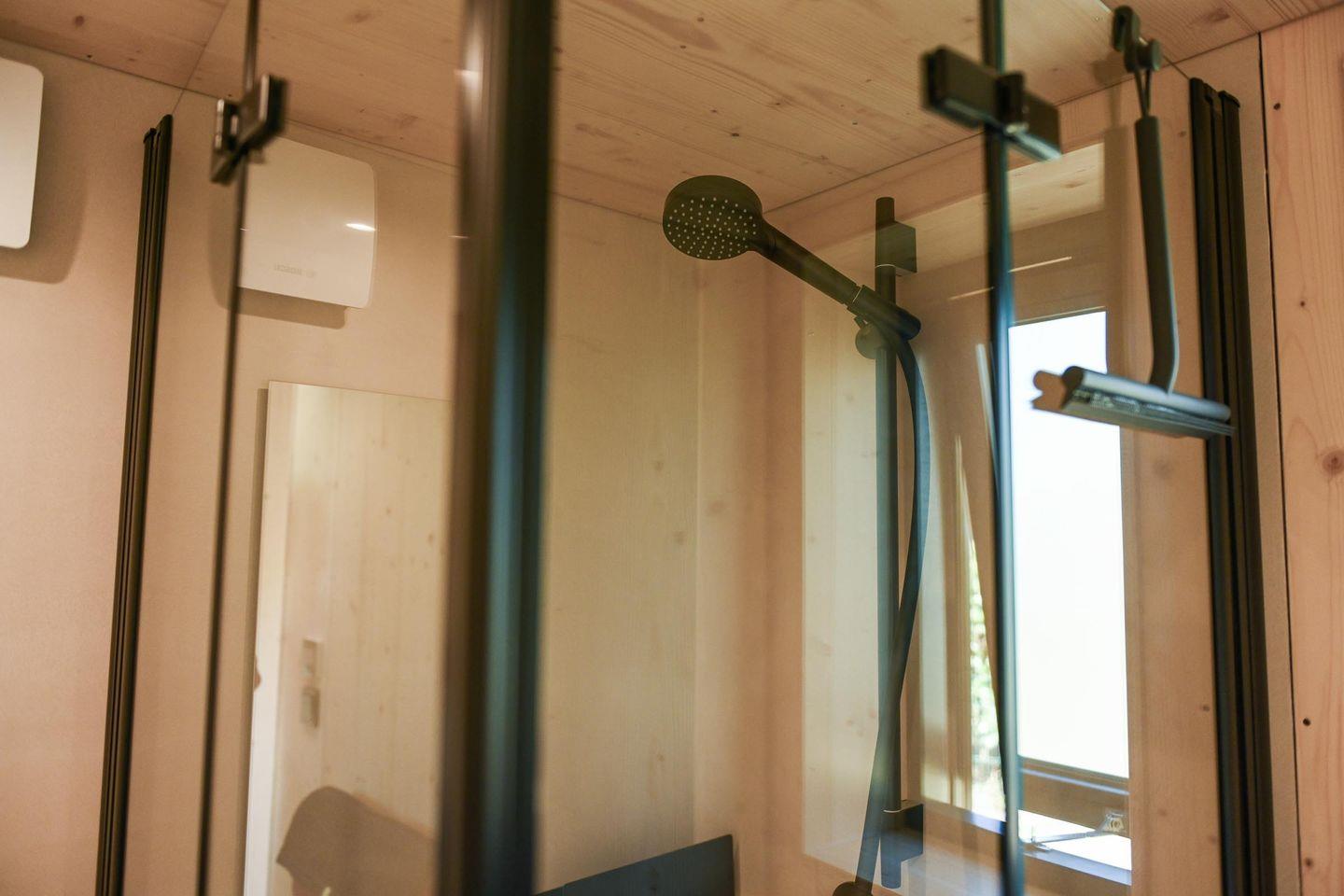 Die separate Schlafebene unter dem Dach erreichst du über eine kleine Treppe – mit gemütlichem Bett, Dachfenster, Verdunklungsmöglichkeiten und direktem Zugang zum Relax-Netz. Das Badezimmer ist klein, aber fein: Dusche, WC, Waschbecken, Spiegel und Fußbodenheizung sorgen für Komfort – auch an kühleren Tagen. Für dein Wohlgefühl liegen Handtücher aus nachhaltigen Materialien bereit.