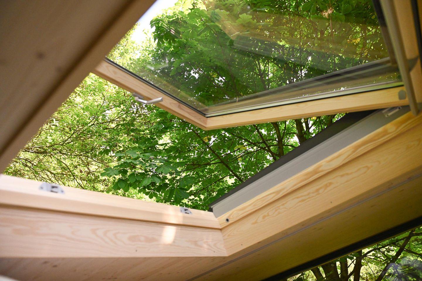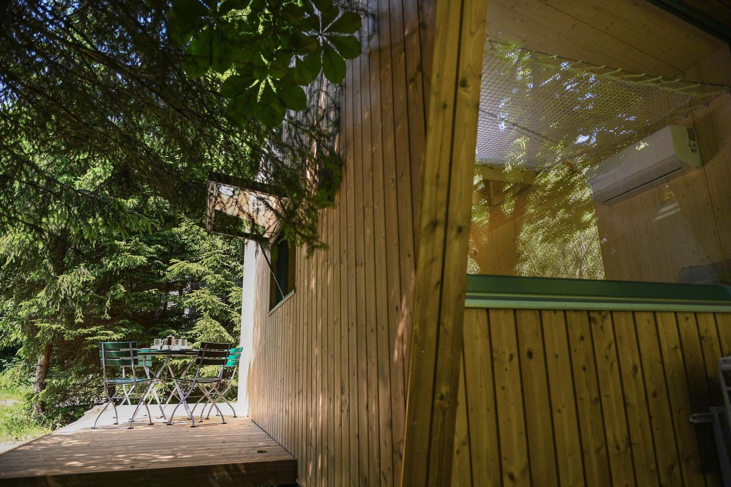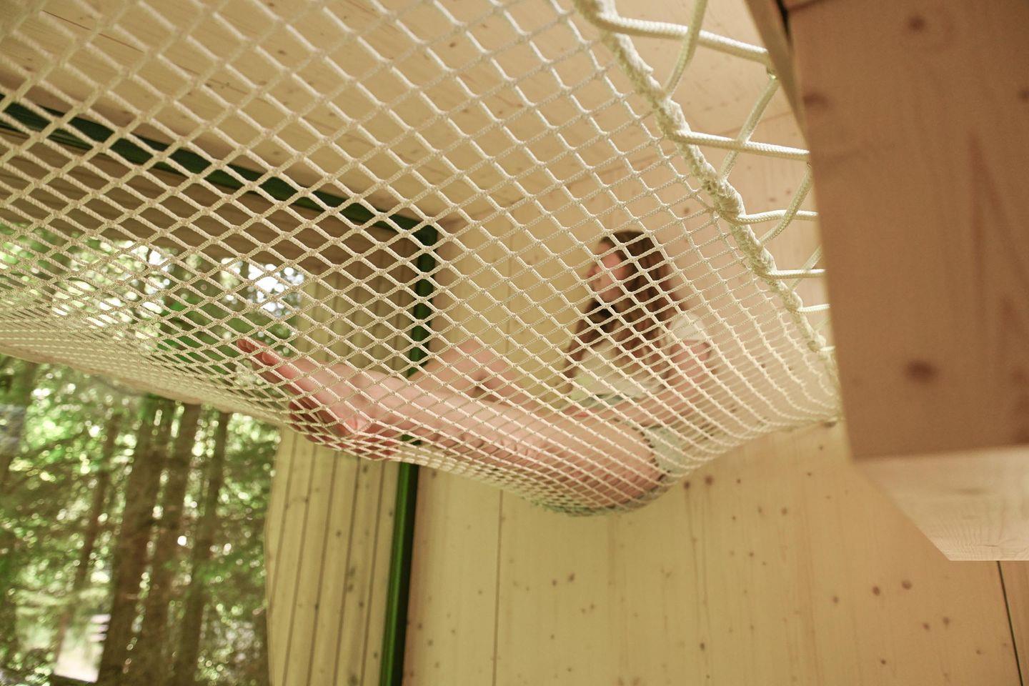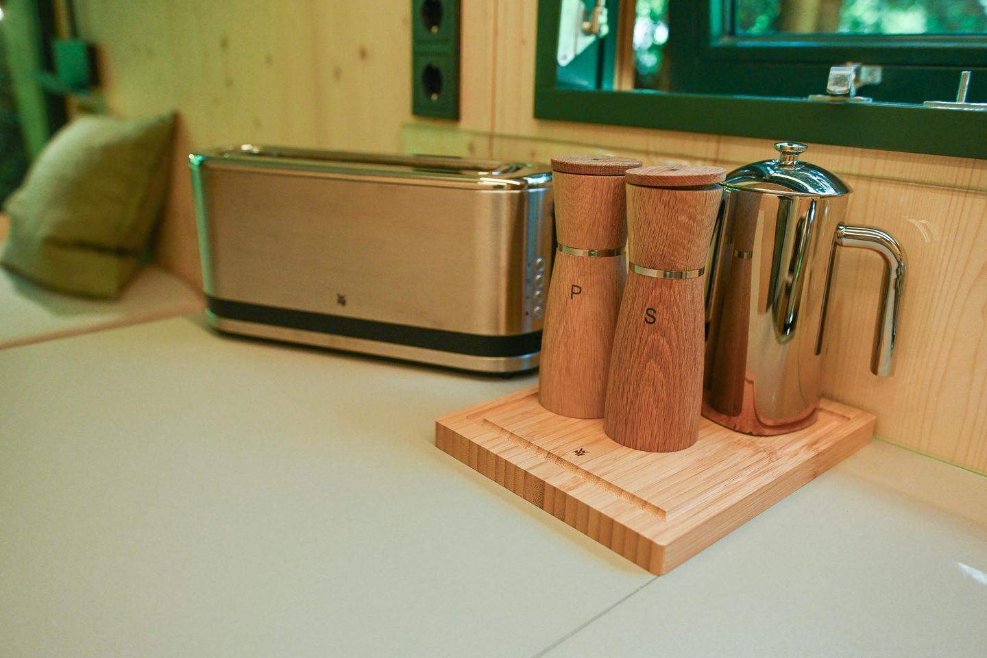 Die separate Schlafebene unter dem Dach erreichst du über eine kleine Treppe – mit gemütlichem Bett, Dachfenster, Verdunklungsmöglichkeiten und direktem Zugang zum Relax-Netz. Das Badezimmer ist klein, aber fein: Dusche, WC, Waschbecken, Spiegel und Fußbodenheizung sorgen für Komfort – auch an kühleren Tagen. Für dein Wohlgefühl liegen Handtücher aus nachhaltigen Materialien bereit.