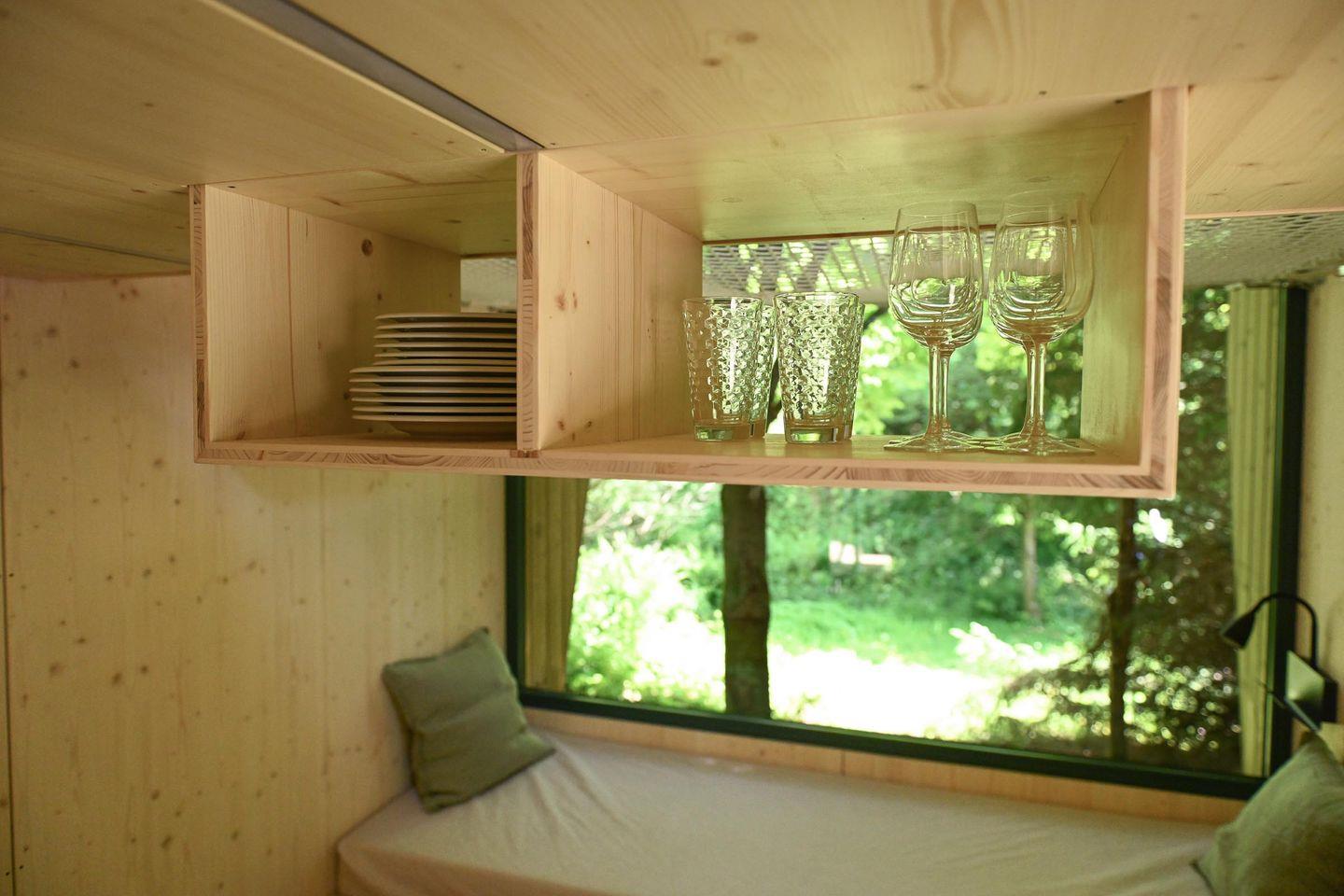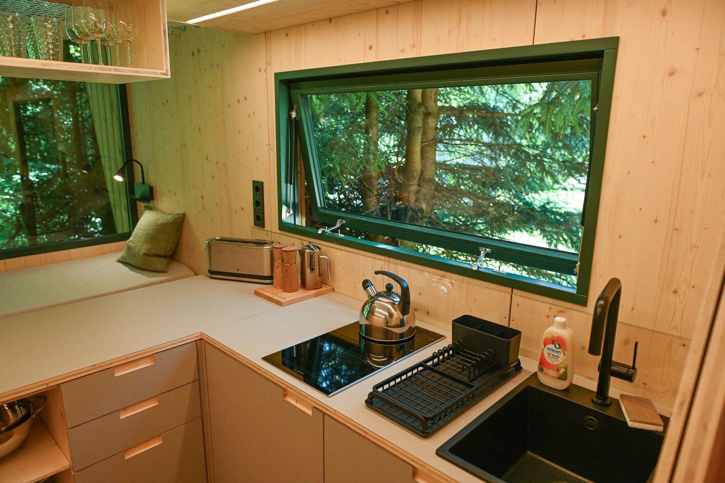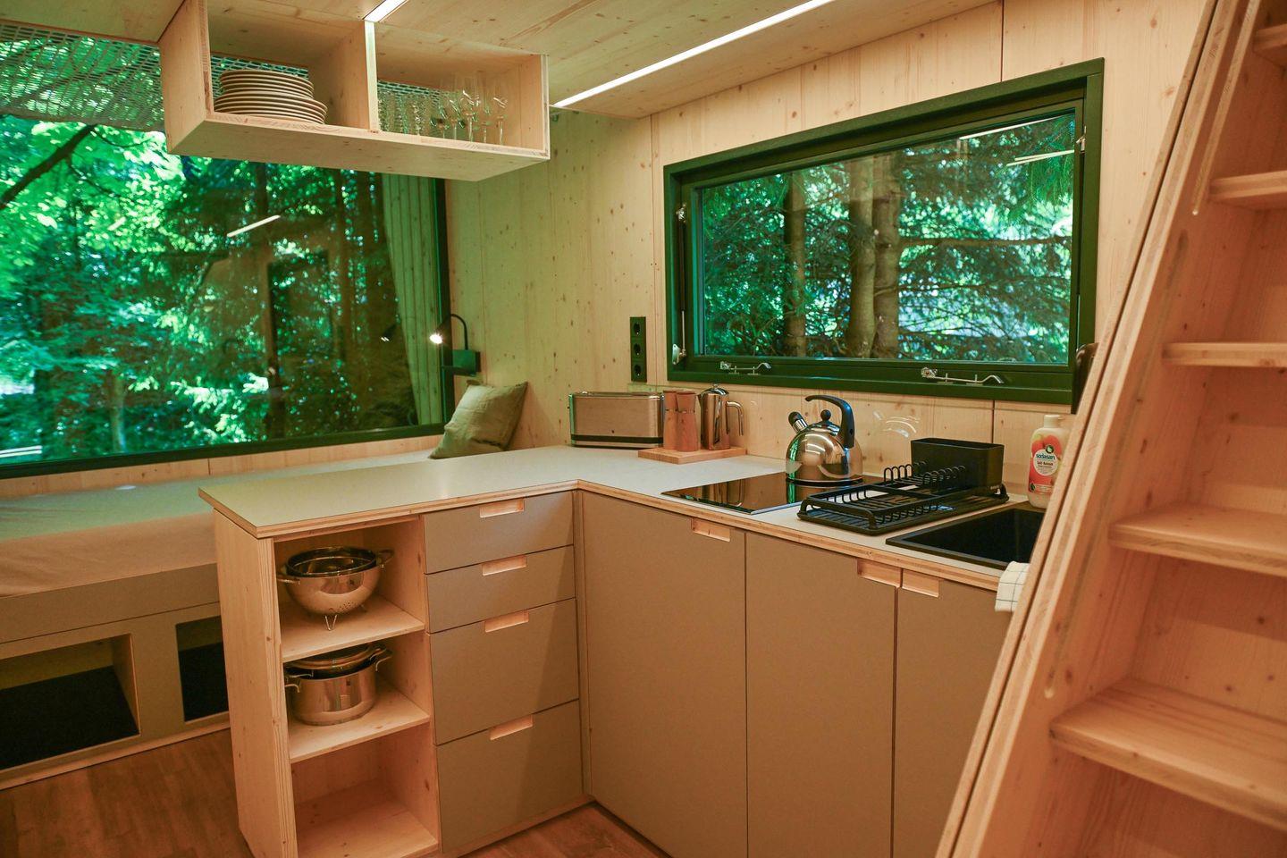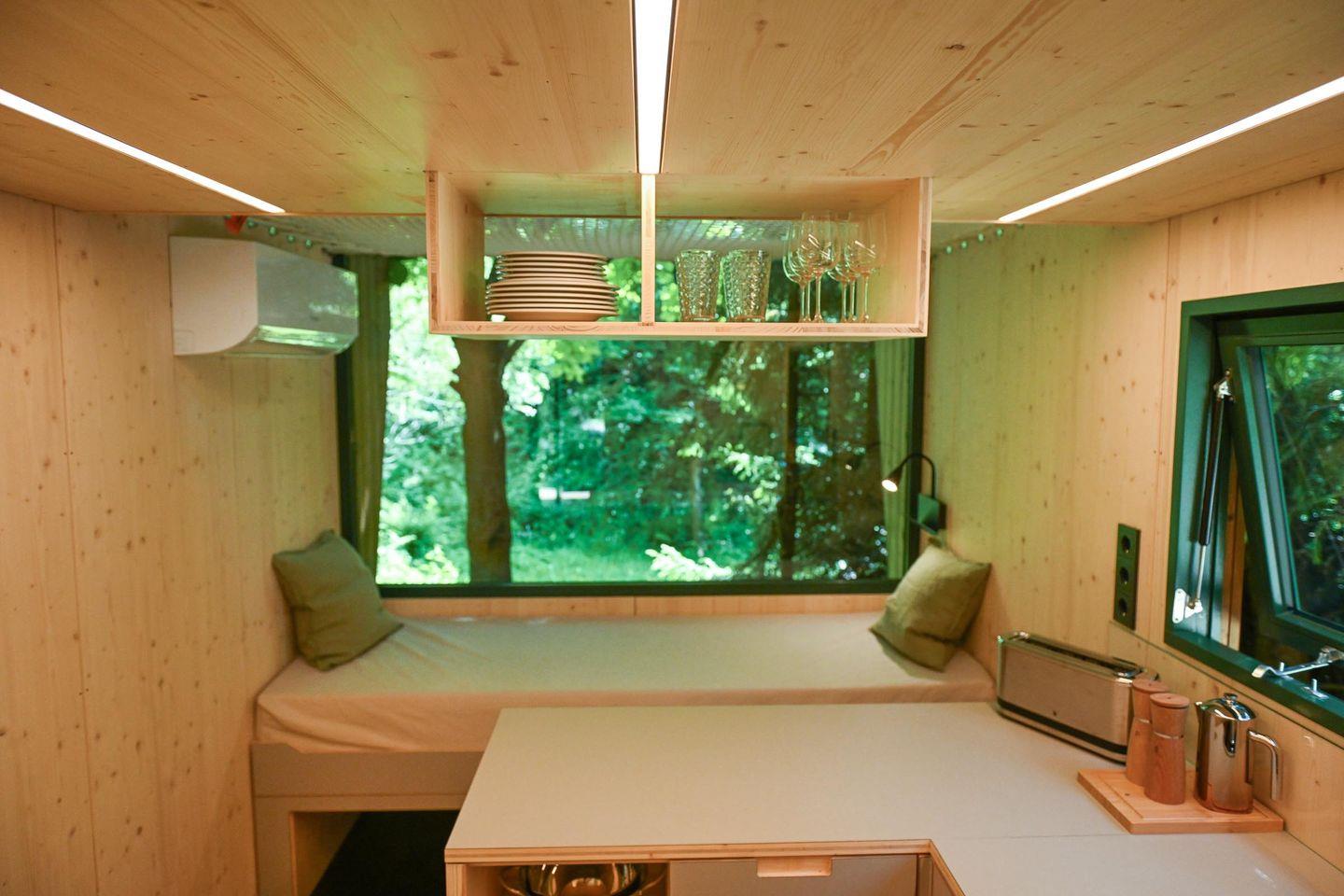 Innen erwartet dich ein durchdachtes Raumkonzept mit cleveren Stauraumlösungen, hochwertigem Holzfußboden und einer natürlichen Ausstattung. Das große Panoramafenster bringt die Natur direkt ins Haus. Tagsüber genießt du den Ausblick vom gemütlichen Sofa – abends wird es mit wenigen Handgriffen zum 1,40?m breiten Day Bed für zwei Gäste. Die Küche ist L-förmig, kompakt und gut ausgestattet – mit allem, was du für einfache, leckere Mahlzeiten brauchst.