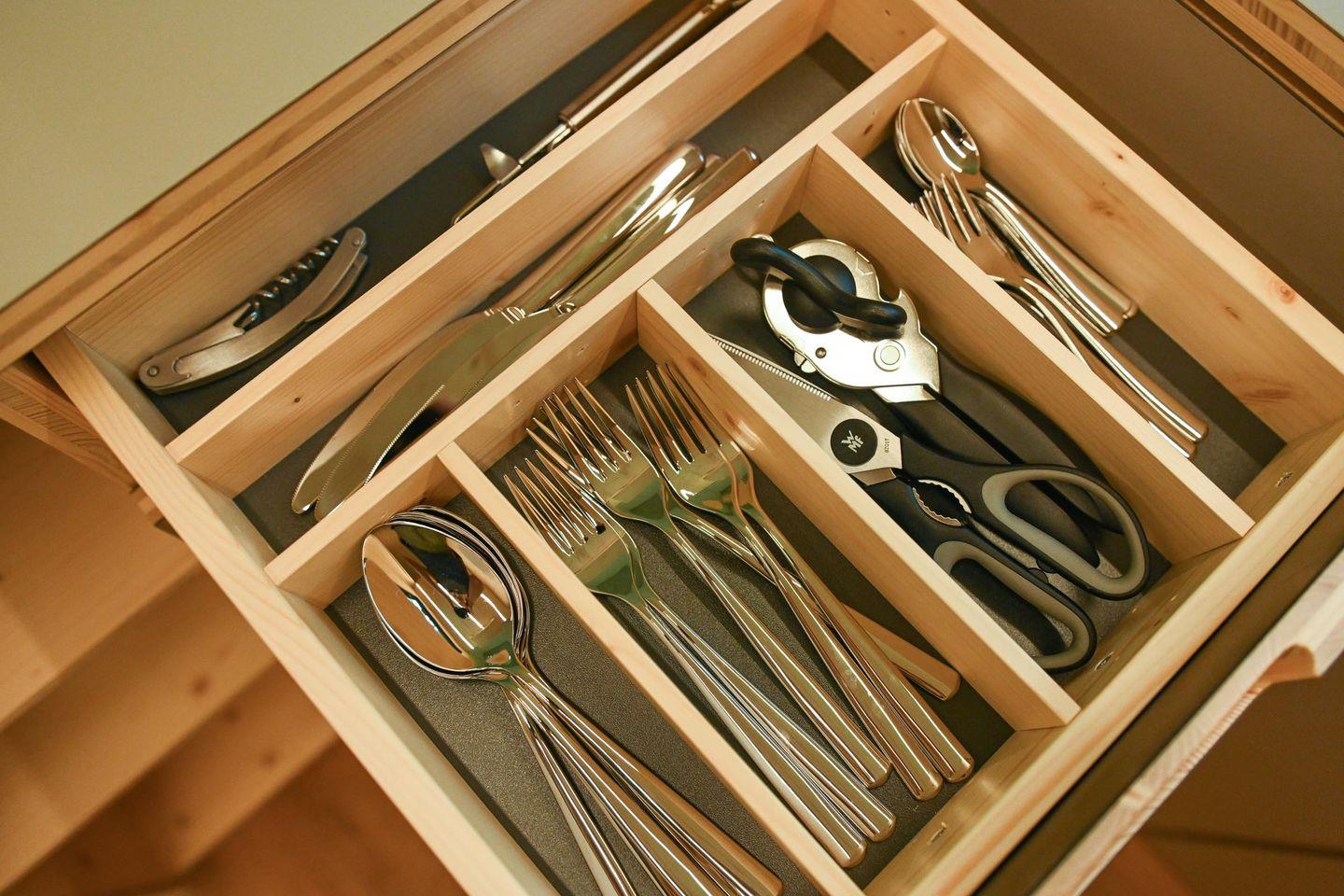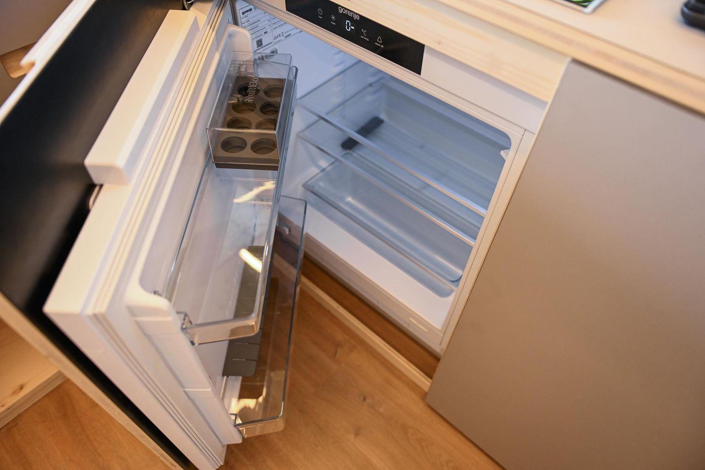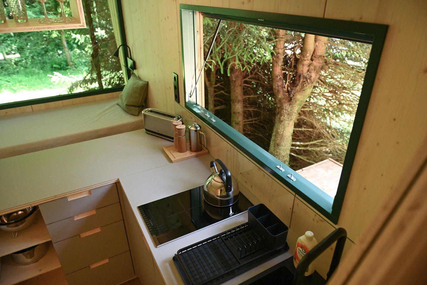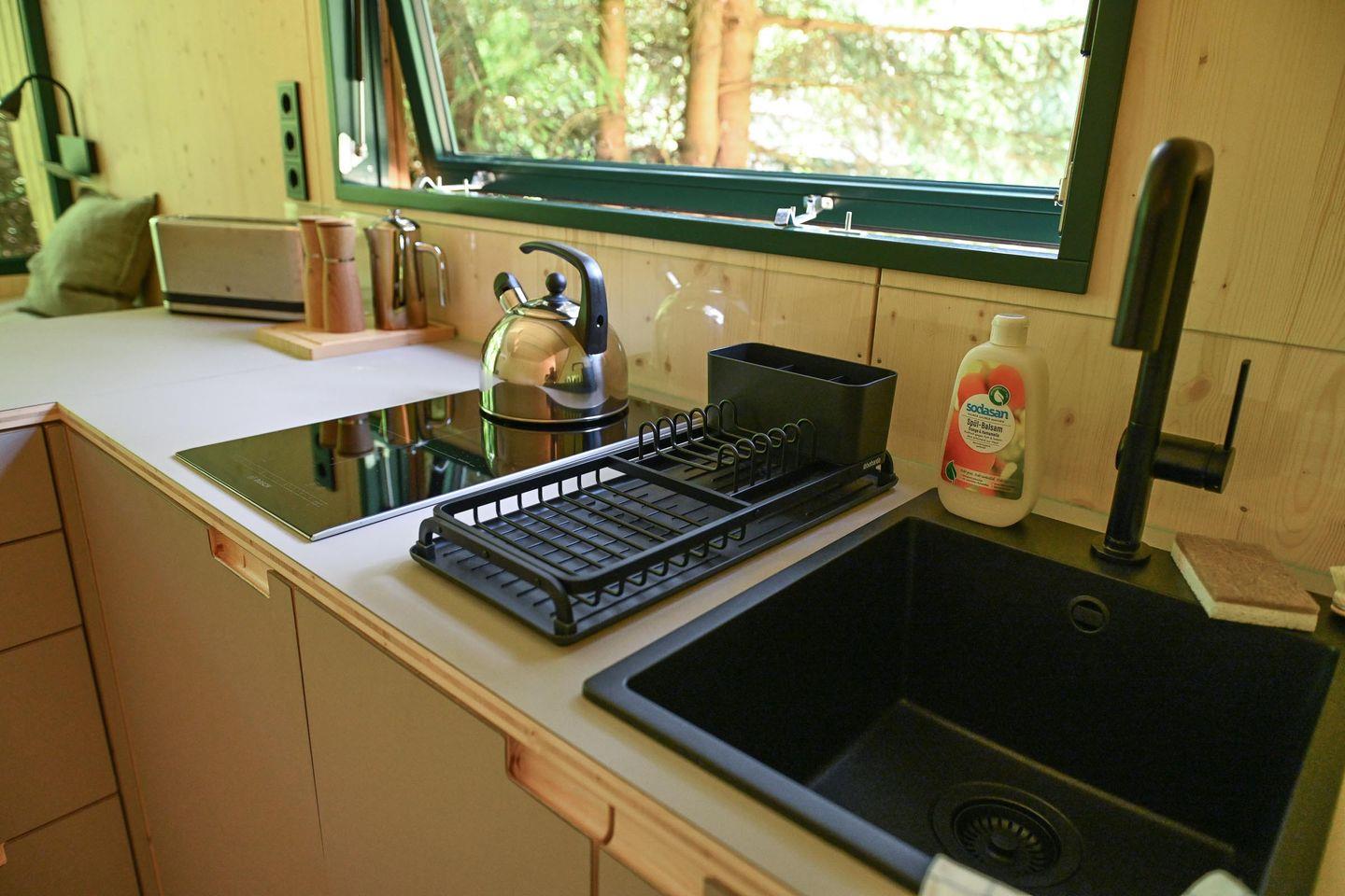 Innen erwartet dich ein durchdachtes Raumkonzept mit cleveren Stauraumlösungen, hochwertigem Holzfußboden und einer natürlichen Ausstattung. Das große Panoramafenster bringt die Natur direkt ins Haus. Tagsüber genießt du den Ausblick vom gemütlichen Sofa – abends wird es mit wenigen Handgriffen zum 1,40?m breiten Day Bed für zwei Gäste. Die Küche ist L-förmig, kompakt und gut ausgestattet – mit allem, was du für einfache, leckere Mahlzeiten brauchst.