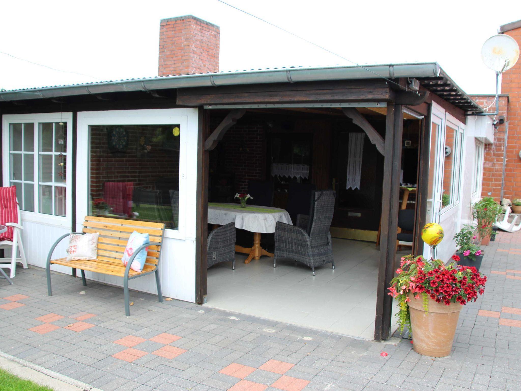 Eine Terrasse /Garten mit Gartenmöbeln Spielbereich und Pool lädt zum Verweilen ein.