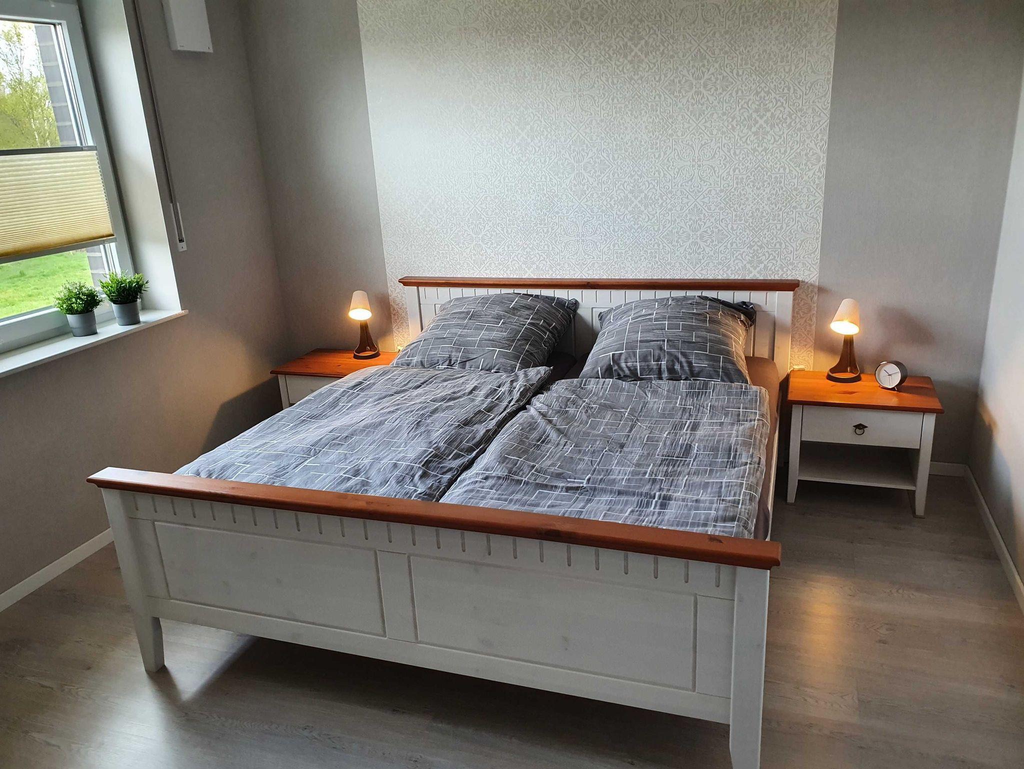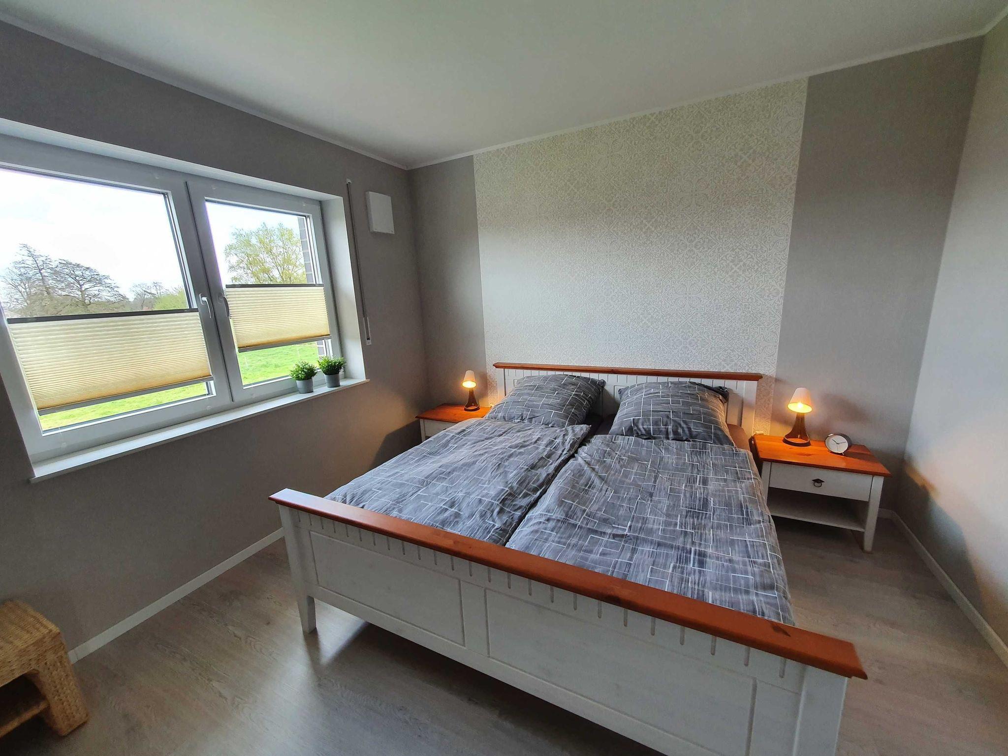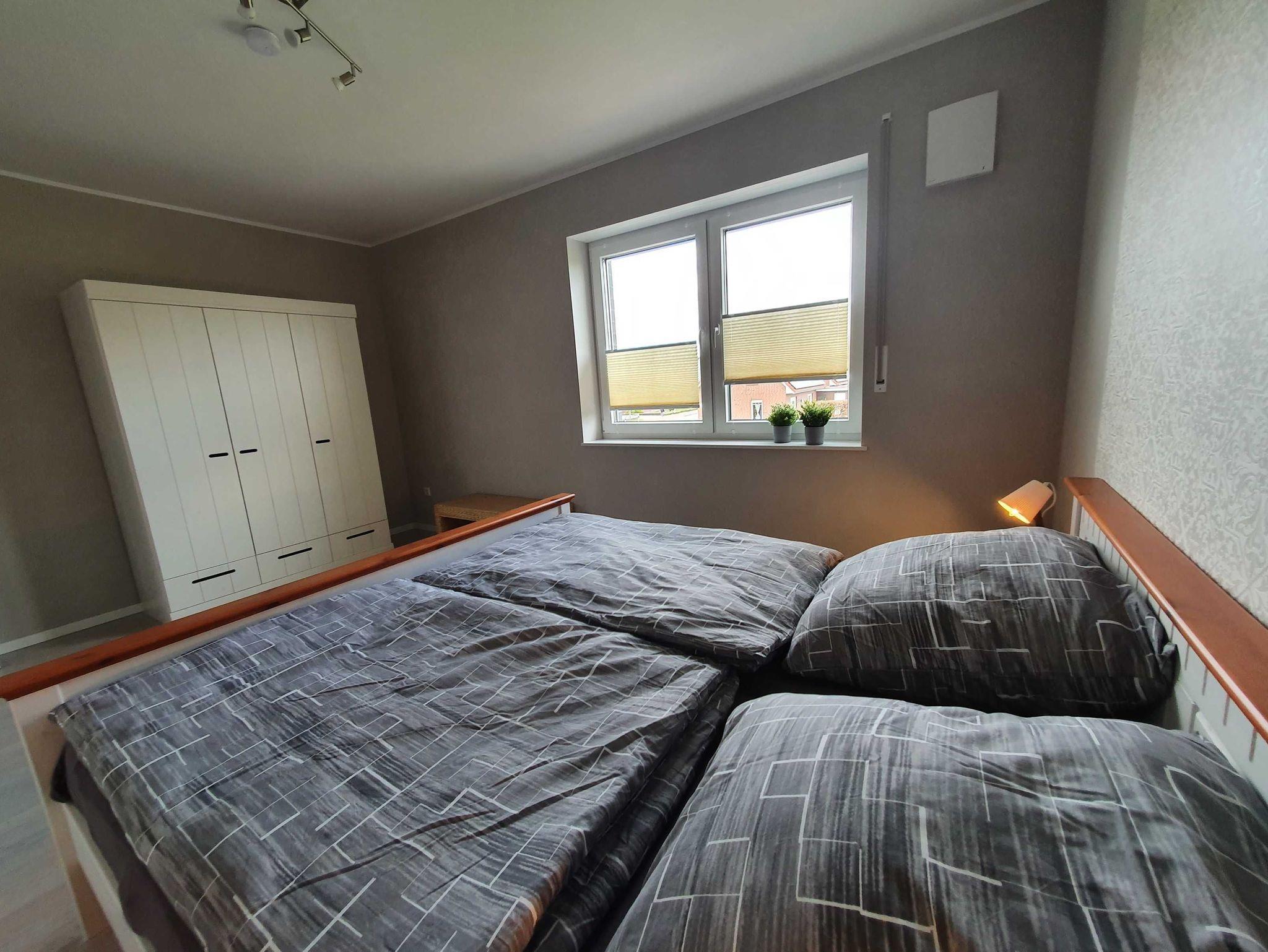 Standard eingerichteten 2-Zimmer-Oberwohnung mit einem Schlafzimmer mit Doppelbett und einem großen Wohnzimmer in dem sich noch eine Schlafsofa befindet.