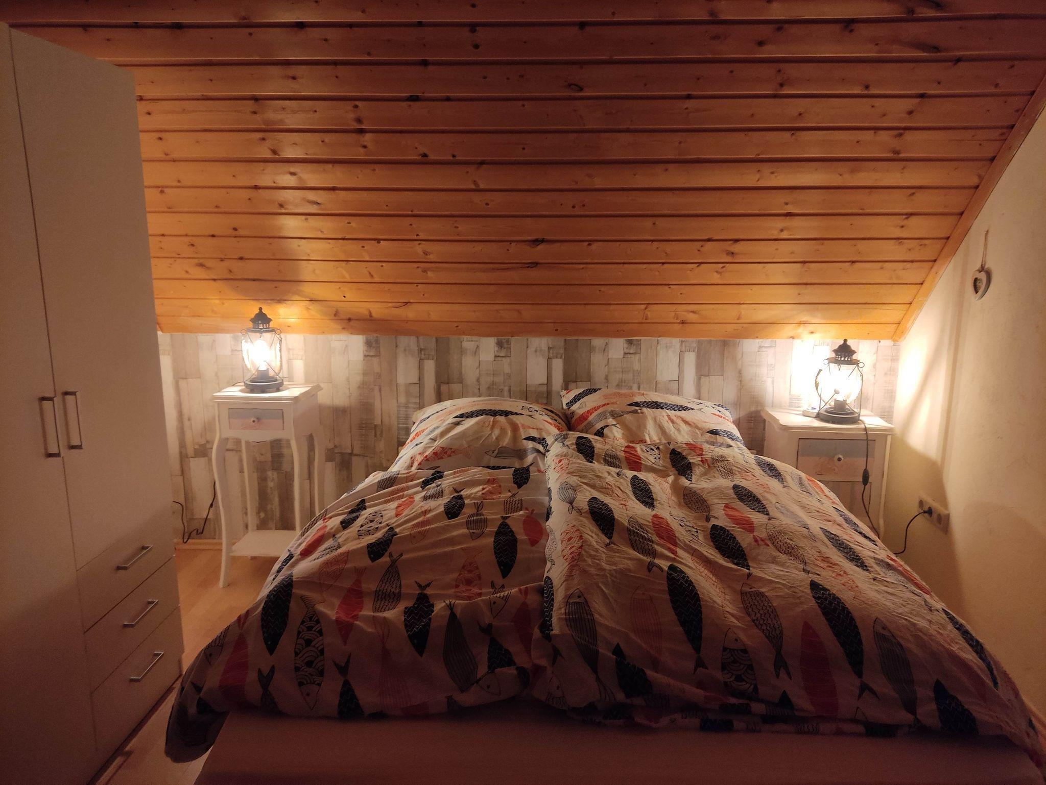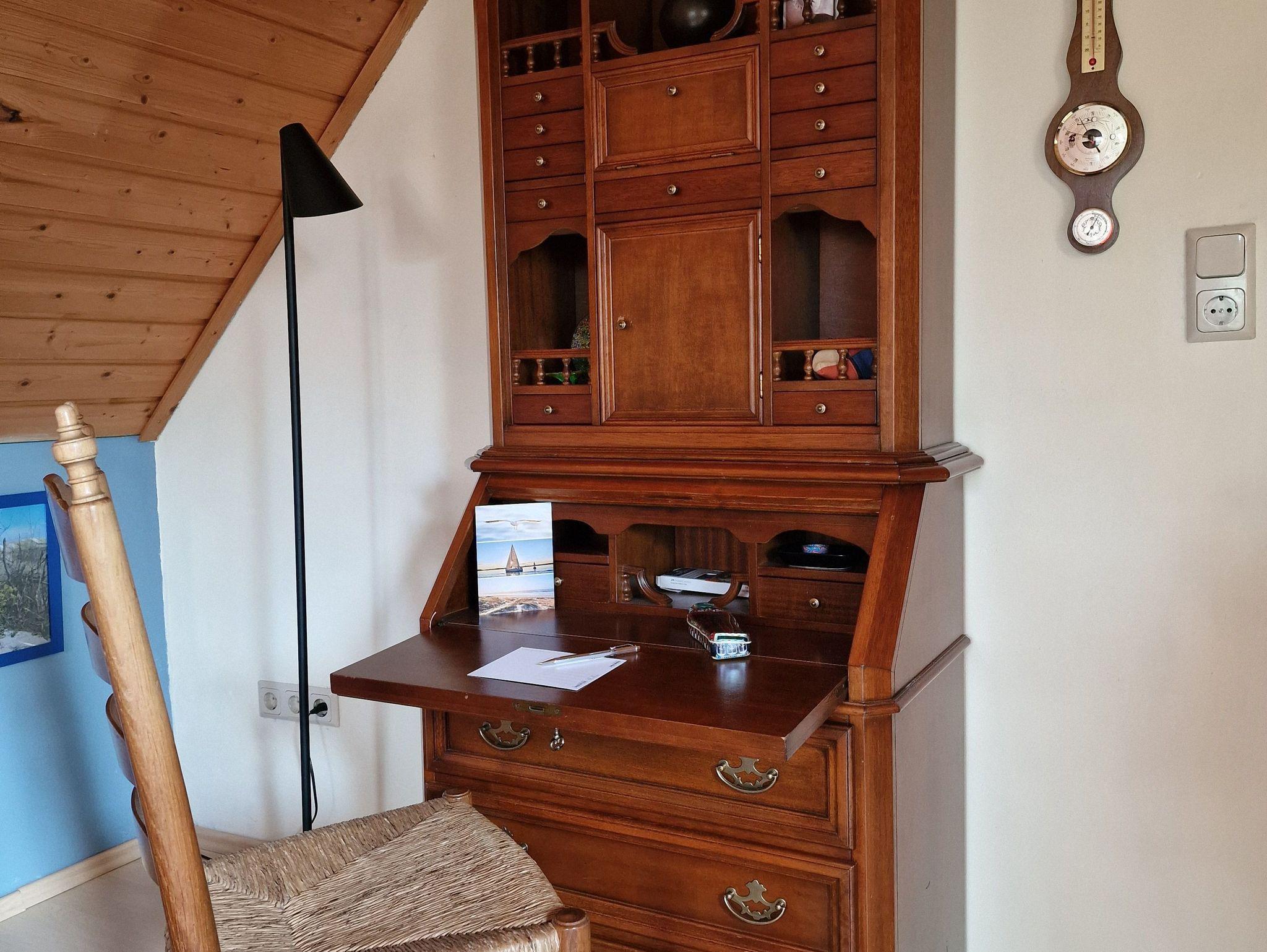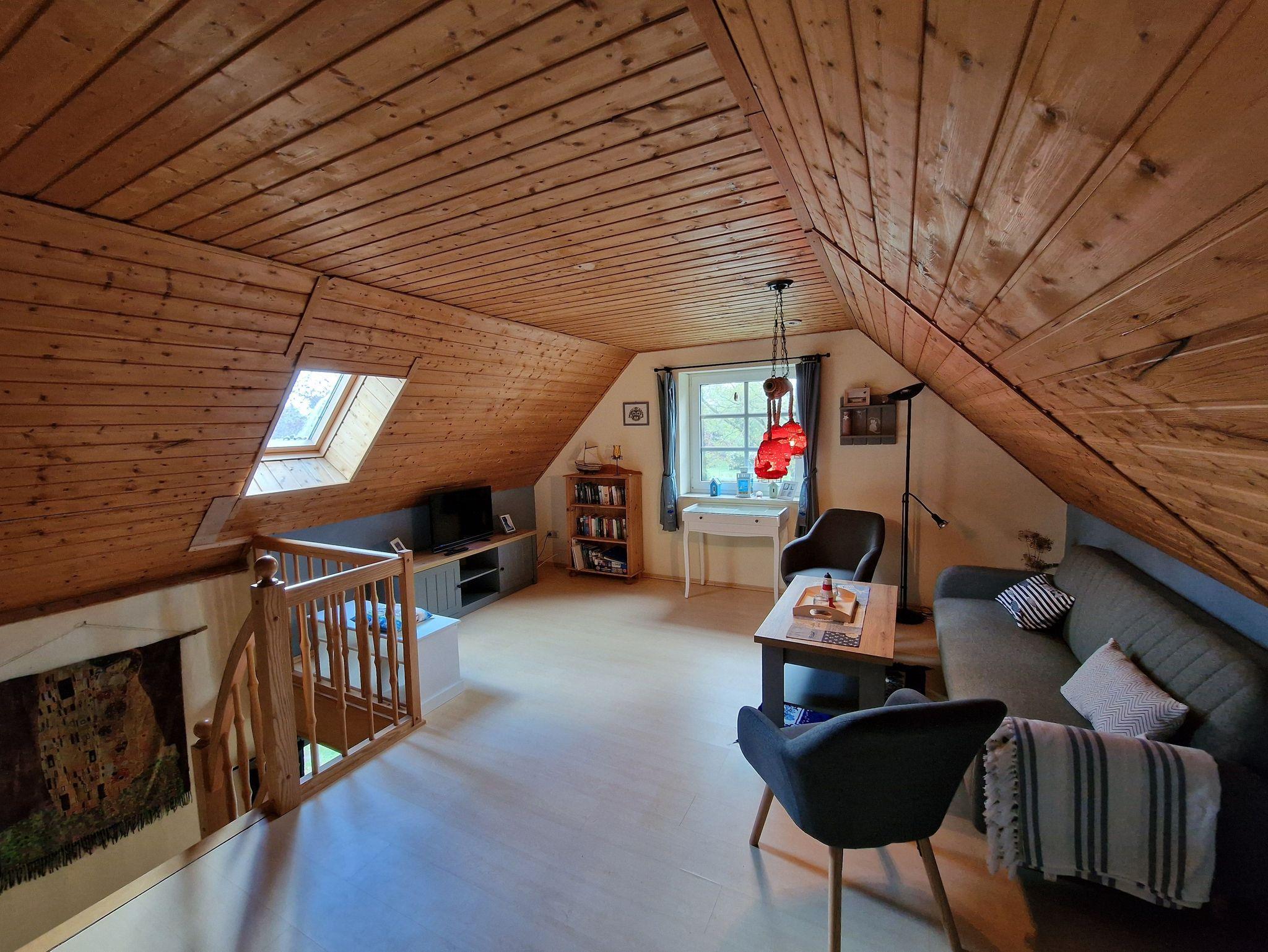 Das großzügige Esszimmer ist mit einem Esstisch mit 4 Stühlen, einer weiteren Sitzecke, Schränken und Regalen ausgestattet. In der oberen Etage befindet sich ein Schlafzimmer mit Doppelbett und zwei Nachtschränken, einem Kleiderschrank, einer Truhe und einem großem Spiegel.