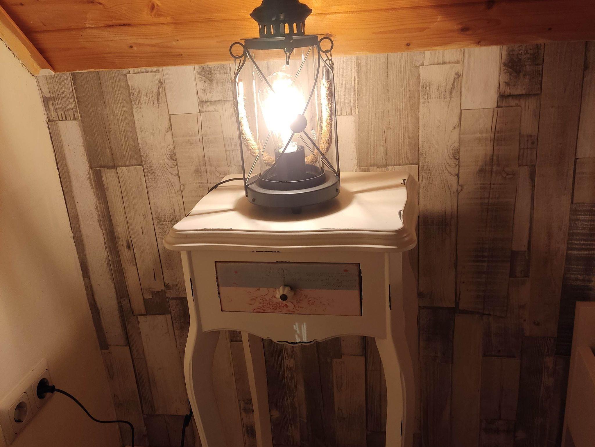 Im unteren Geschoss gibt es ein Tageslicht-Badezimmer mit Dusche, WC und Waschbecken. Die kleine Küche verfügt über Elektrogeräte wie Kühlschrank, Kaffeemaschine, Toaster, Wasserkocher, Herd, Minibackofen und eine kleine Sitzecke.