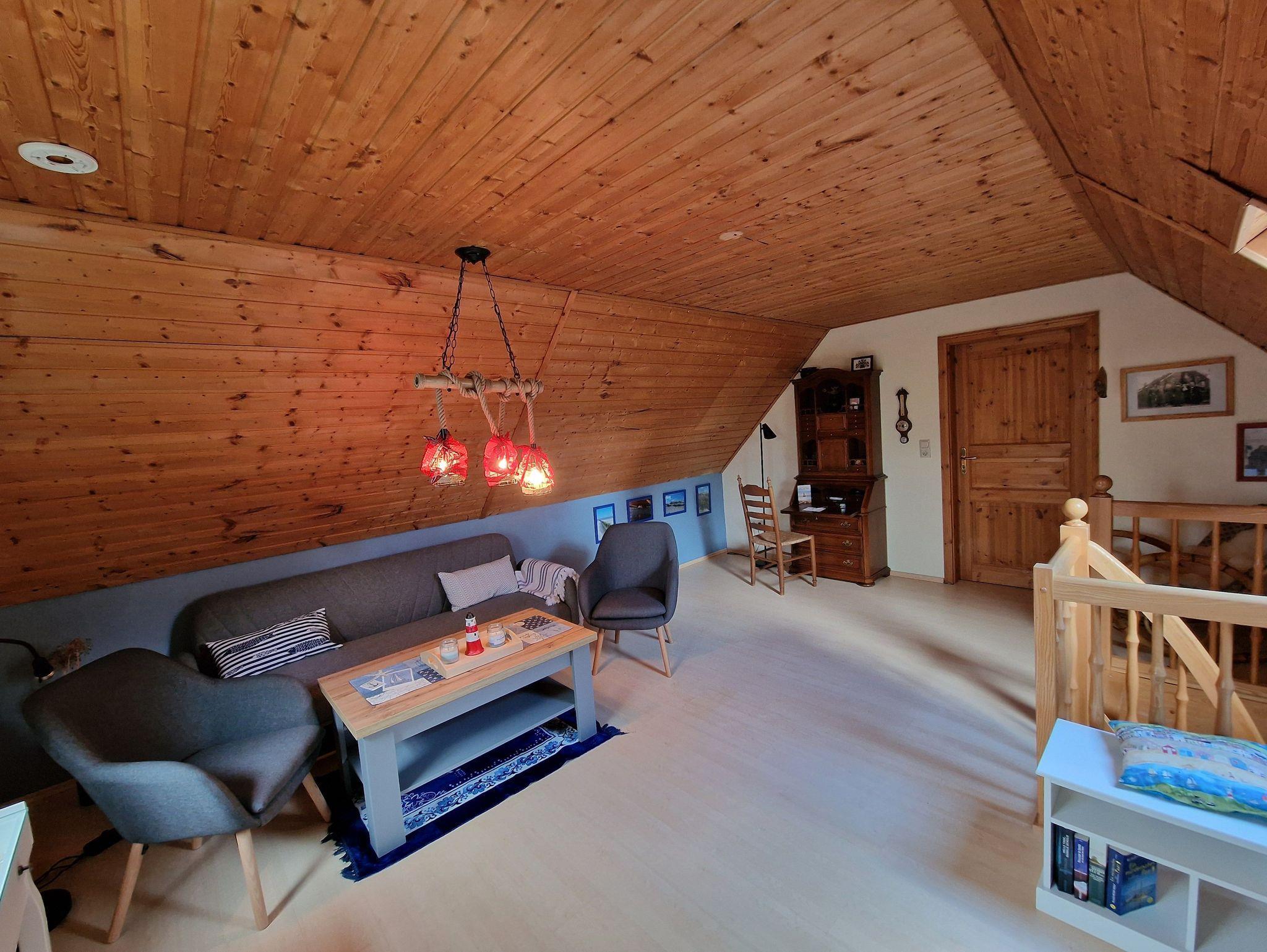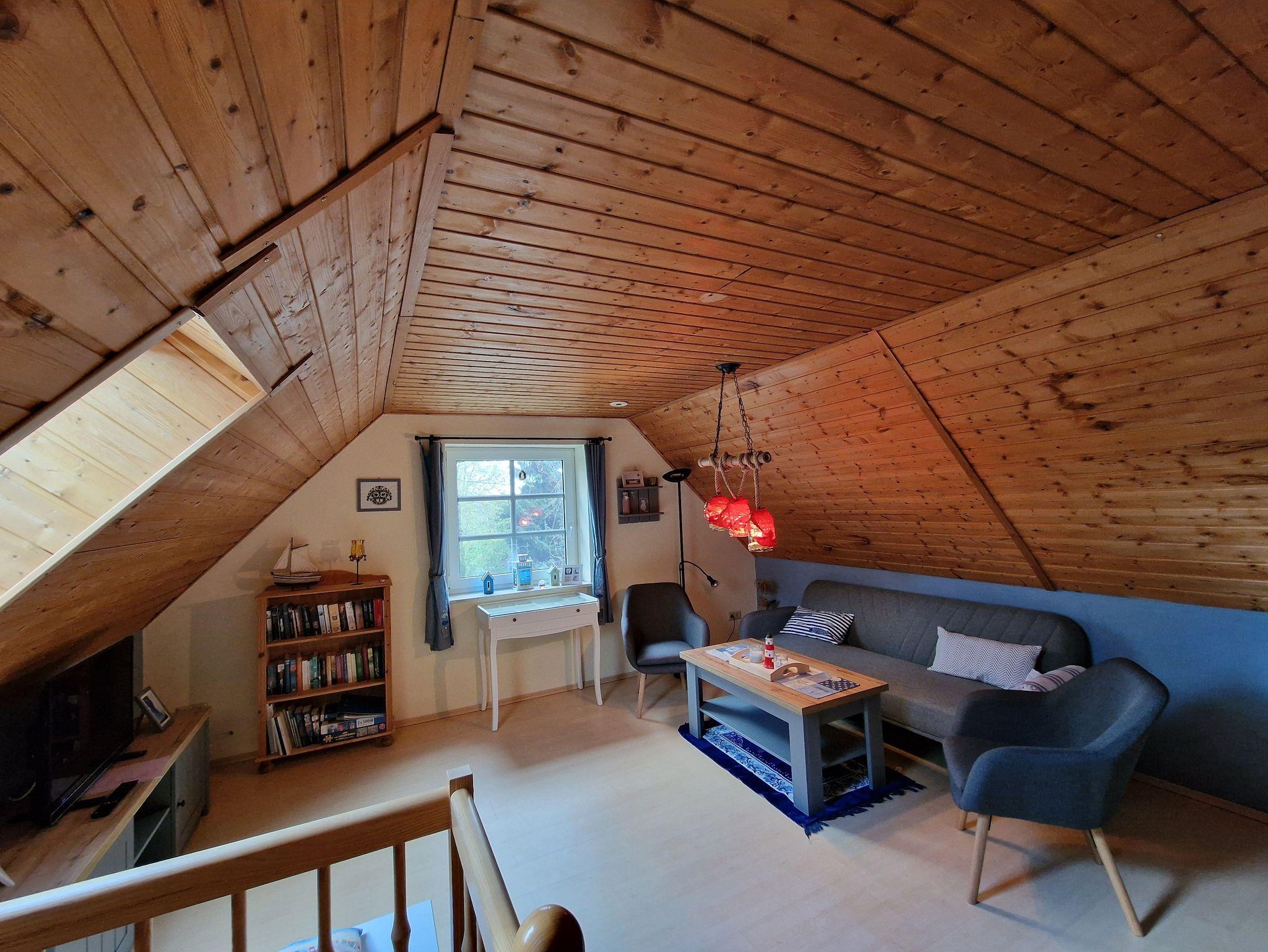 Das Wohnzimmer enthält ein Sofa (umwandelbar zum Schlafsofa), zwei Sessel, einen Couchtisch, eine TV Bank mit Fernseher, einen Schaukelstuhl, einen Schreibsekretär mit Stuhl.