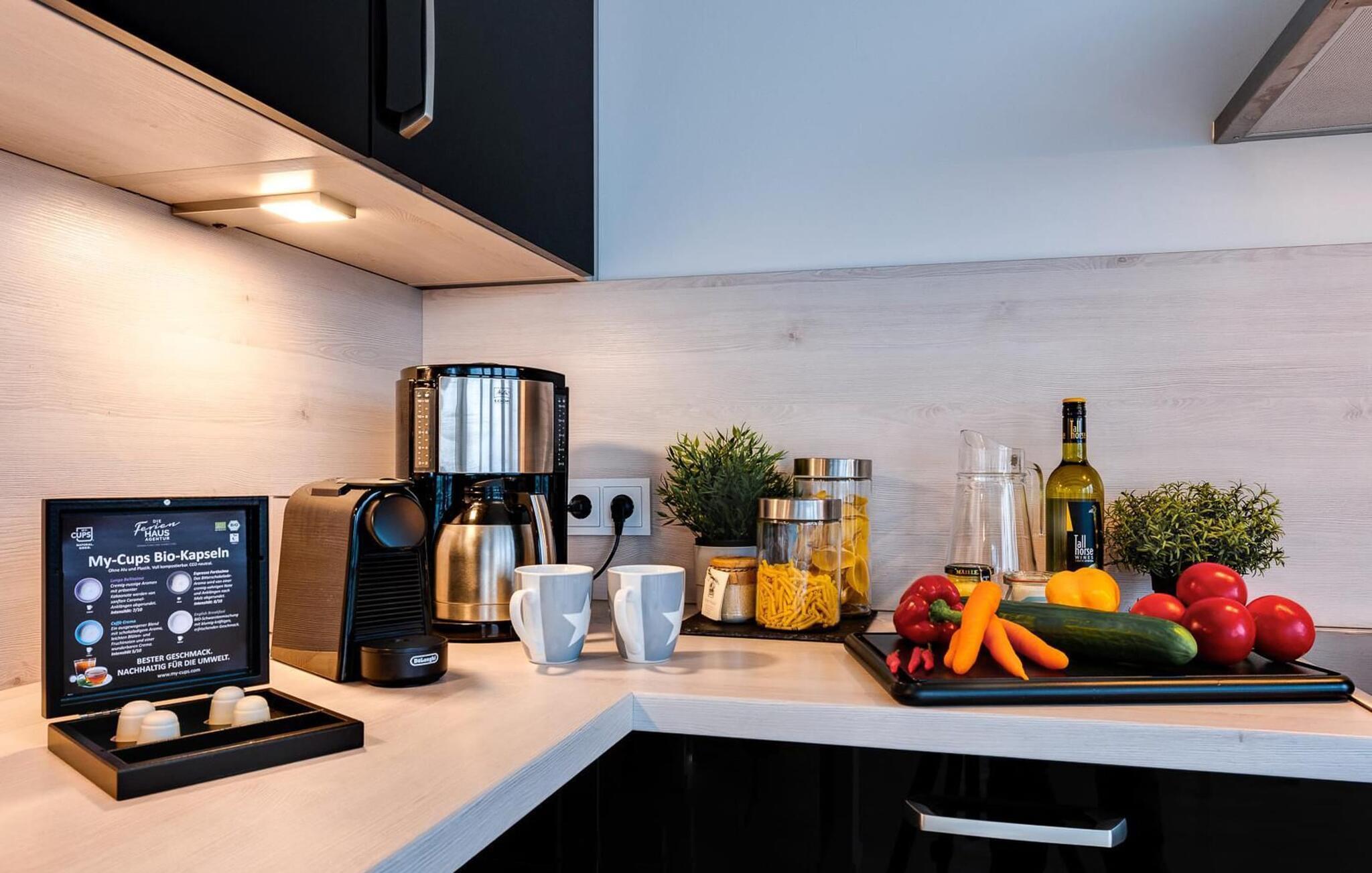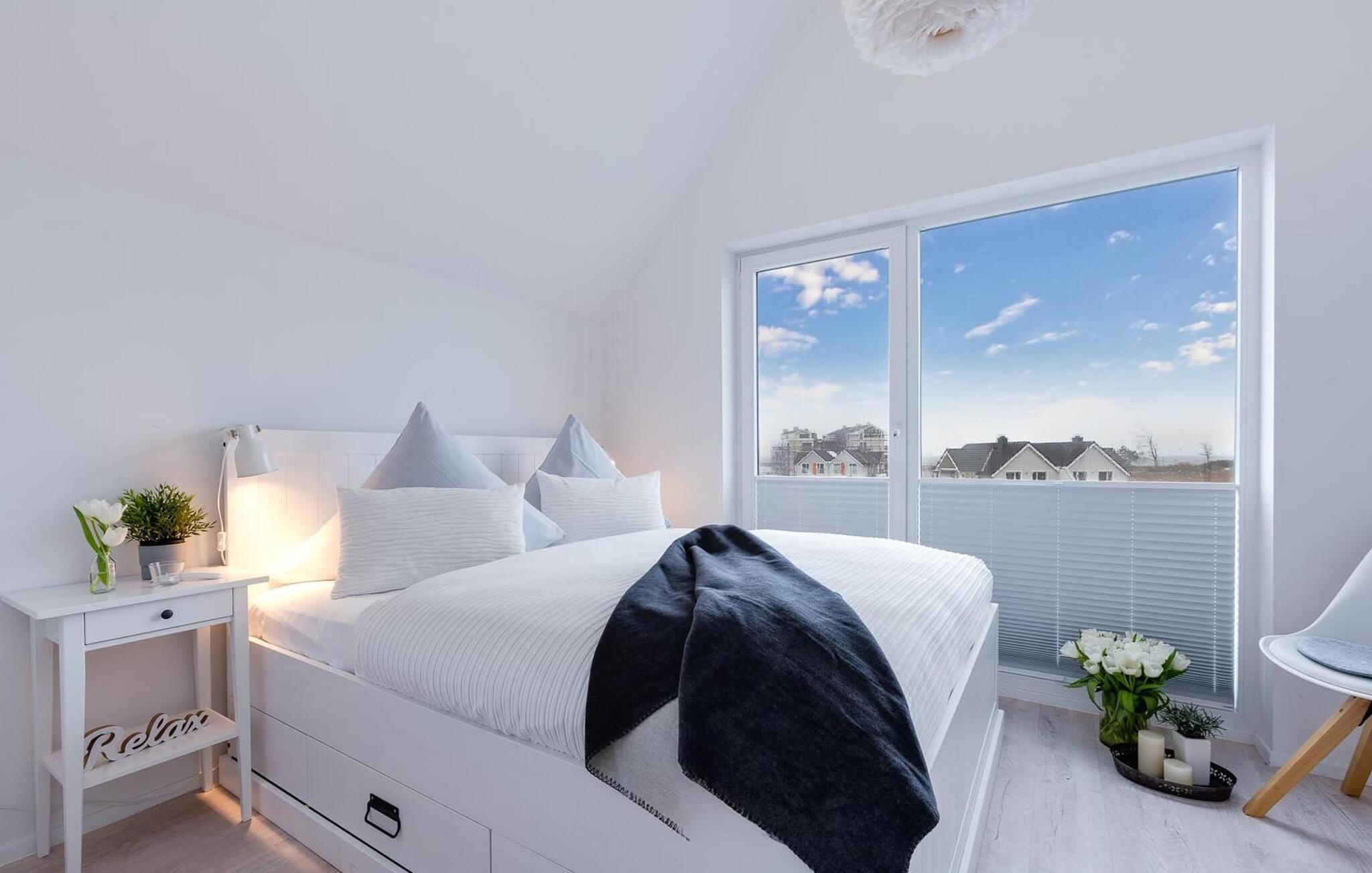 Ferielejlighedens opholds-/spisestue er oversvømmet med lys og har panoramavindue fra gulv til loft mod de tilstødende terrasser på begge sider. En fantastisk udsigt åbner op på terrassen ved siden af spisepladsen med udsigt over sejler- og sportsbådhavnen i OstseeResort Olpenitz. Havnebiograf og romantiske solnedgange er garanteret, og I kan også slappe af her med en god bog.