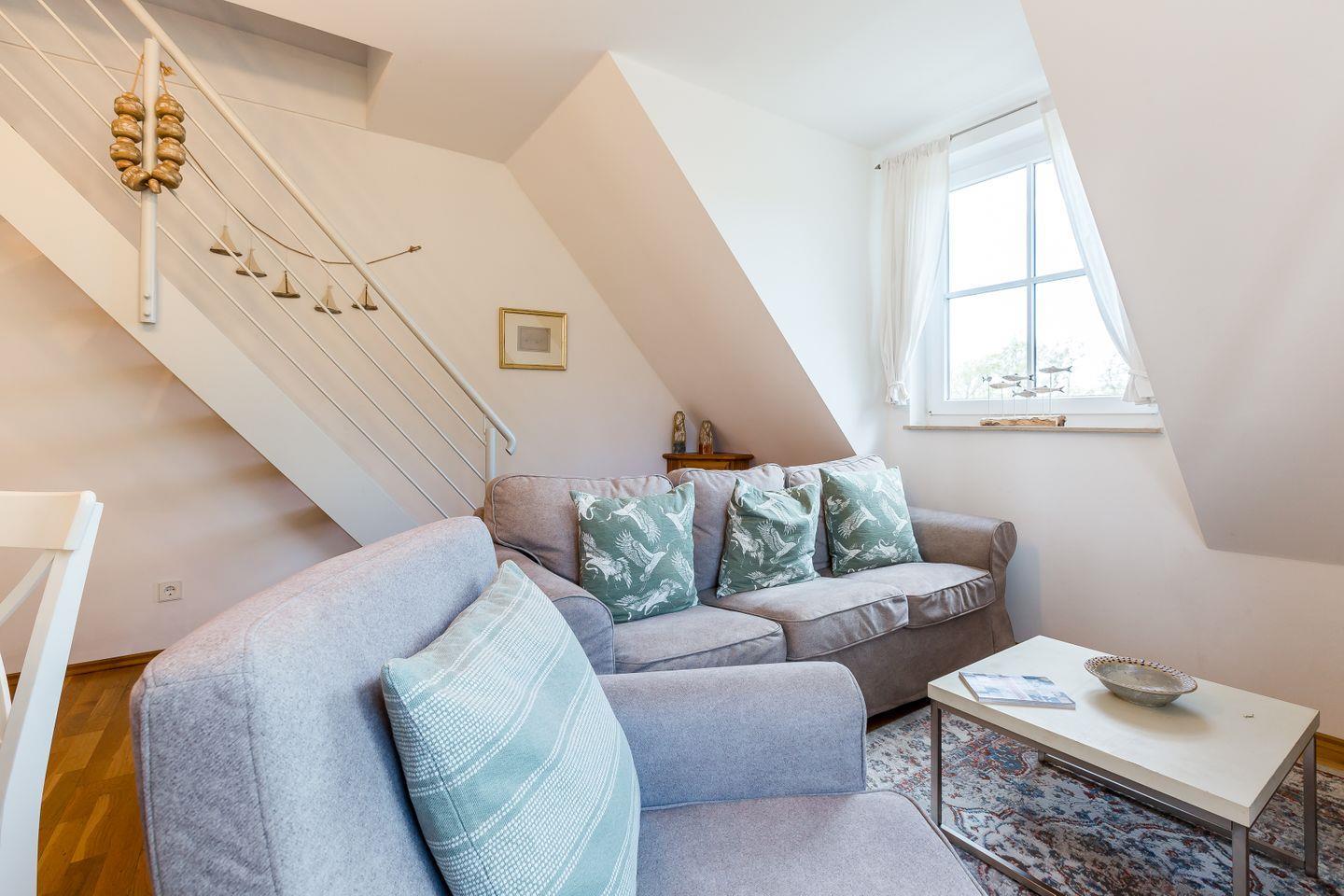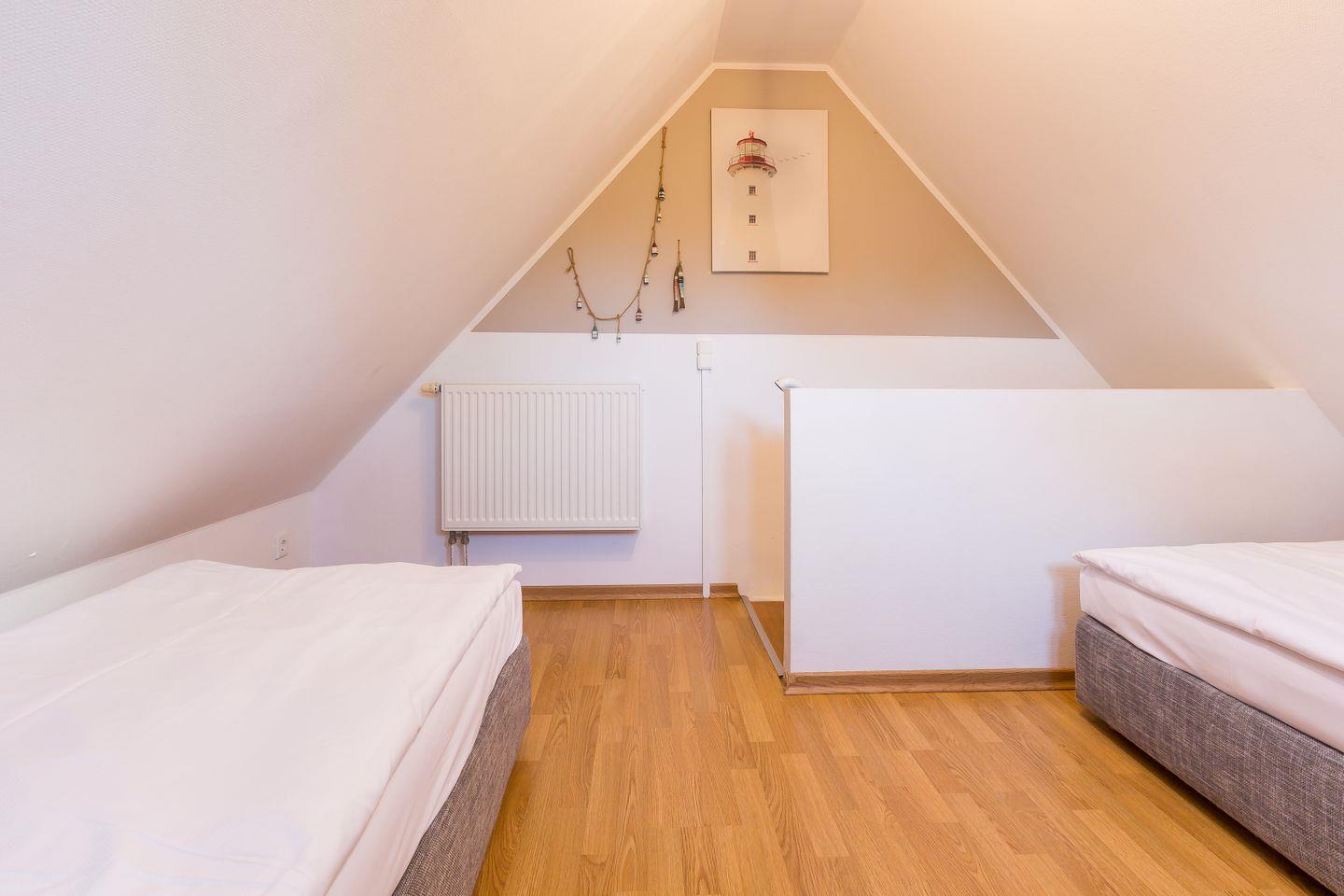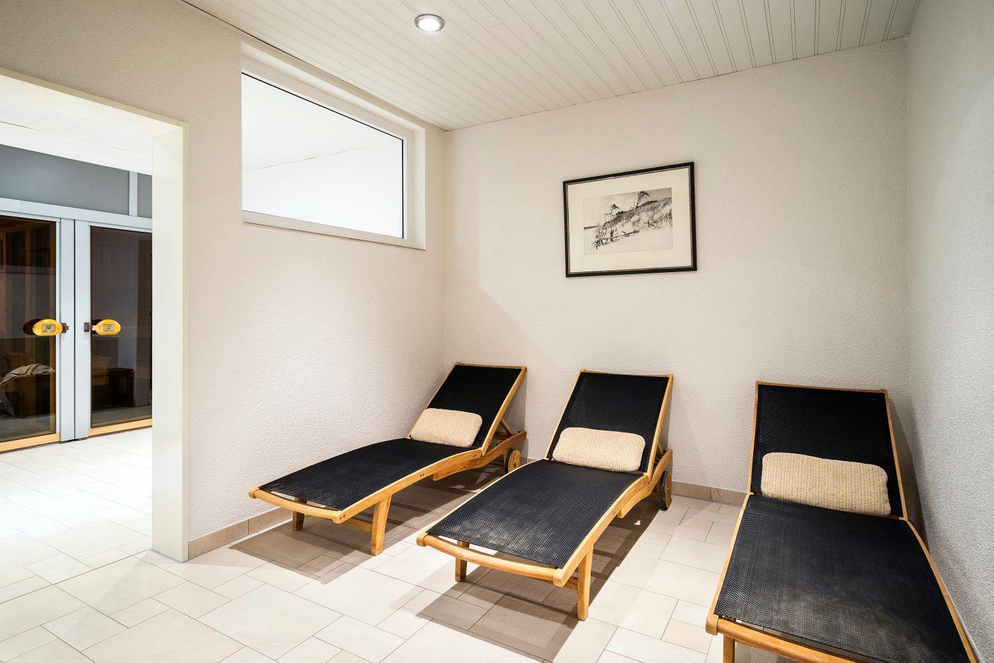 Im Obergeschoss befinden sich der Wohnbereich mit gemütlicher Sitz- und Essecke, eine offene Küchenzeile, ein Schlafzimmer mit Doppelbett (180x200 cm) und ein Bad mit Dusche/WC. Im Dachgeschoss befindet sich ein offenes zweites Schlafzimmer mit zwei Einzelbetten. Im Preis inklusive ist die Nutzung des Wellnessbereiches im Untergeschoss. Hier befinden sich ein Schwimmbad, eine Saunalandschaft, ein Ruheraum sowie Kneippfußbäder und Massageduschen.