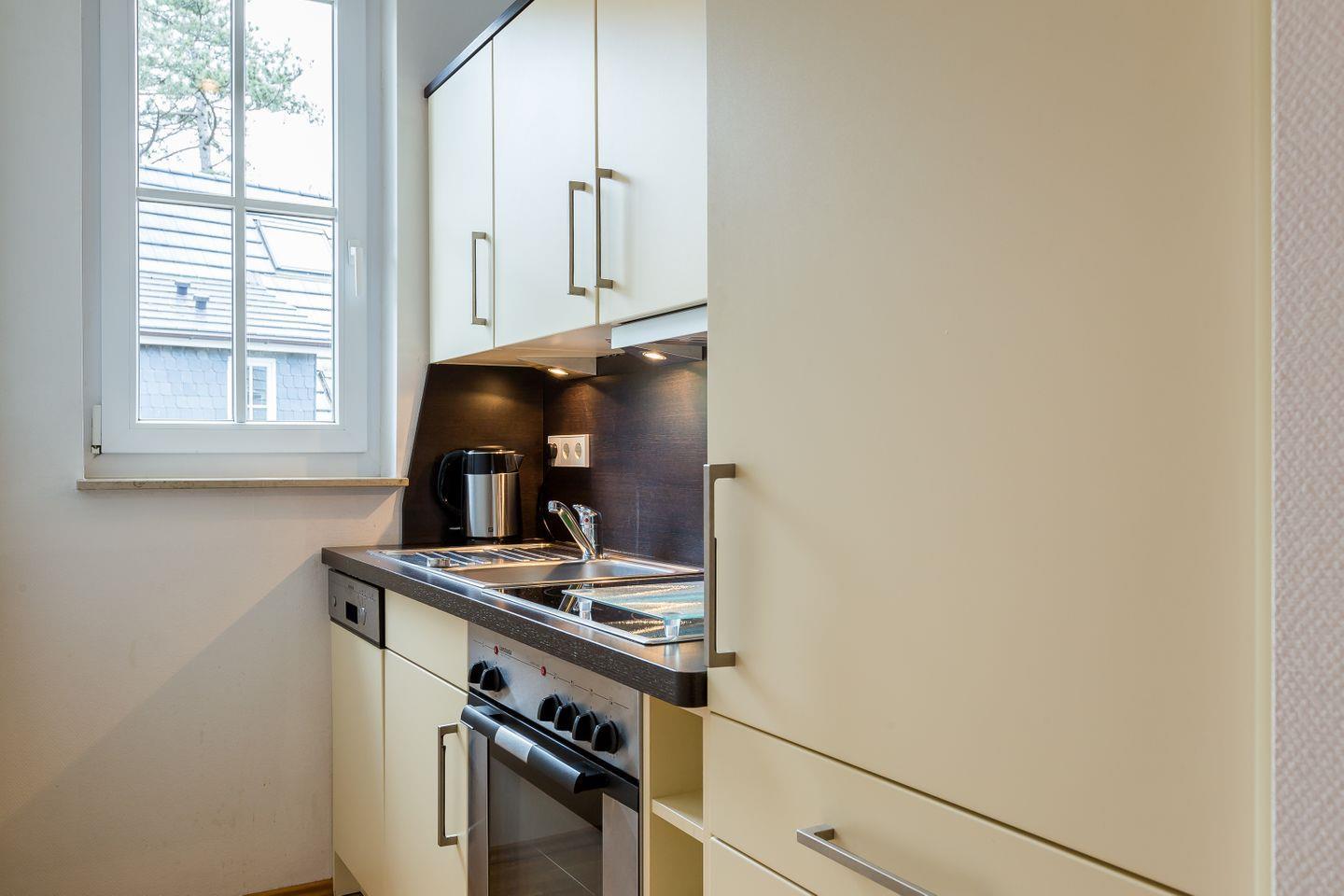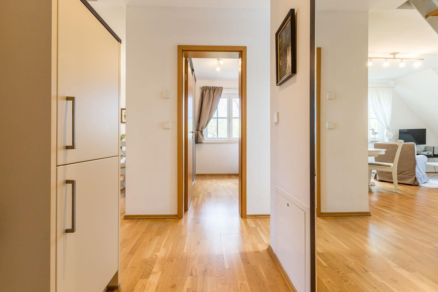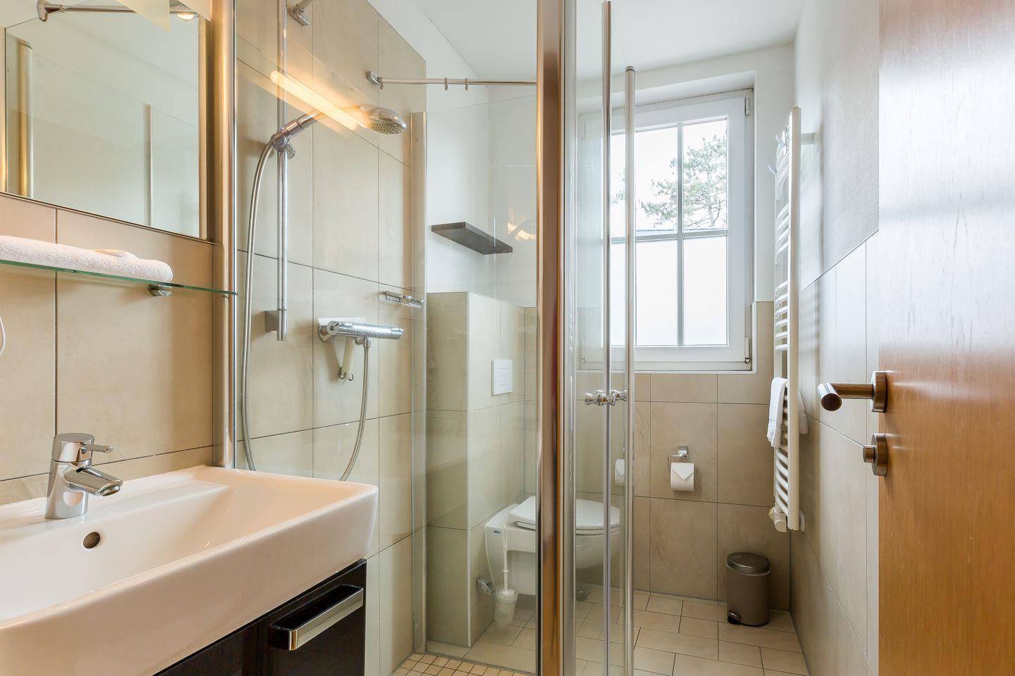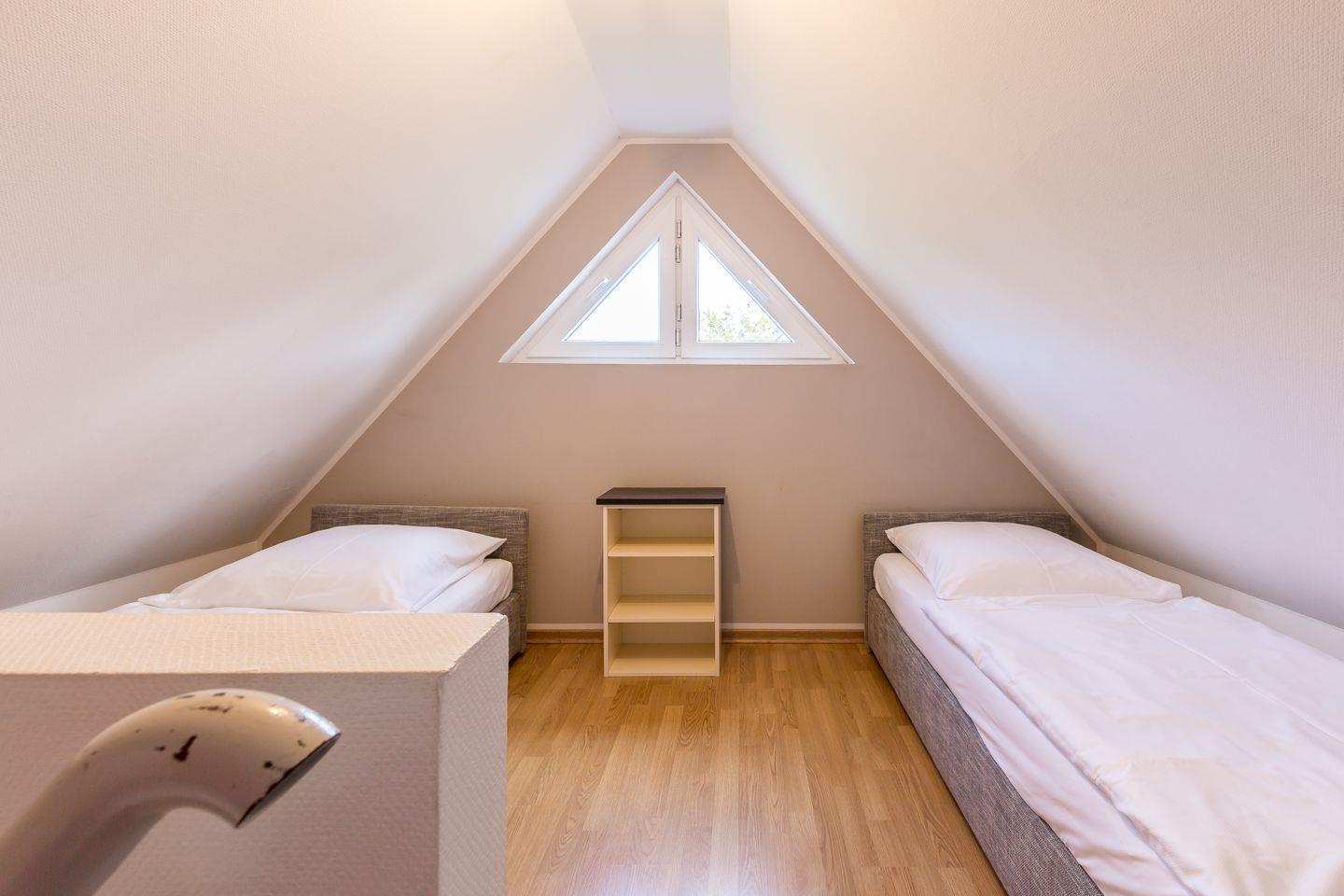 Im Obergeschoss befinden sich der Wohnbereich mit gemütlicher Sitz- und Essecke, eine offene Küchenzeile, ein Schlafzimmer mit Doppelbett (180x200 cm) und ein Bad mit Dusche/WC. Im Dachgeschoss befindet sich ein offenes zweites Schlafzimmer mit zwei Einzelbetten. Im Preis inklusive ist die Nutzung des Wellnessbereiches im Untergeschoss. Hier befinden sich ein Schwimmbad, eine Saunalandschaft, ein Ruheraum sowie Kneippfußbäder und Massageduschen.