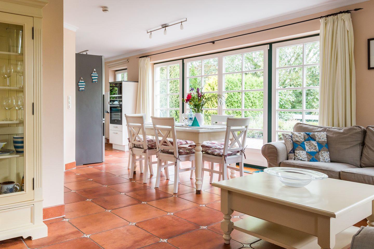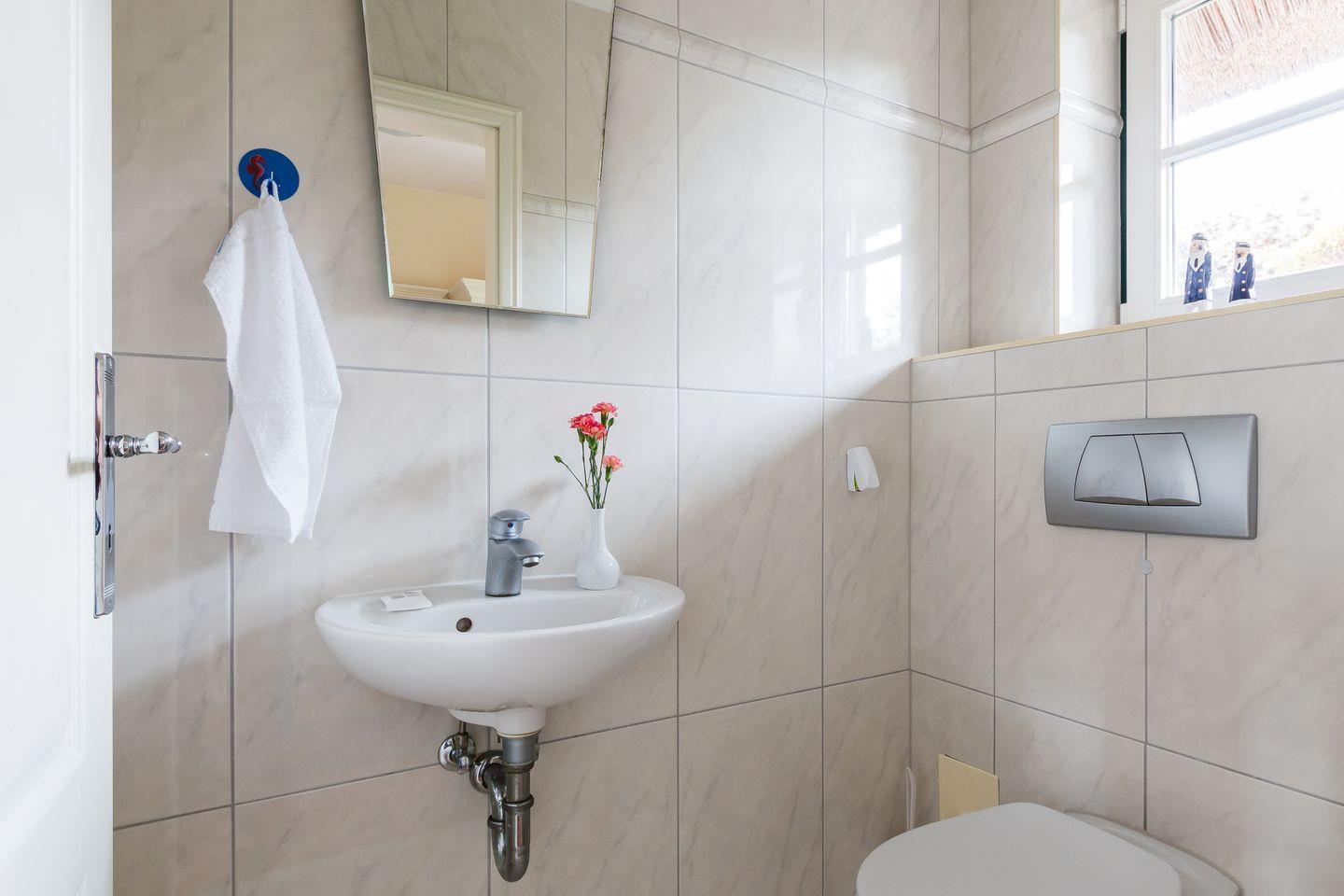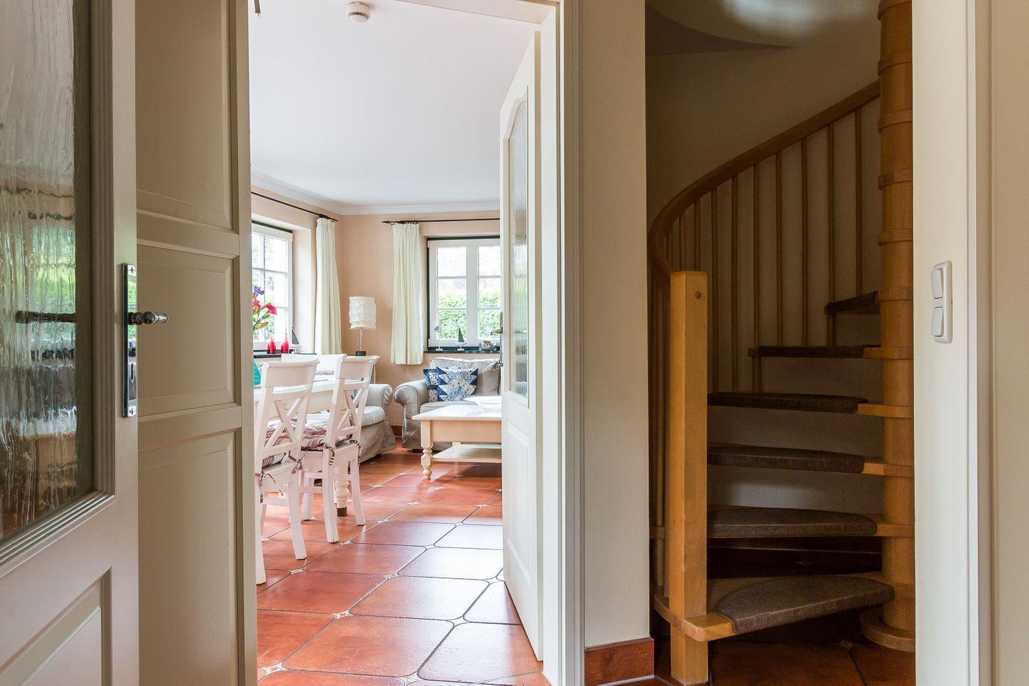 Im Erdgeschoss der Reetdach-Doppelhaushälfte befinden sich der offene und helle Wohnraum mit gemütlicher Sitzecke und integrierter Küche samt Essbereich. Ein Gäste-WC sowie ein Hauswirtschaftsraum mit Waschmaschine finden ebenfalls auf der unteren Etage Platz. Das erste Obergeschoss verfügt über das Hauptschlafzimmer mit einem Doppelbett, ein weiteres Schlafzimmer mit einem Tandembett für ein bis zwei Personen sowie ein modernes Bad mit Dusche/WC und Eckbadewanne.