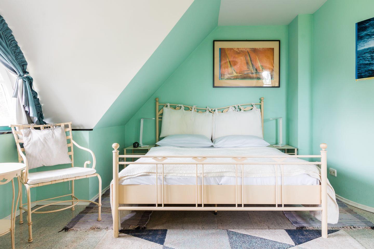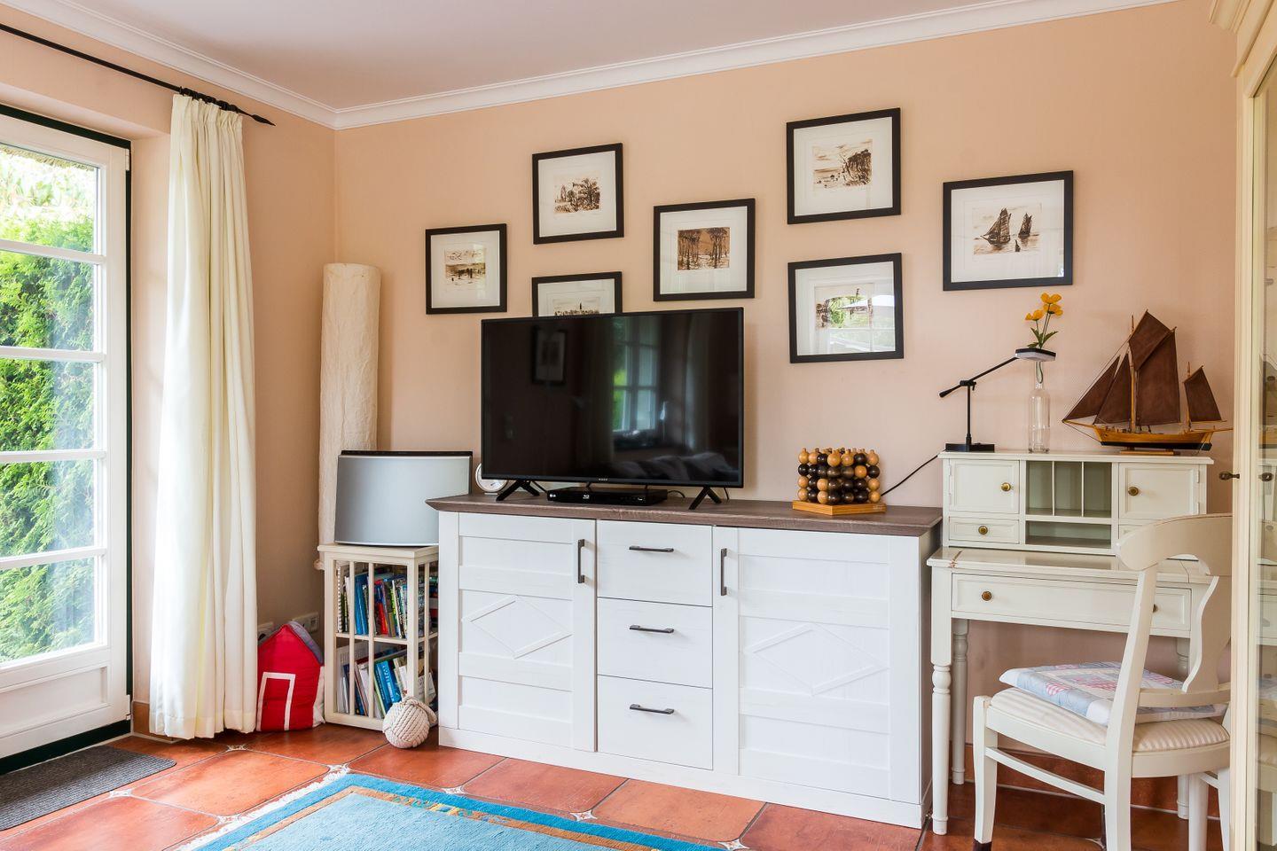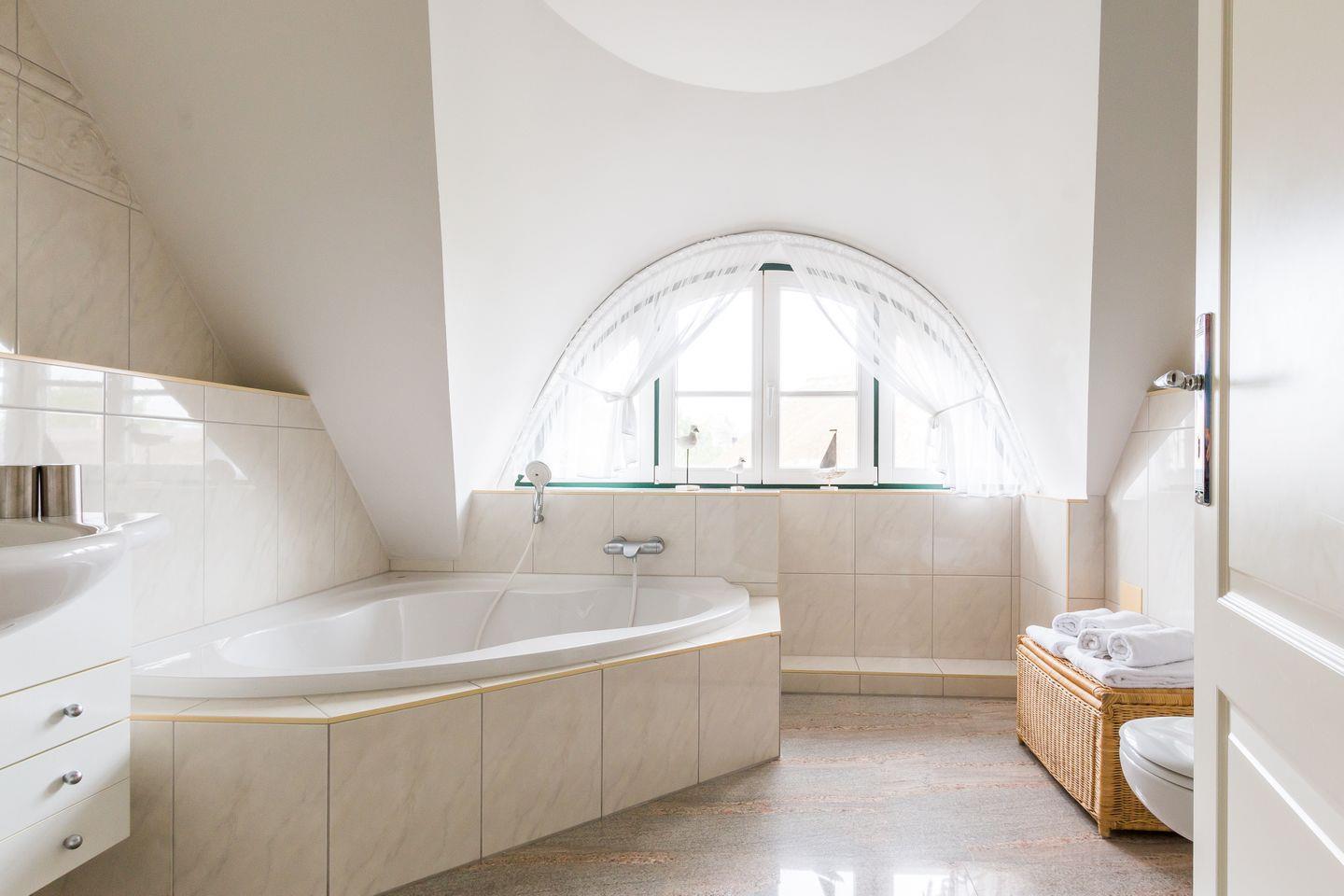 Im Erdgeschoss der Reetdach-Doppelhaushälfte befinden sich der offene und helle Wohnraum mit gemütlicher Sitzecke und integrierter Küche samt Essbereich. Ein Gäste-WC sowie ein Hauswirtschaftsraum mit Waschmaschine finden ebenfalls auf der unteren Etage Platz. Das erste Obergeschoss verfügt über das Hauptschlafzimmer mit einem Doppelbett, ein weiteres Schlafzimmer mit einem Tandembett für ein bis zwei Personen sowie ein modernes Bad mit Dusche/WC und Eckbadewanne.