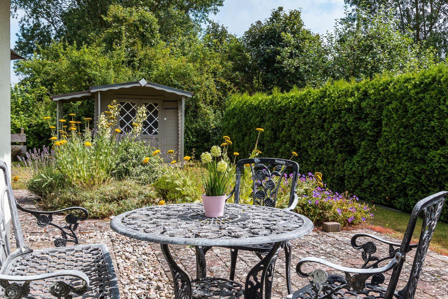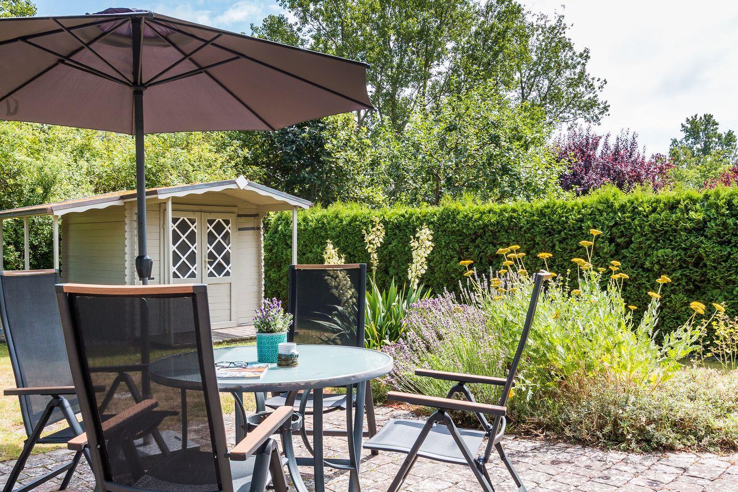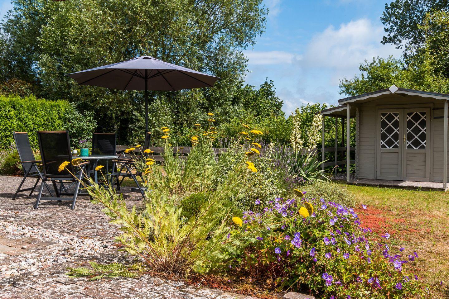 Der liebevoll angelegte Garten bietet dir zwei großzügige Steinterrassen mit Ost- und Süd-Ausrichtung. Hier kannst du sonnige und entspannte Stunden genießen - beispielsweise im hauseigenen Strandkorb. Des Weiteren stehen dir ein abschließbarer Fahrradschuppen und ein PKW-Stellplatz zur Verfügung.