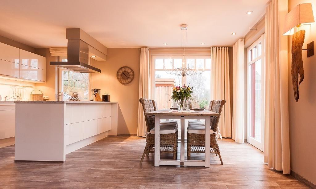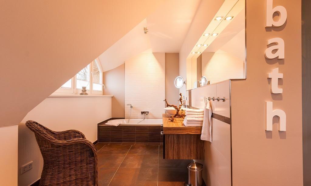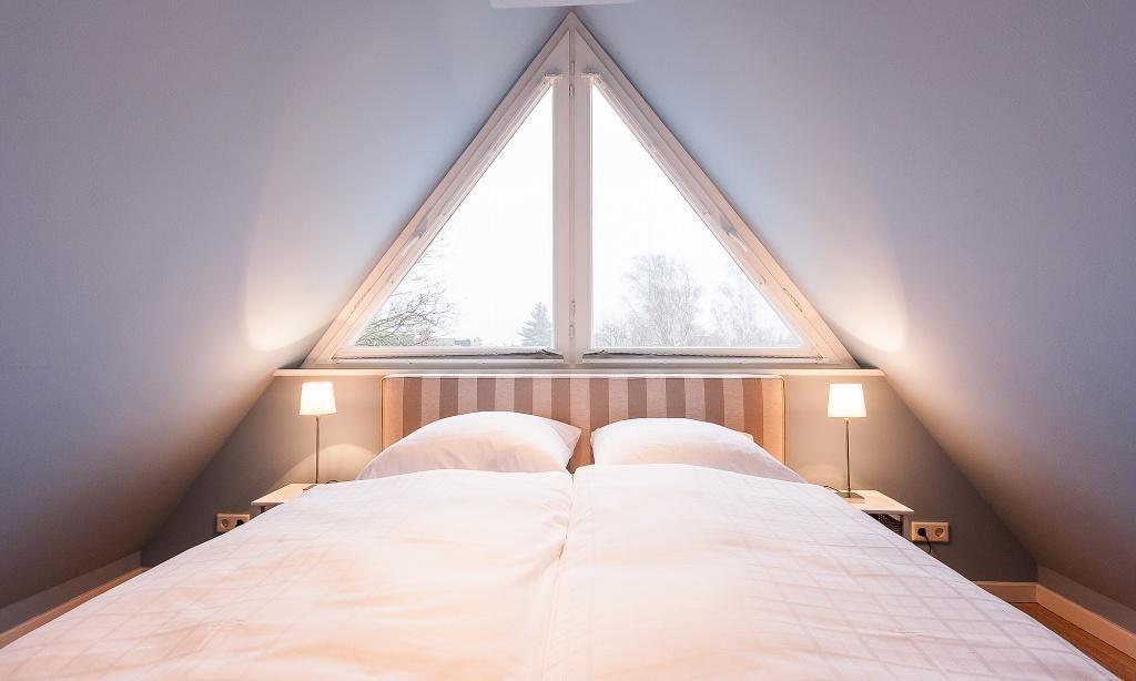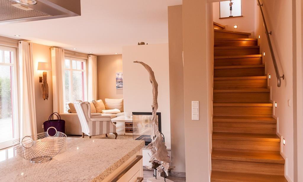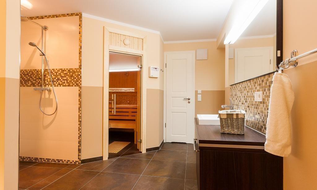 Im Erdgeschoss erwartet dich der großzügige Wohnraum mit einer gemütlichen Sitzecke. Der modern designte Kamin verbreitet angenehme Wärme und sorgt mit seinem knisternden Feuer für Entspannung in den Abendstunden. Die hochwertige Einbauküche mit Kochtresen sowie der großzügige Essbereich fügen sich harmonisch in den Wohnraum ein. Der abgeschlossene Eingangsbereich mit Garderobe sowie das geschmackvolle Gästebad mit Dusche und WC runden das Erdgeschoss ab. Das Obergeschoss beherbergt zwei abgeschlossene Schlafzimmer, die jeweils über ein Doppelbett verfügen. Die hochwertigen Betten und harmonischen Farben sorgen für das richtige Wohlbefinden, Entspannung und traumhafte Nächte. Das luxuriöse Bad ist mit einer Badewanne sowie Dusche und WC ausgestattet. Der Spitzboden bietet ein zusätzliches Geschoss. Hier wurde ein Arbeitsbereich geschaffen. Ein dritter Schlafraum mit einem Doppelbett findet hier ebenfalls seinen Platz. Das Kellergeschoss hält für seine Gäste eine kleine Wellnessoase mit Sauna mit Ruheraum bereit. Eine weitere Dusche mit WC sowie ein Hauswirtschaftsraum mit Waschmaschine und Trockner sorgen für zusätzlichen Wohnkomfort.