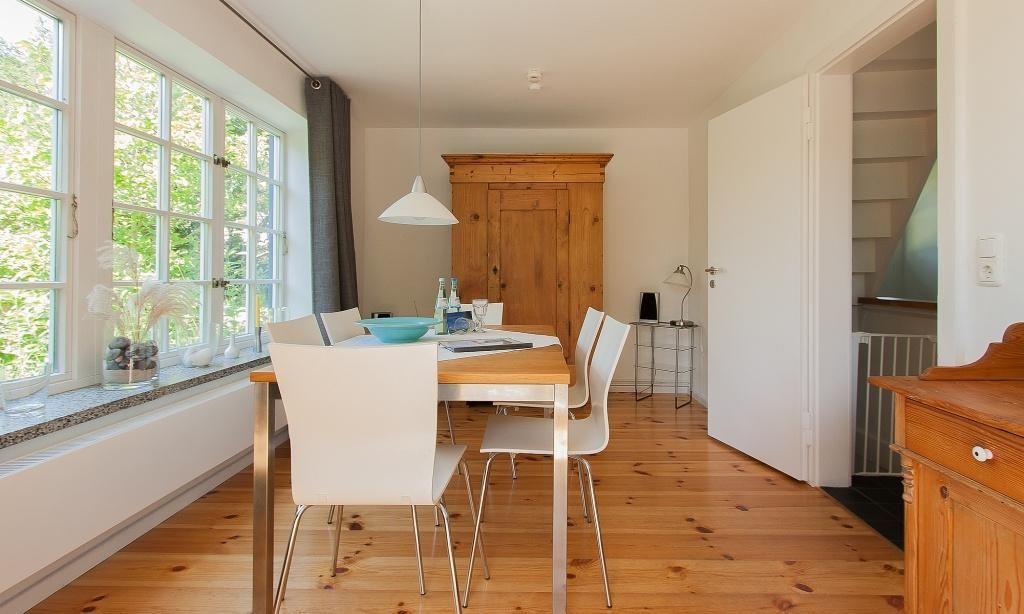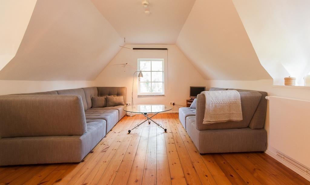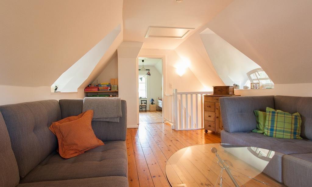 Im Erdgeschoss befindet sich das Esszimmer mit großem Esstisch, von hier aus hast du einen traumhaften Blick in den Garten. Die Küchenzeile ist im Flur integriert. Das angrenzende Schlafzimmer ist mit einem Doppelbett (180er Breite) ausgestattet. Weiterhin findet ein Bad mit Dusche/WC Platz. Eine etwas steilere Treppe führt direkt ins Dachgeschoss. Hier erwartet dich ein kleiner Wohnraum mit einer gemütlichen Sitzecke sowie ein Kinder-Schlafzimmer mit zwei Einzelbetten.