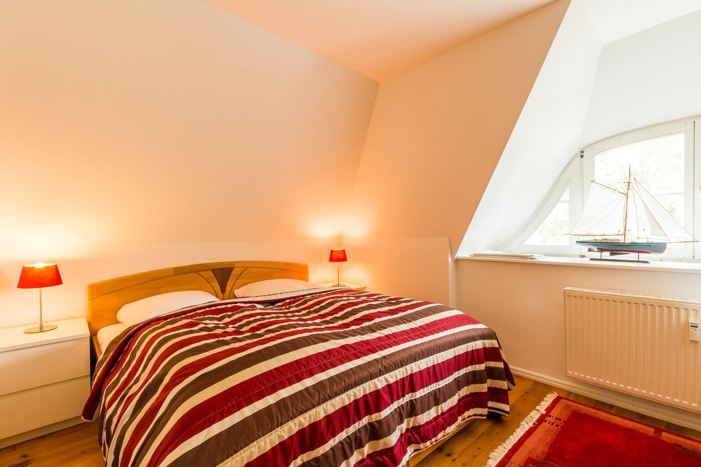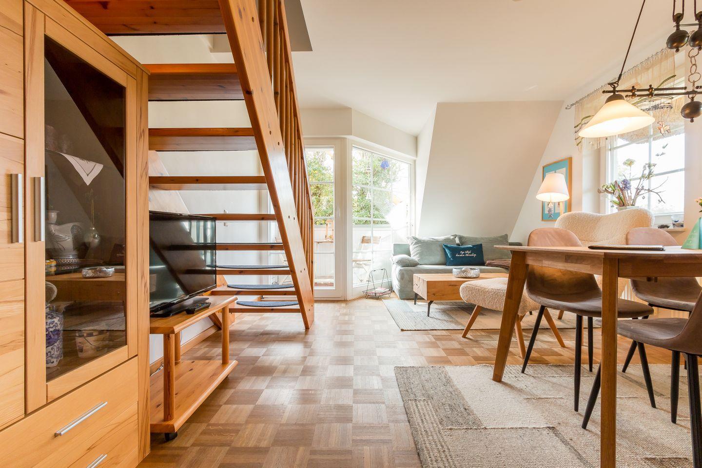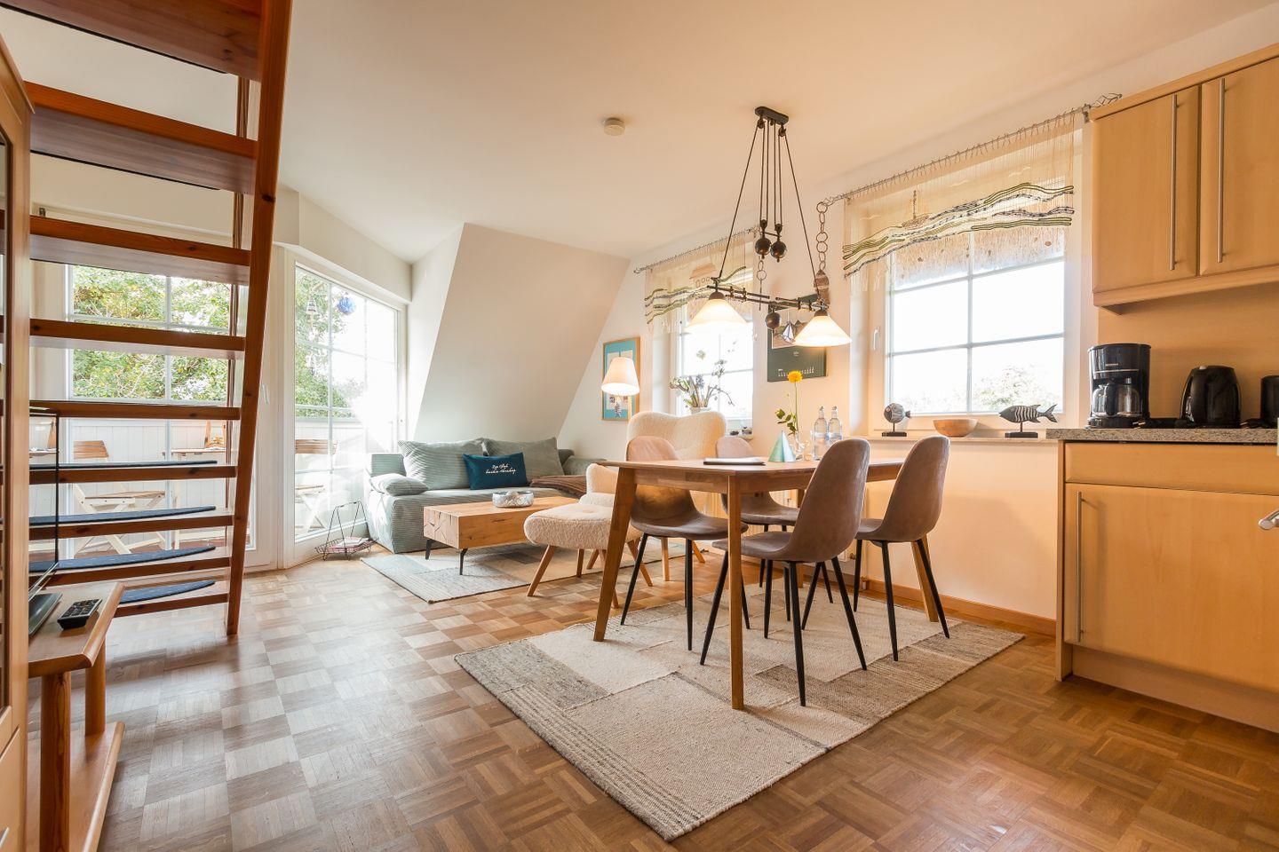 Im Obergeschoss erwartet dich der freundliche Wohnraum mit einer gemütlichen Sitzecke. Die komfortable Küchenzeile mit Essbereich ist unmittelbar integriert und sorgt für einen offenen Wohncharakter. Das Schlafzimmer verfügt über zwei Einzelbetten. Weiterhin findet ein Bad mit Dusche/WC in dieser Etage Platz. Das Dachgeschoss verfügt über ein zweites Schlafzimmer, dass mit einem Doppelbett ausgestattet ist. Der dazugehörige Balkon ist direkt vom Wohnbereich aus erreichbar.