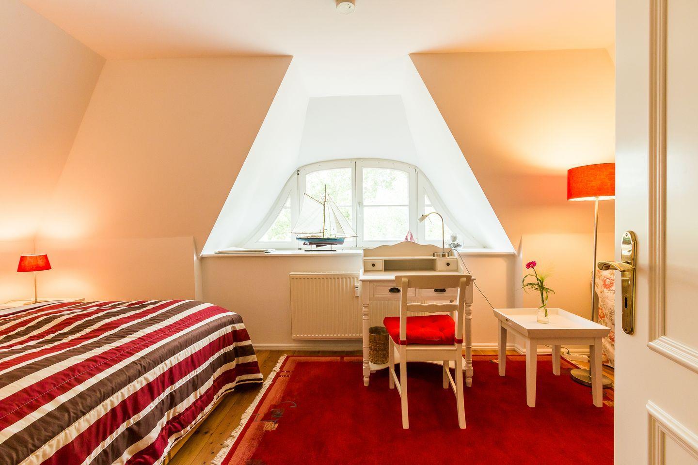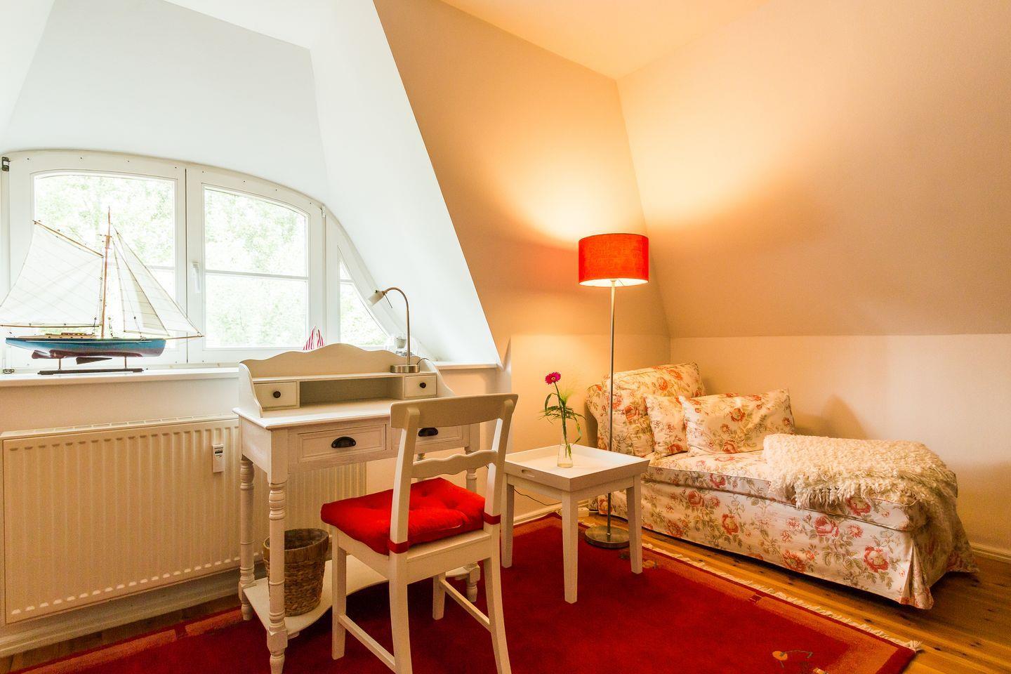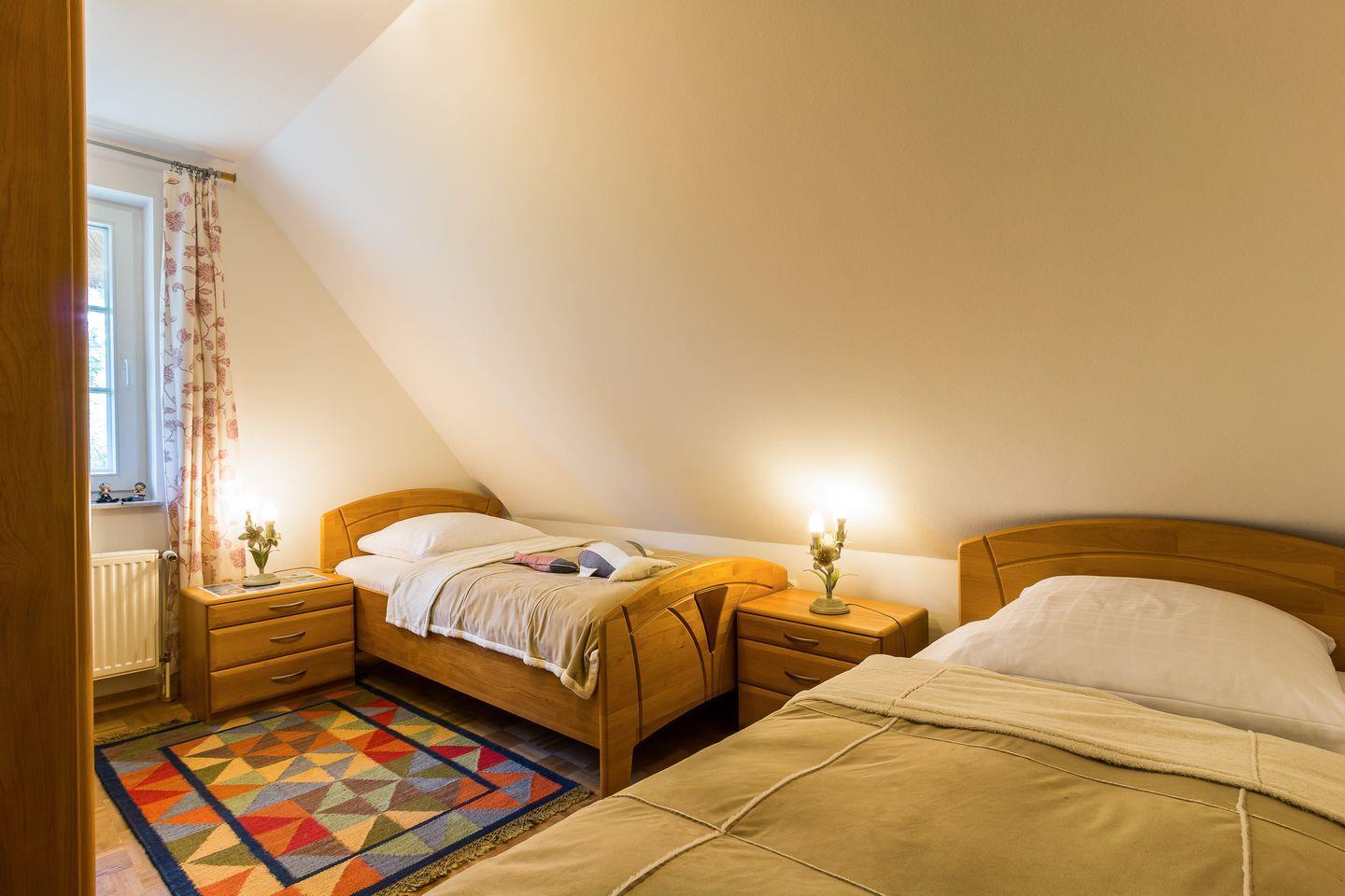 Im Obergeschoss erwartet dich der freundliche Wohnraum mit einer gemütlichen Sitzecke. Die komfortable Küchenzeile mit Essbereich ist unmittelbar integriert und sorgt für einen offenen Wohncharakter. Das Schlafzimmer verfügt über zwei Einzelbetten. Weiterhin findet ein Bad mit Dusche/WC in dieser Etage Platz. Das Dachgeschoss verfügt über ein zweites Schlafzimmer, dass mit einem Doppelbett ausgestattet ist. Der dazugehörige Balkon ist direkt vom Wohnbereich aus erreichbar.