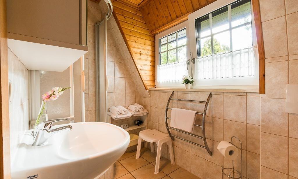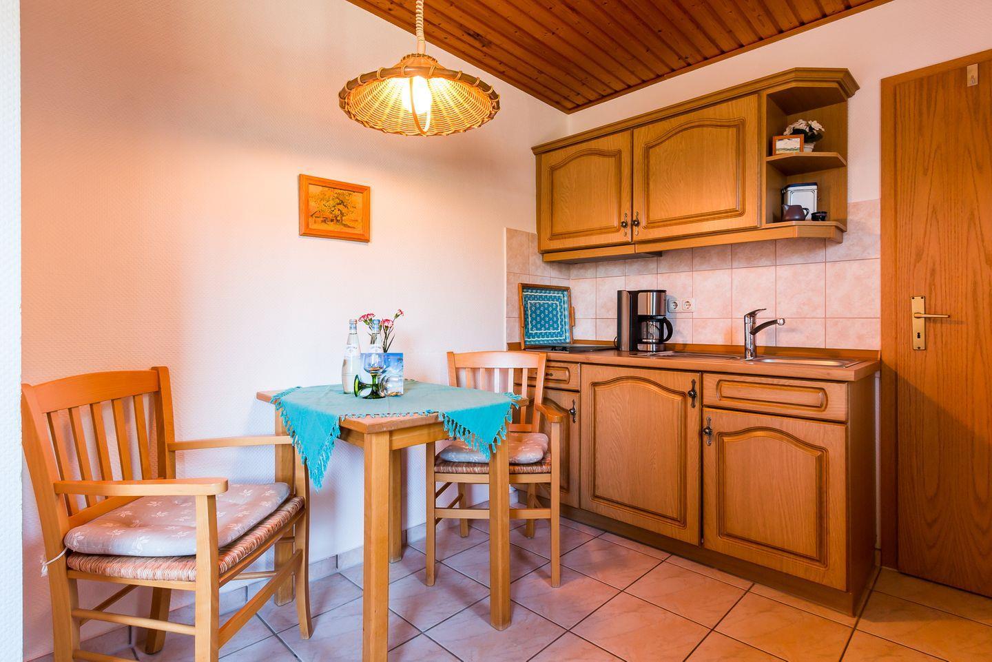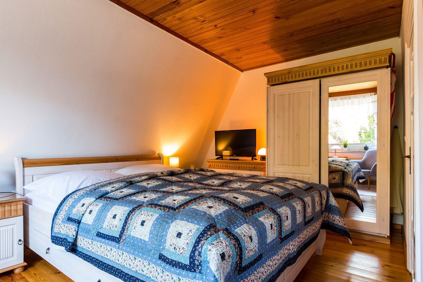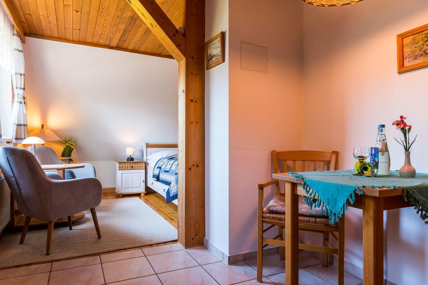 Die kleine und offen gestaltete Dachgeschosswohnung ist über eine Außentreppe erreichbar und bietet dir einen gemütlichen Komfort für zwei Personen. In dem kombinierten Wohn- und Schlafraum erwarten dich ein Doppelbett, ein kleiner Sitzbereich mit TV, ein separater Esstisch und eine Miniküche (Zweiplattenherd). Das Bad mit Dusche/WC schließt sich direkt an. Vom Schlafbereich gelangst du auf die herrliche Dachterrasse mit Blick ins Grüne. Hier kannst du entspannte Urlaubsstunden verbringen und die Seele baumeln lassen.