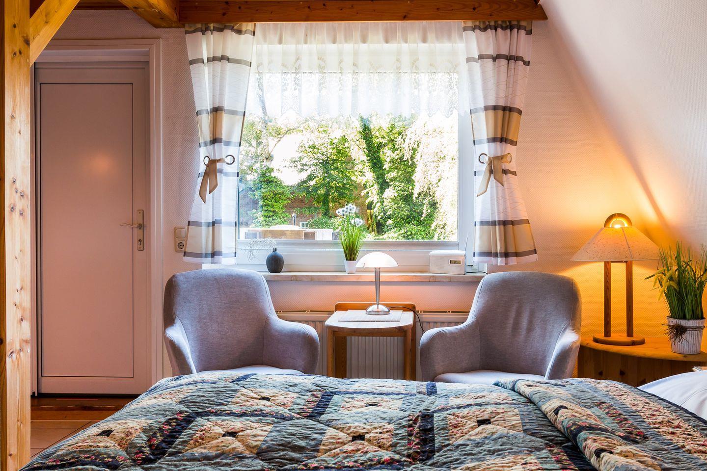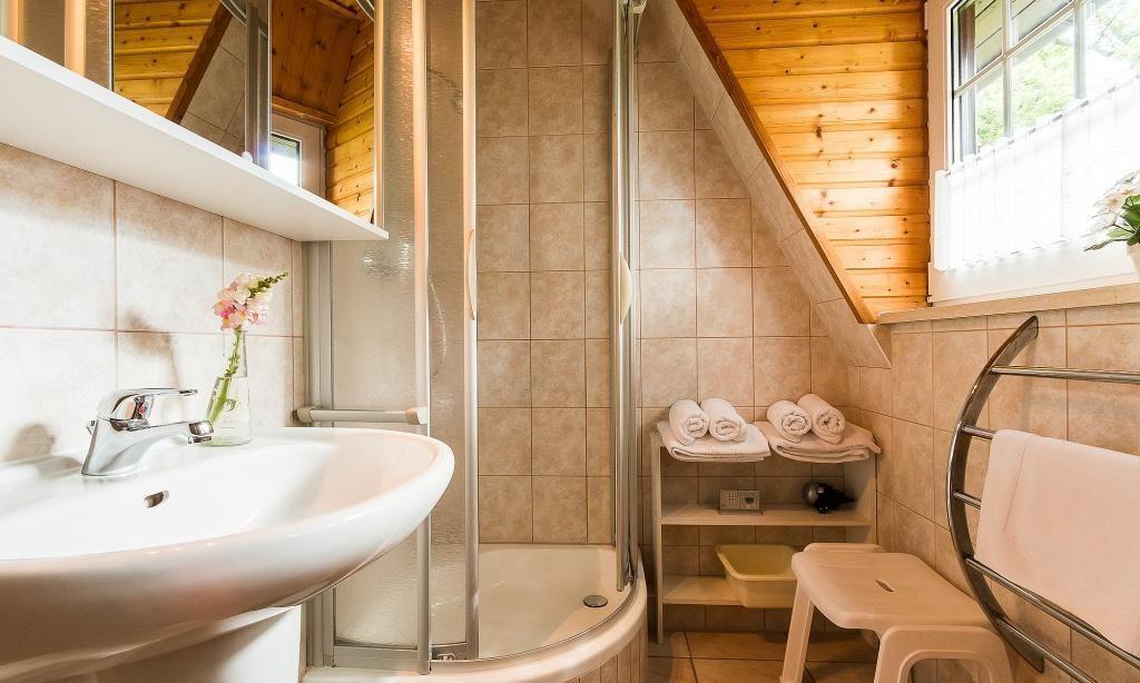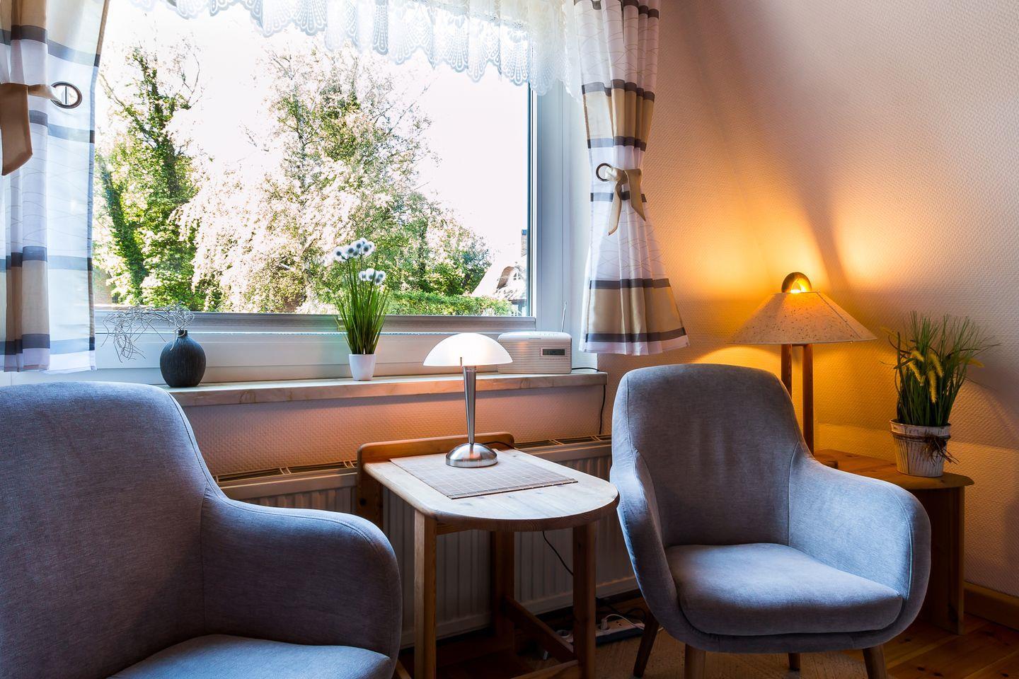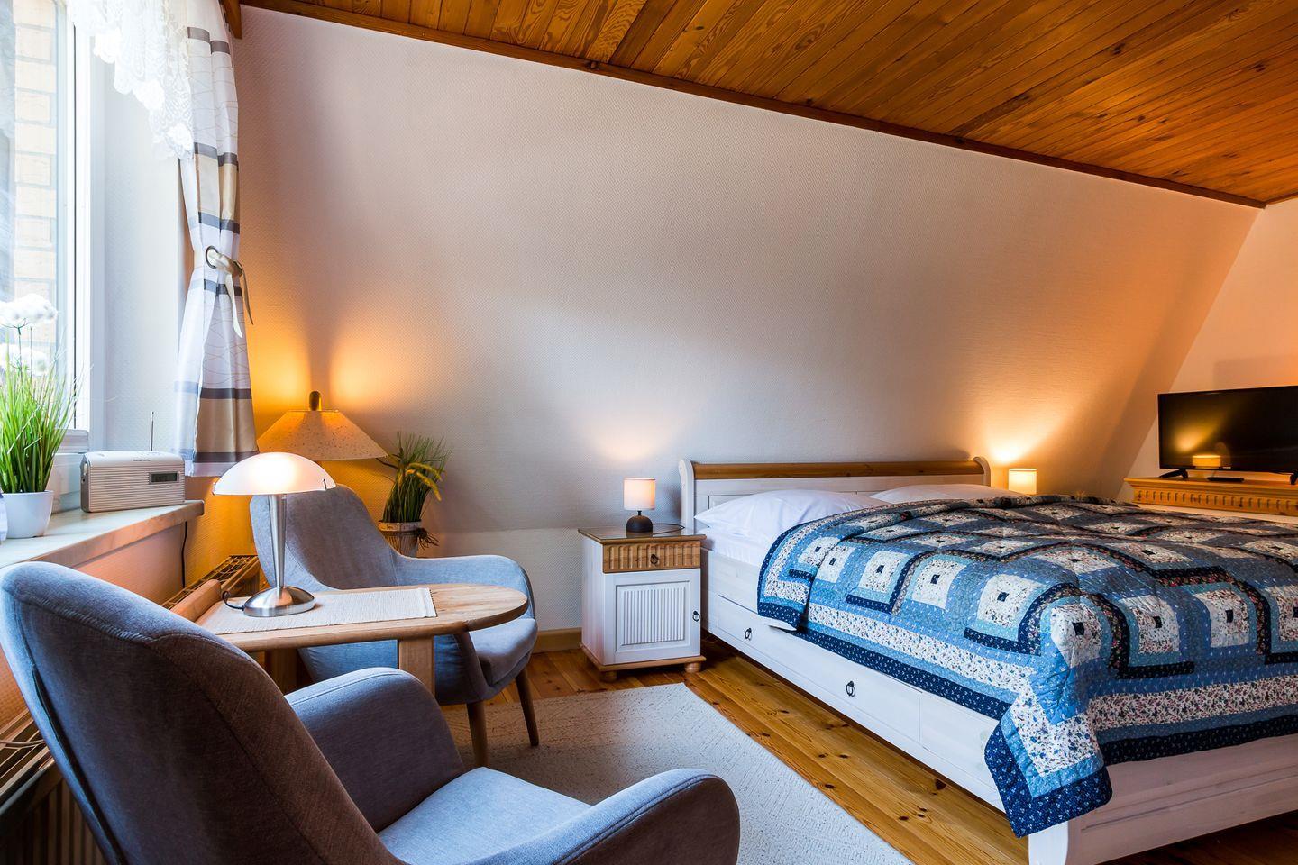 Die kleine und offen gestaltete Dachgeschosswohnung ist über eine Außentreppe erreichbar und bietet dir einen gemütlichen Komfort für zwei Personen. In dem kombinierten Wohn- und Schlafraum erwarten dich ein Doppelbett, ein kleiner Sitzbereich mit TV, ein separater Esstisch und eine Miniküche (Zweiplattenherd). Das Bad mit Dusche/WC schließt sich direkt an. Vom Schlafbereich gelangst du auf die herrliche Dachterrasse mit Blick ins Grüne. Hier kannst du entspannte Urlaubsstunden verbringen und die Seele baumeln lassen.