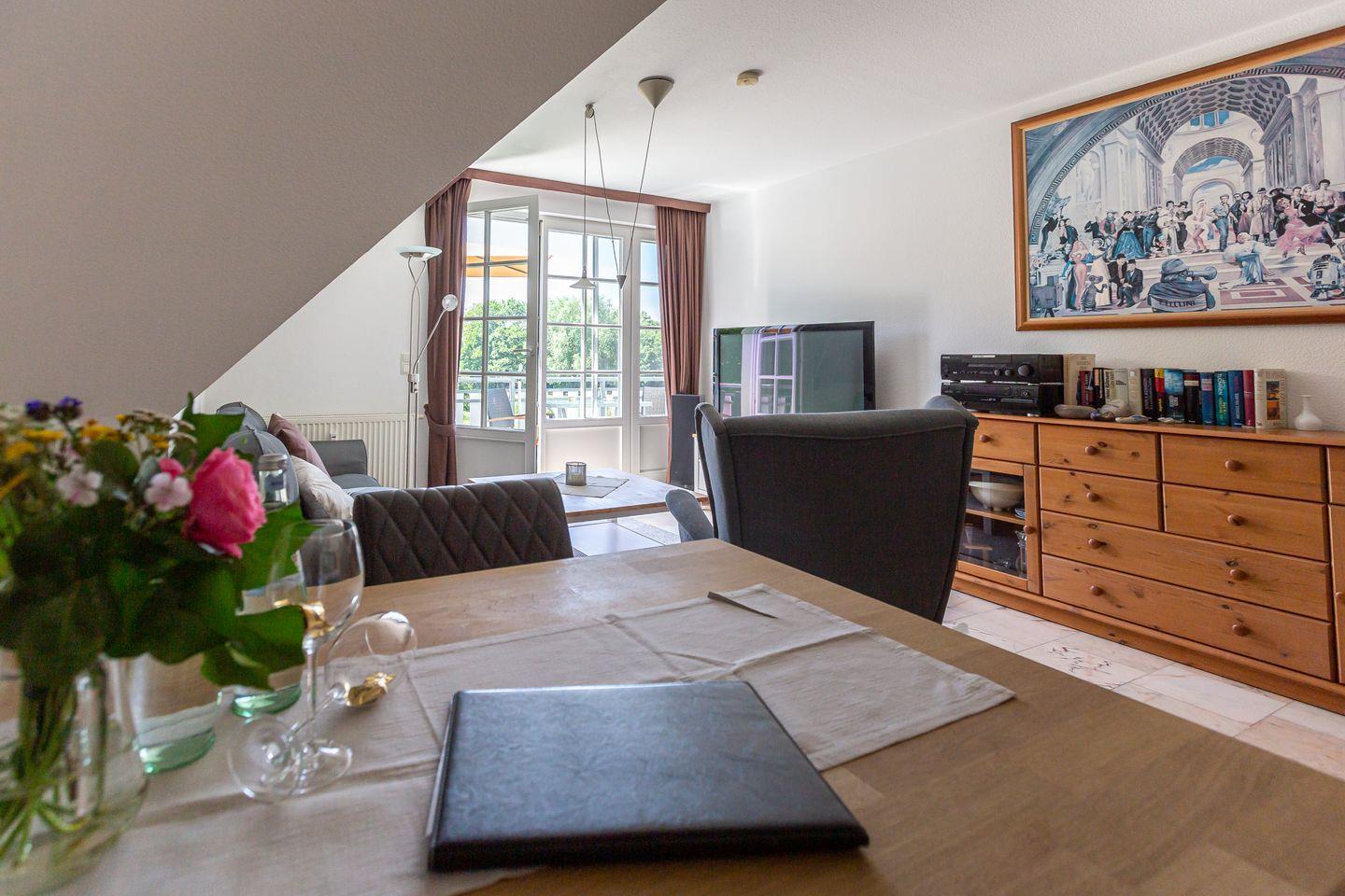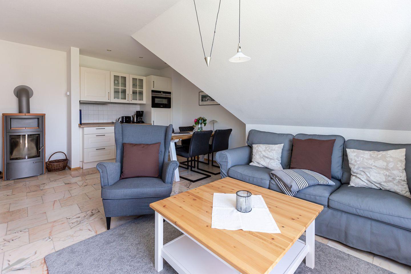 Die Wohnung befindet sich im ersten Obergeschoss eines Mehrfamilienhauses und erstreckt sich über zwei Etagen. Der Wohnraum empfängt dich mit einer gemütlichen Sitzecke am Kaminofen. Die Küchenzeile mit angrenzendem Essbereich ist unmittelbar integriert und schafft einen offenen Wohncharakter. Das Schlafzimmer ist mit einem Doppelbett ausgestattet. Das Bad verfügt über Dusche/WC sowie eine Waschmaschine. Der Balkon ist sowohl vom Wohnbereich, als auch vom Schlafzimmer aus begehbar. Über eine Wendeltreppe gelangst du ins offen gestaltete Dachgeschoss. Von hier genießt du einen freien Blick auf eine wildwachsende Wiese. Auch ein zweiter Schlafbereich mit einem Doppelbett befindet sich hier.