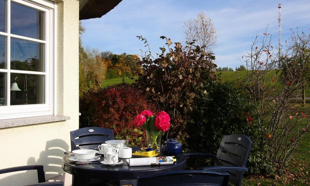 Zur Ferienwohnung gehört eine Steinterasse mit traumhaften Blick auf die Wiesen bis zum Saaler Bodden. Hier lässt es sich herrlich entspannen und die Seele baumeln. Außerdem steht dir ein PKW-Stellplatz zur Verfügung.