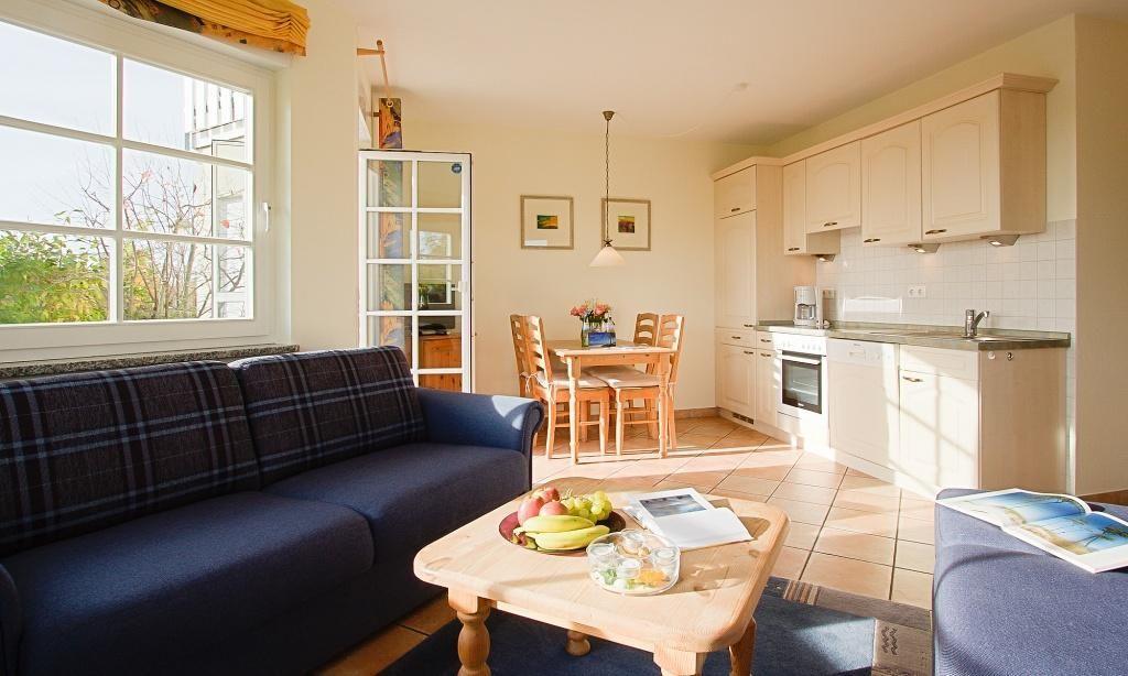 Die helle und freundliche Erdgeschosswohnung empfängt dich im Wohnraum mit einer gemütlichen Sitzecke im Erker. Die Küchenzeile fügt sich direkt ein und schafft einen offenen Wohncharakter. Auch das Schlafzimmer ist gemütlich und mit einem Doppelbett ausgestattet. Das separate Bad verfügt über Dusche/WC. Eine zusätzliche Aufbettungsmöglichkeit für ein bis zwei Personen bietet die Couch im Wohnbereich.