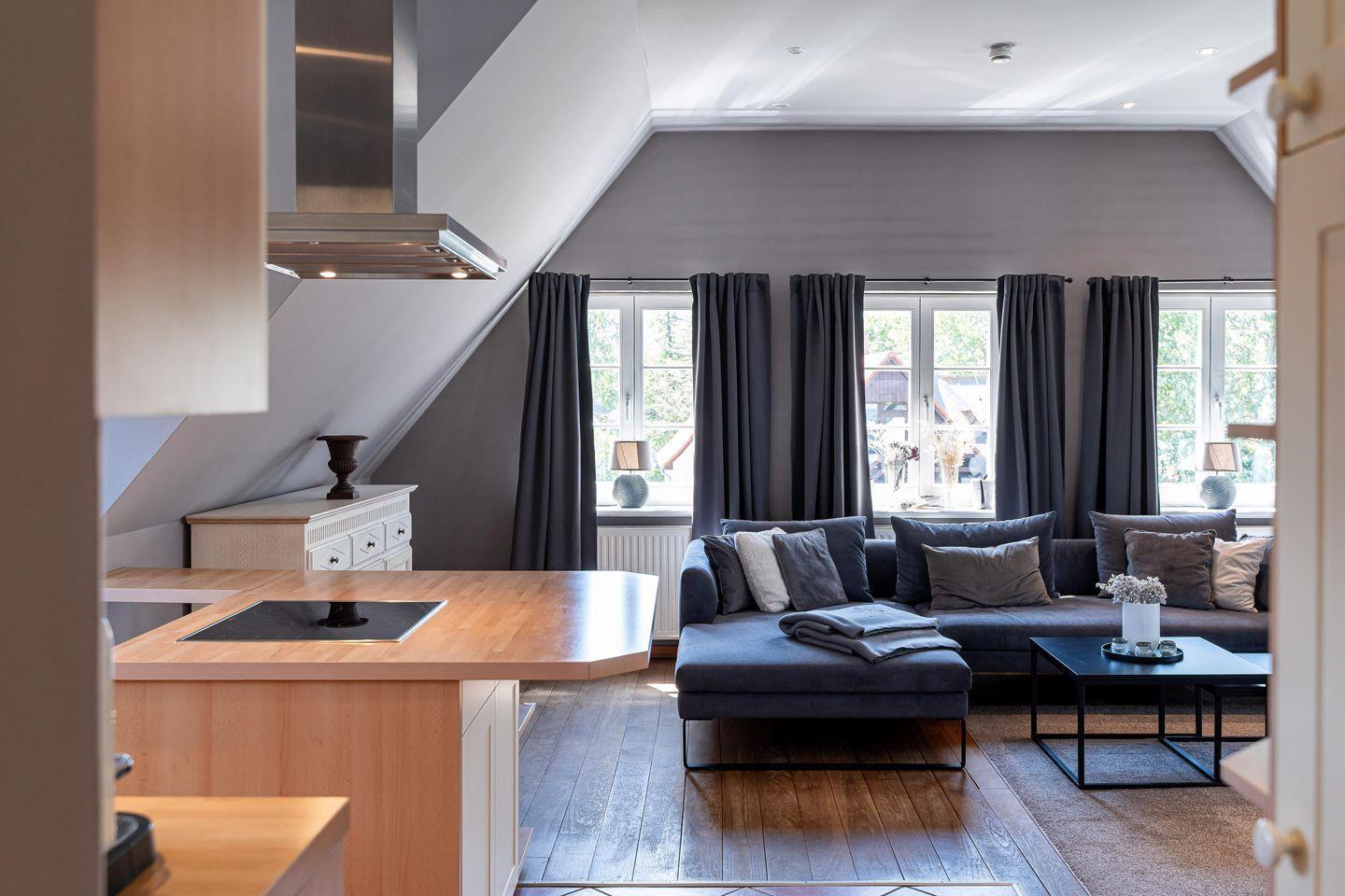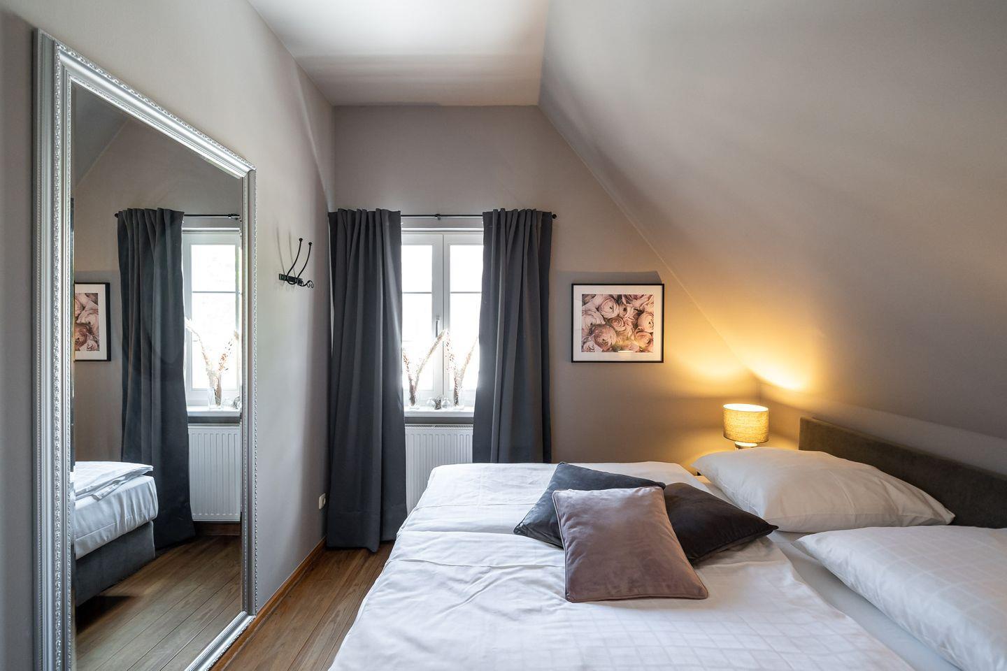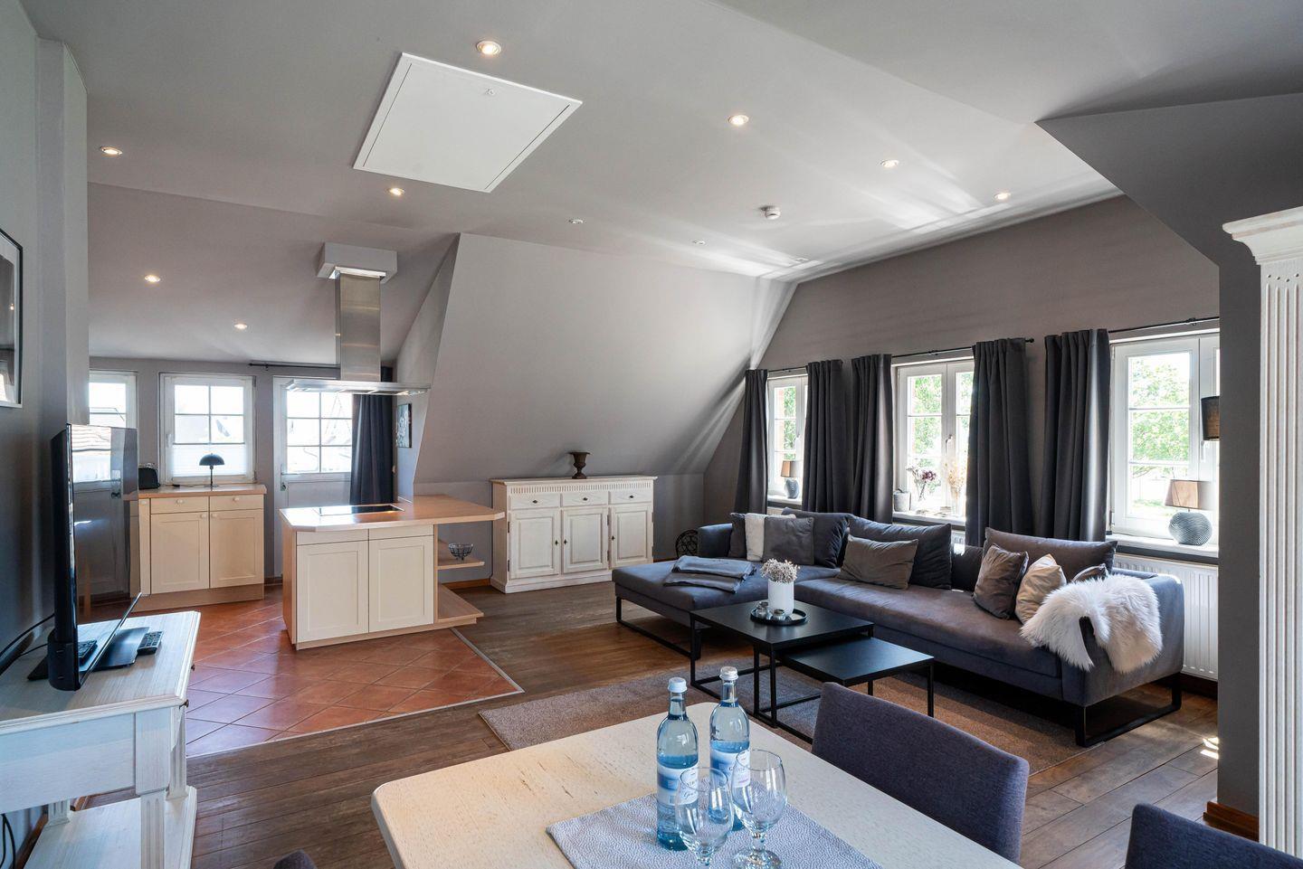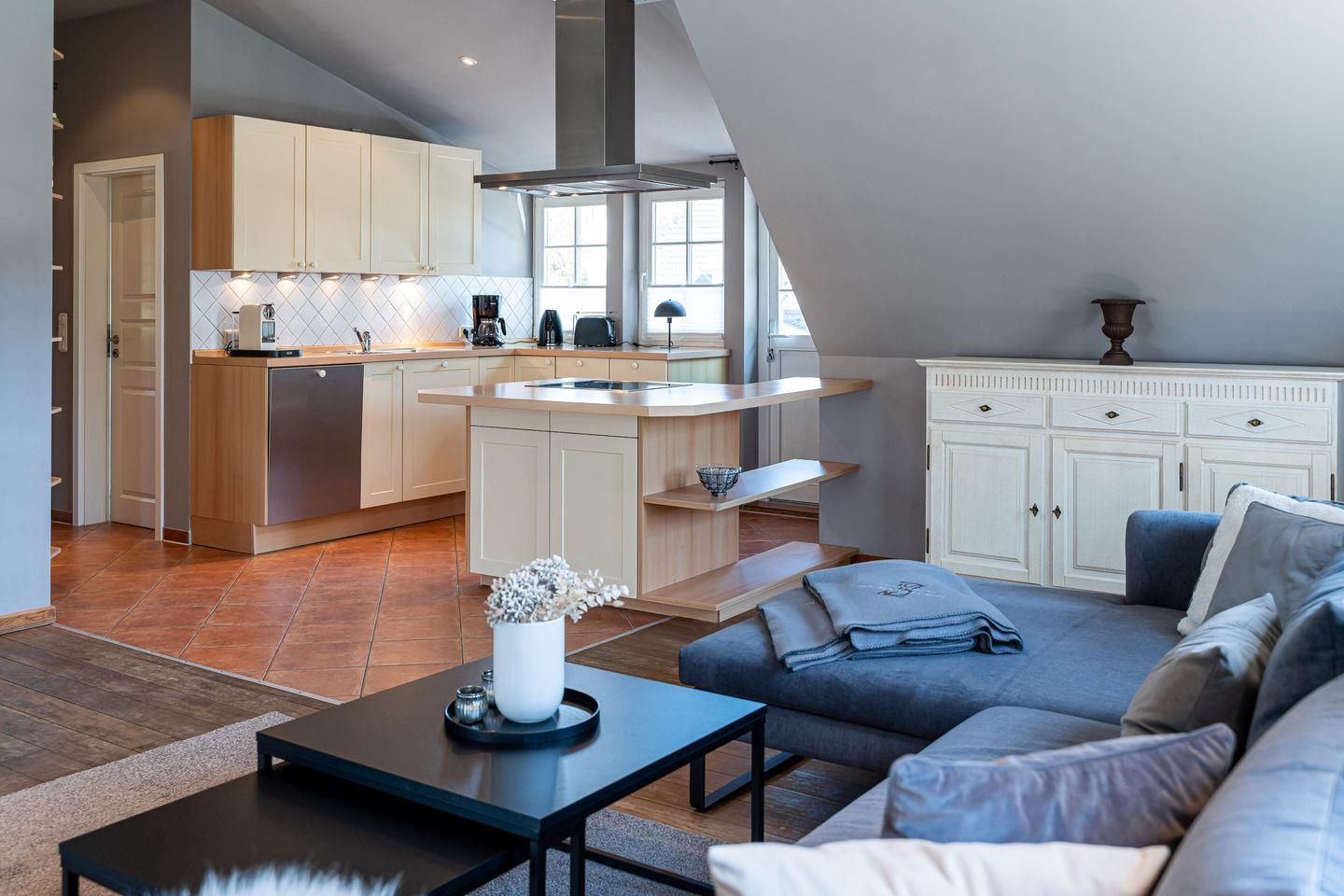 Die Wohnung erstreckt sich über das gesamte Dachgeschoss eines Geschäftshauses und bietet ausreichend Platz für einen entspannten Urlaub für bis zu vier Personen. Über die seeseitige Dachterrasse mit außenliegender Treppe gelangst du in die Wohnung. Der Wohnbereich bietet neben der gemütlichen Sitzecke auch einen großzügigen Essbereich. Die Küche mit Kochinsel ist direkt integriert und bietet alles, was du zum Kochen im Urlaub brauchst. Eins der beiden Schlafzimmer verfügt über ein Doppelbett, Flat-TV sowie ein zusätzliches offenes Wannenbad und separates WC. Im zweiten Schlafzimmer gibt es ebenfalls ein Doppelbett und Stauraum für die Kleidung. Ein zweites Bad mit Dusche/WC sorgt für weiteren Wohnkomfort in dieser schönen Ferienwohnung. Der ostseitige Balkon ist von der Küche und vom Bad aus begehbar.