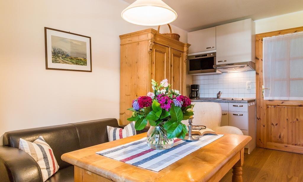 Diese kleine Appartement-Wohnung befindet sich im Obergeschoss und bietet Platz für zwei Personen. In dem kombinierten Wohn- und Schlafraum erwartet dich eine gemütliche Couch, ein Esstisch, ein Doppelbett und eine kleine Küchenzeile. Ein Bad mit Dusche/WC ist separat vorhanden. Die Wohnung ist im Landhaus-Stil eingerichtet und erstrahlt in warmem Holz. Das hochwertige Eichenparkett sorgt ebenfalls für Wohnkomfort.