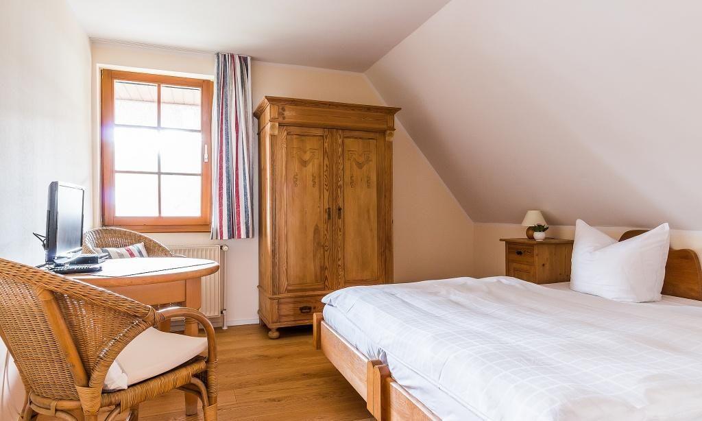 Die Obergeschosswohnung begeistert mit ihrer urigen und sehr gemütlichen Einrichtung im Landhausstil. In dem offenen Wohn- und Küchenbereich erwartet dich eine gemütliche Couchgarnitur mit TV, eine Küchenzeile und ein Esstisch. Die Wohnung verfügt über zwei Schlafzimmer, welche mit je einem Doppelbett (zwei einzelne Matratzen) ausgestattet sind. Ein Bad mit Dusche/WC komplementiert das Feriendomizil. Das hochwertige Eichenparkett als auch die Holzmöbel sorgen für eine warme Wohnatmosphäre.