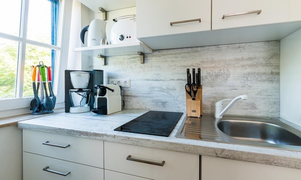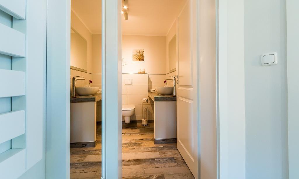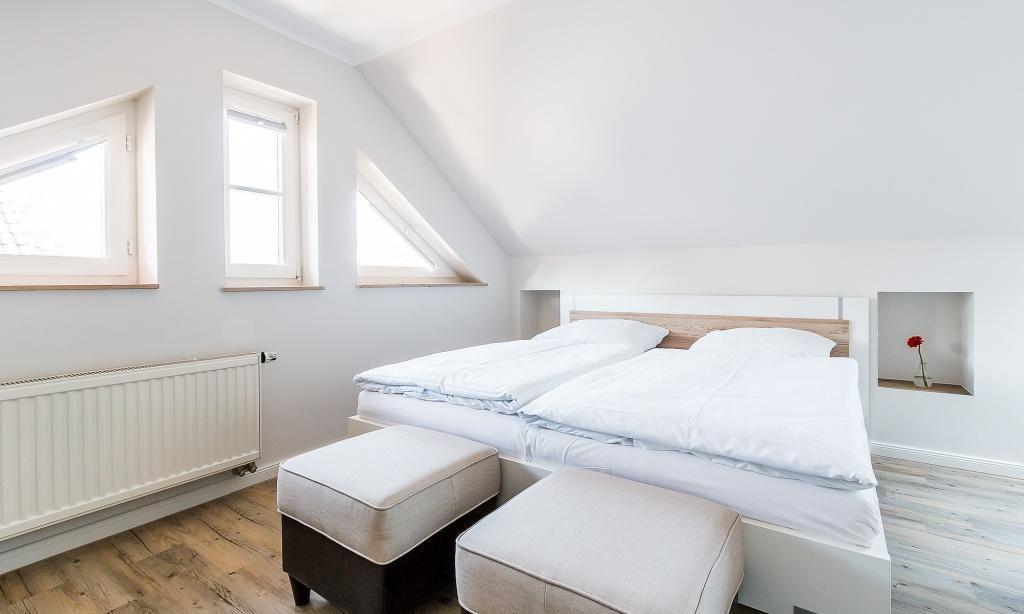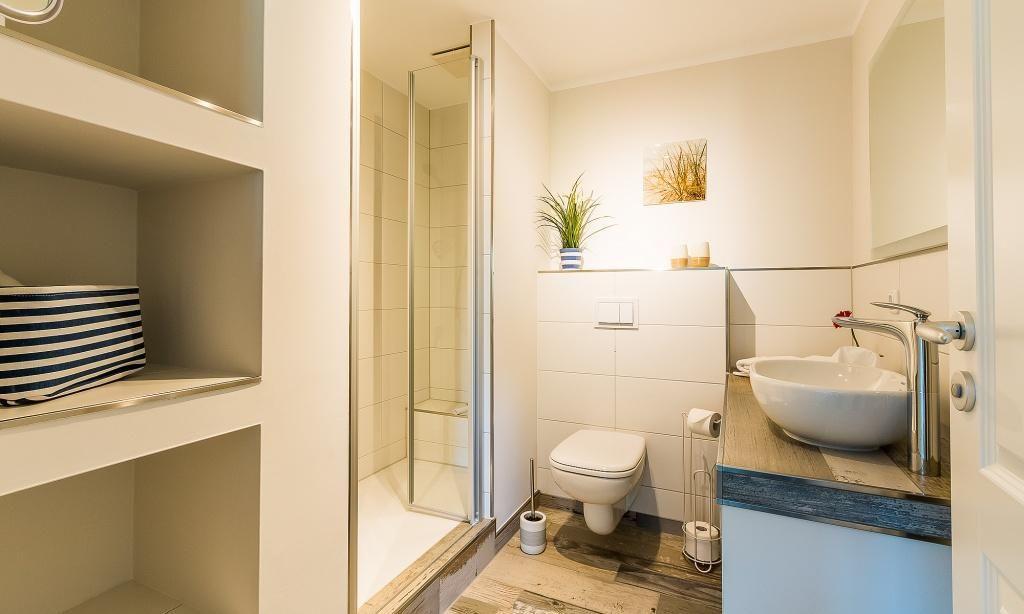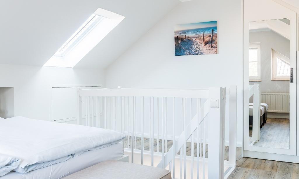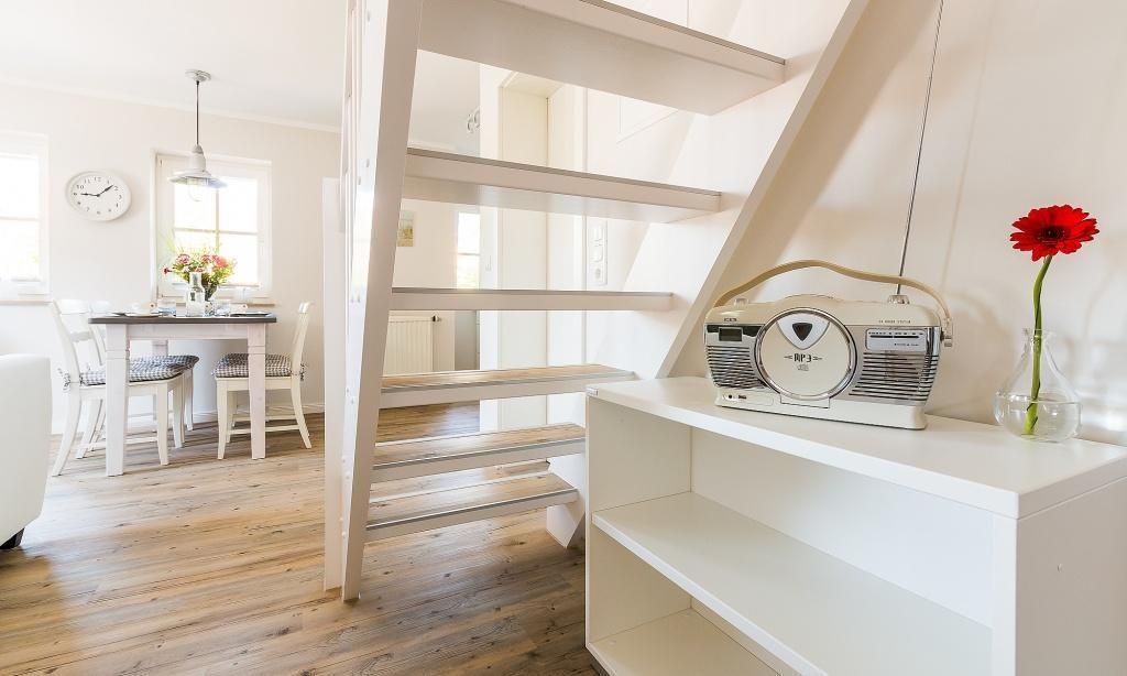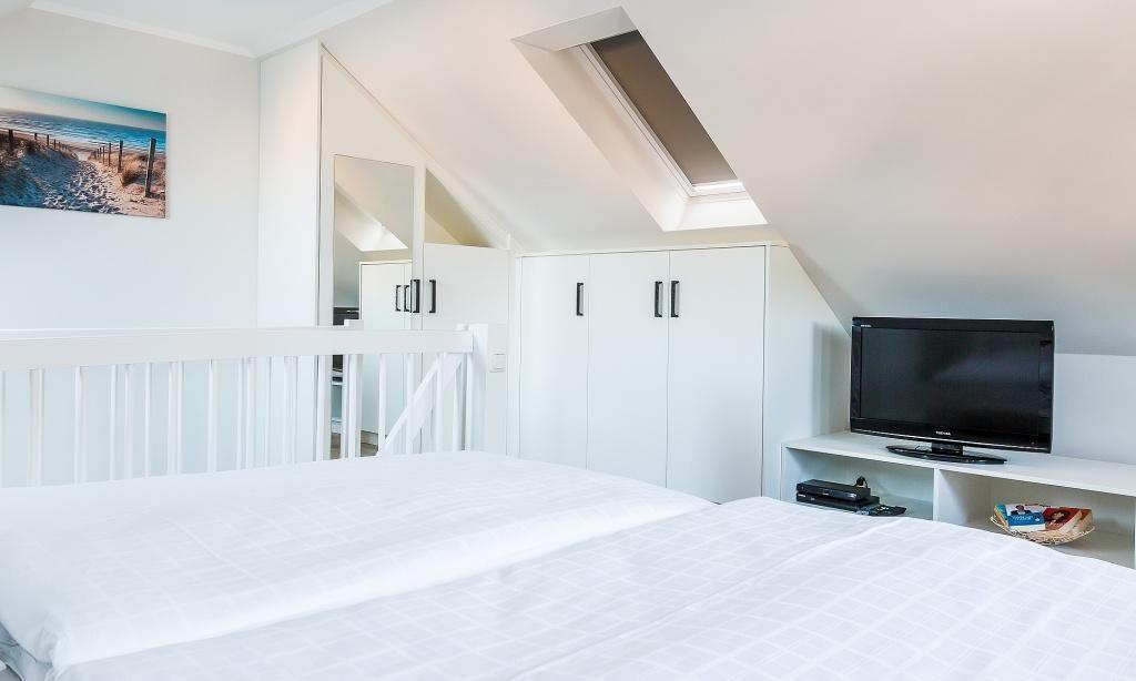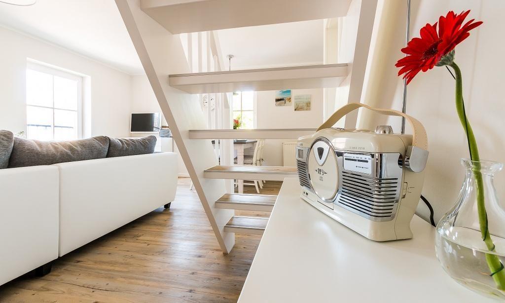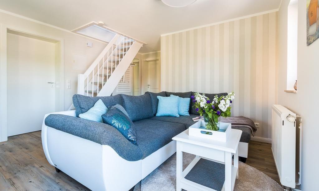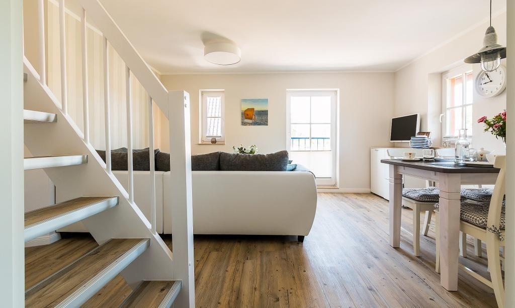 In der Maisonette-Wohnung erwartet dich ein gemütlicher Wohnbereich mit TV- und Essbereich. Die offene Küche ist modern und funktional ausgestattet. Ein Schlafzimmer mit einem Doppelbett und ein ansprechendes Bad mit Dusche/WC befinden sich ebenfalls im ersten Obergeschoss. Vom Wohnbereich gelangst du über eine Treppe ins Dachgeschoss. Hier liegt das zweite Schlafzimmer, welches ebenfalls mit einem Doppelbett und einem zweiten TV-Gerät ausgestattet ist. Die gesamte Wohnung ist liebevoll und harmonischen Farben eingerichtet. Der Seaside-Stil passt perfekt zur strandnahen Lage. Das ist Urlaubs-Feeling pur.