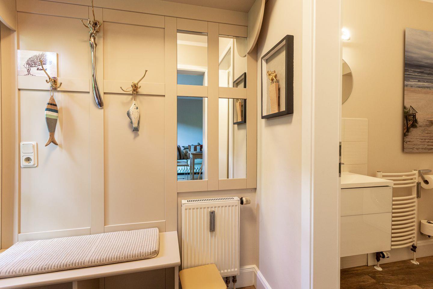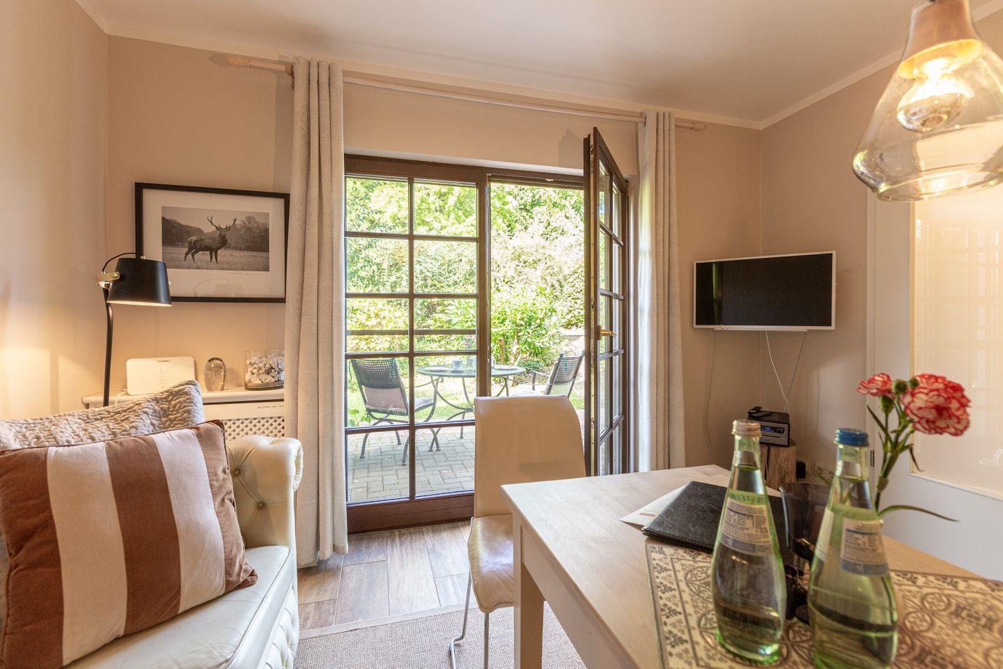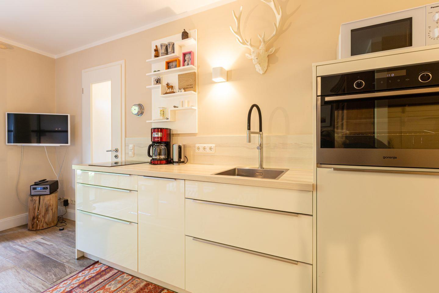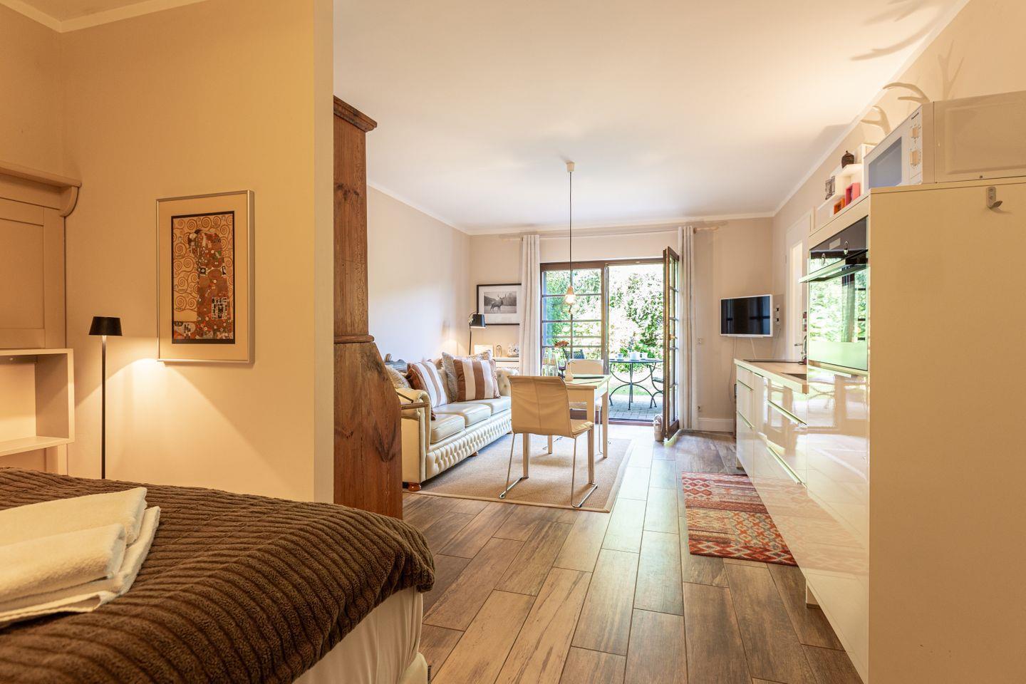Die schicke Wohnung befindet sich im Erdgeschoss und bietet genügend Platz für zwei Personen. Liebevoll eingerichtet, begeistert die Wohnung auch mit einer in 2022 aktuellen Modernisierung. Der Wohnbereich ist das Herzstück der Ferienwohnung mit seiner modernen Sitzecke und der offenen Küchenzeile. Die Dekoelemente sind allesamt ausgewählt und passen harmonisch mit dem Interieur zusammen. Besonders ist auch die Dusche, die als halboffene, verglaste Variante in den Schlafbereich integriert wurde. Das Bad mit WC befindet sich separat. Herrlich träumen lässt es sich auch in dem Schlafbereich mit hochwertigem Boxspringbett, der optisch etwas abgetrennt vom Wohnbereich ist. In Holzdielenoptik aber gefliest bietet der Boden zudem einen sehr wertigen Belag.