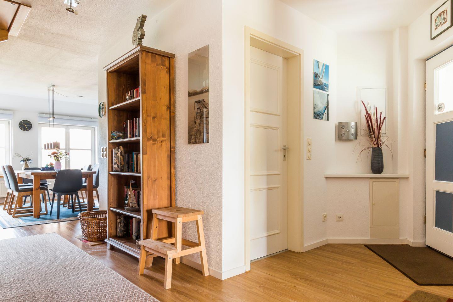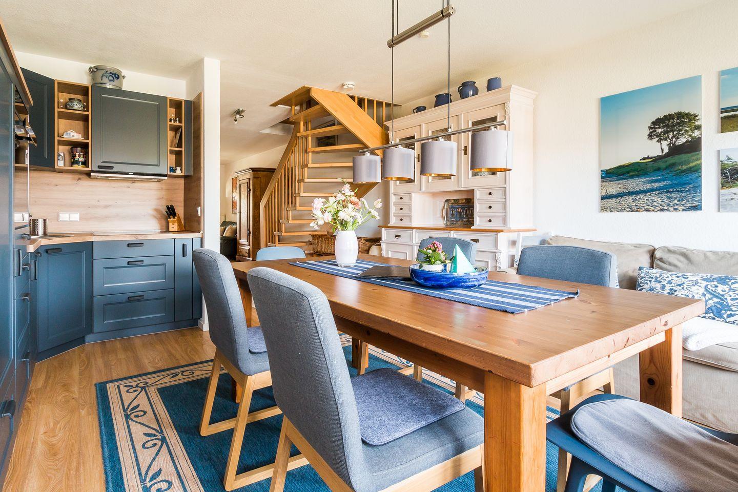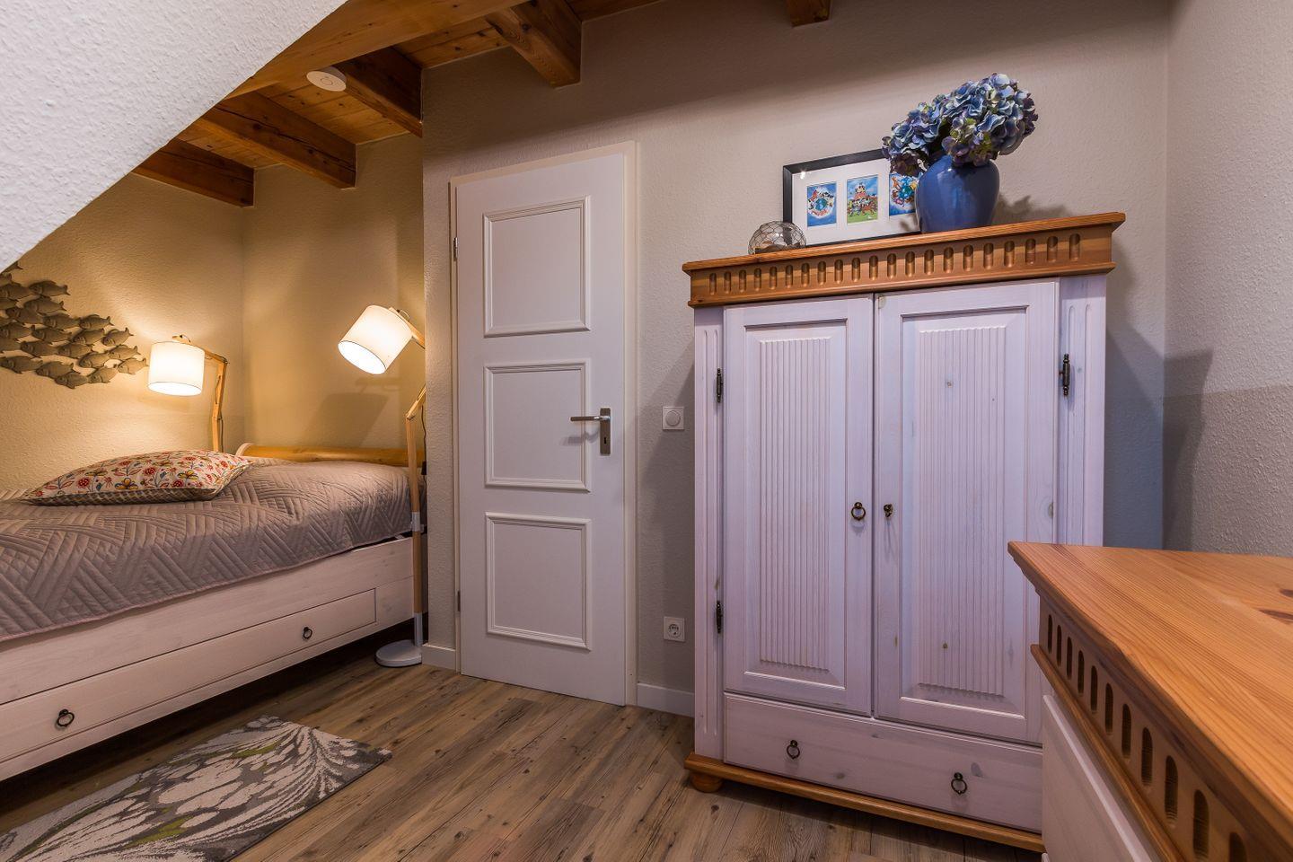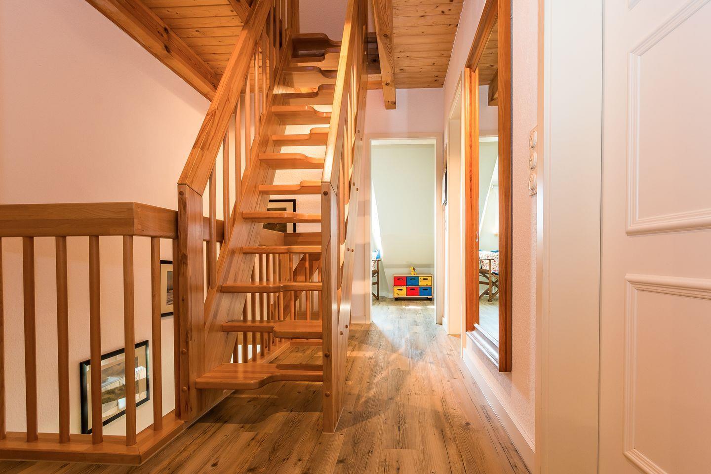 Im ersten Obergeschoss befindet sich ein liebevoll eingerichtete Maisonette-Ferienwohnung. Der Wohnraum mit einer gemütlichen Sitzecke sowie eine Wohnküche mit großem Esstisch ist Mittelpunkt der Unterkunft. Weiterhin findet ein Bad mit Dusche/WC in dieser Etage Platz. Das zweite Obergeschoss verfügt über ein Schlafzimmer mit einem Doppelbett sowie ein Schlafzimmer mit einem französischen Doppelbett. Weiterhin gibt es ein zweites Bad mit Wanne/WC und Waschmaschine. Das Dachgeschoss (über eine steile Treppe zu erreichen) ist zu einer offenen Galerie ausgebaut und bietet zwei zusätzliche Schlafmöglichkeiten.