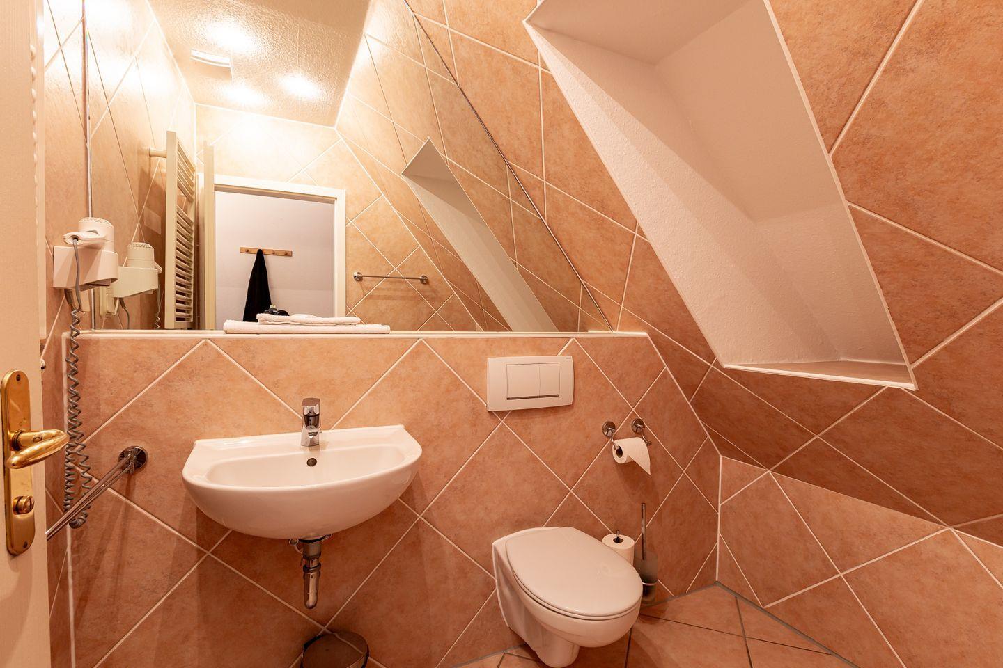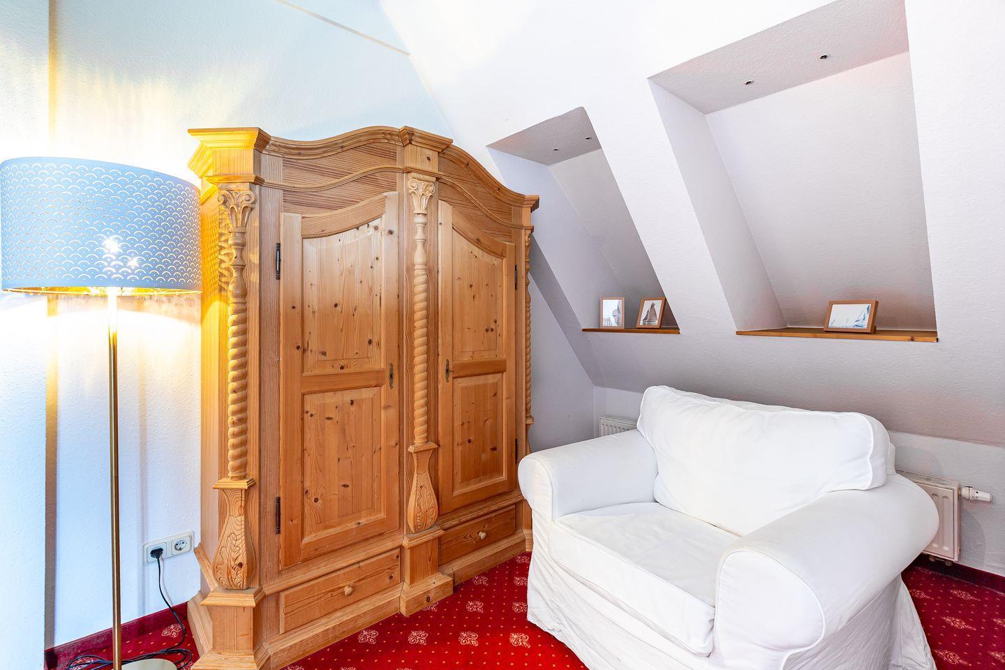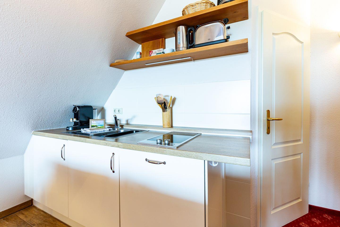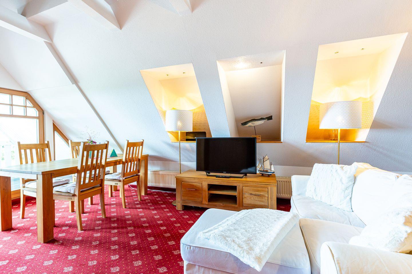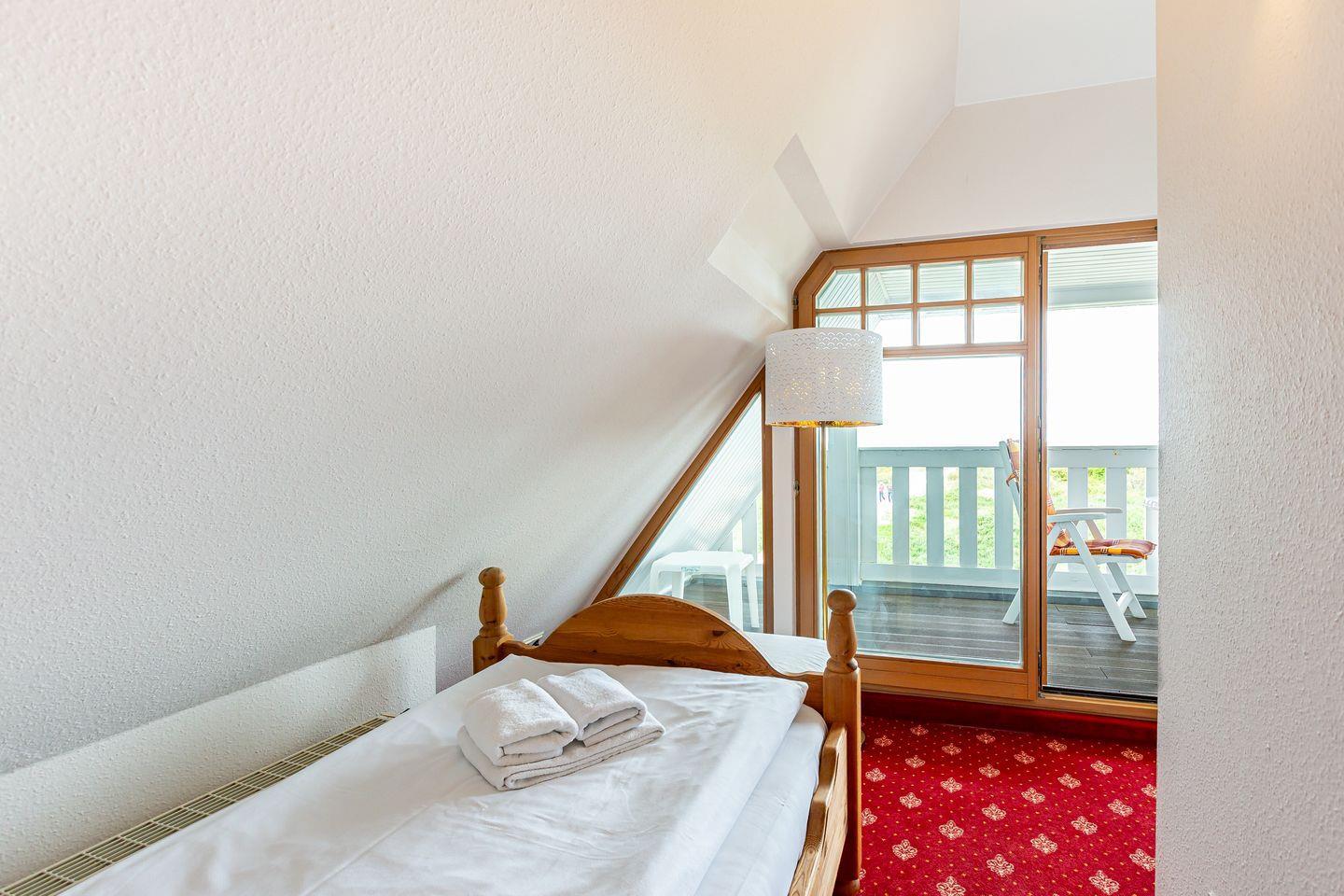 Die Ferienwohnung liegt im Dachgeschoss des Hauses und begeistert durch einen wunderschönen Meerblick. Im Wohnraum befinden sich eine Sitzgelegenheit mit TV-Bereich, eine Miniküche und ein Esstisch. Das Hauptschlafzimmer bietet neben dem Doppelbett die Besonderheit, dass die Eckbadewanne hier integriert wurde. Ein kleines Bad mit Waschbecken und Toilette befindet sich separat. Ein kleines zweites Schlafzimmer mit einem Einzelbett runden die Ferienwohnung ab.