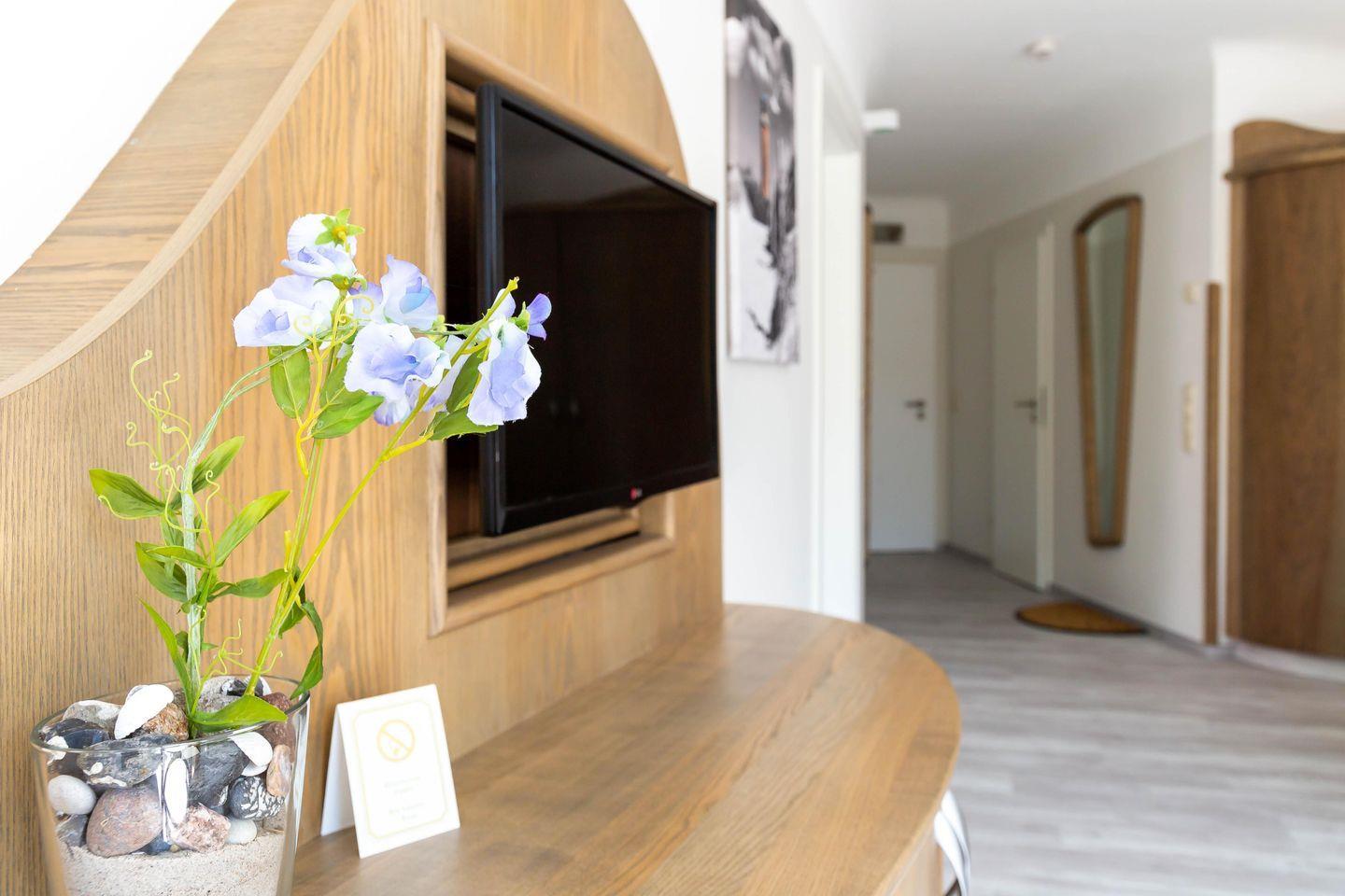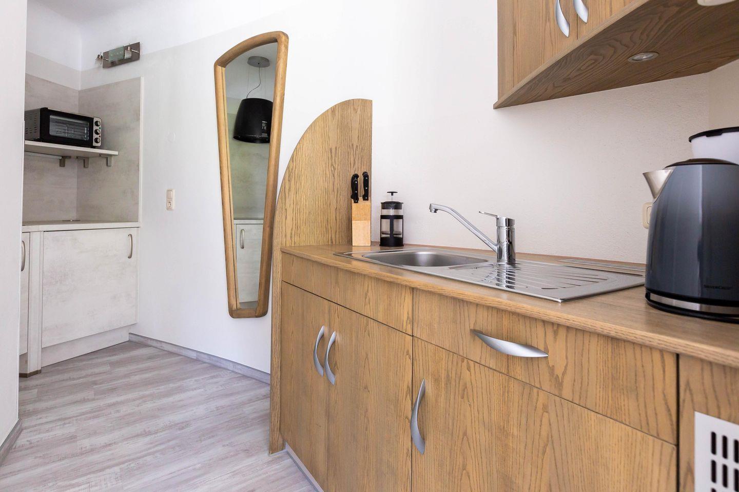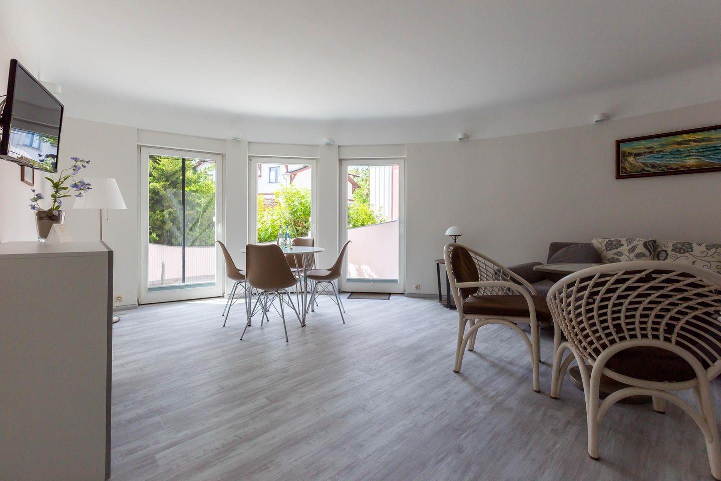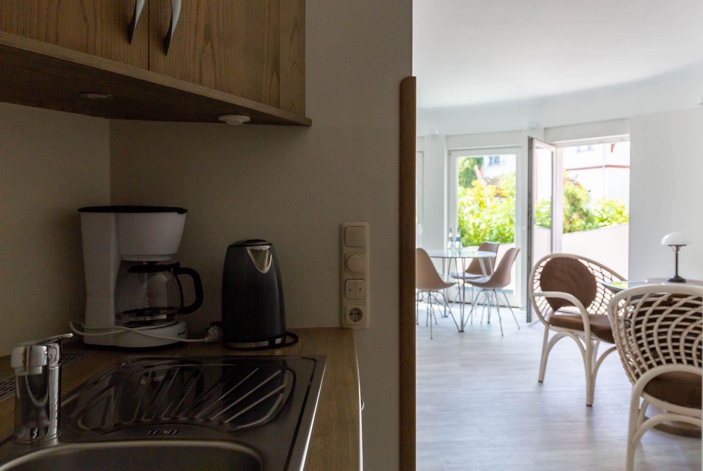 Im Außenbereich steht dir eine kleine sonnige Terrasse mit Tisch und Stühlen zur Verfügung, die von beiden Räumen aus betreten werden kann. Dank der heimischen Pflanzen, die die Terrasse umgeben, kannst du hier ungestört sein, dein Essen unter freiem Himmel genießen oder den Urlaubstag bei einem lauschigen Sommerabend ausklingen lassen. Zur Ferienwohnung gehört außerdem ein PKW-Stellplatz.