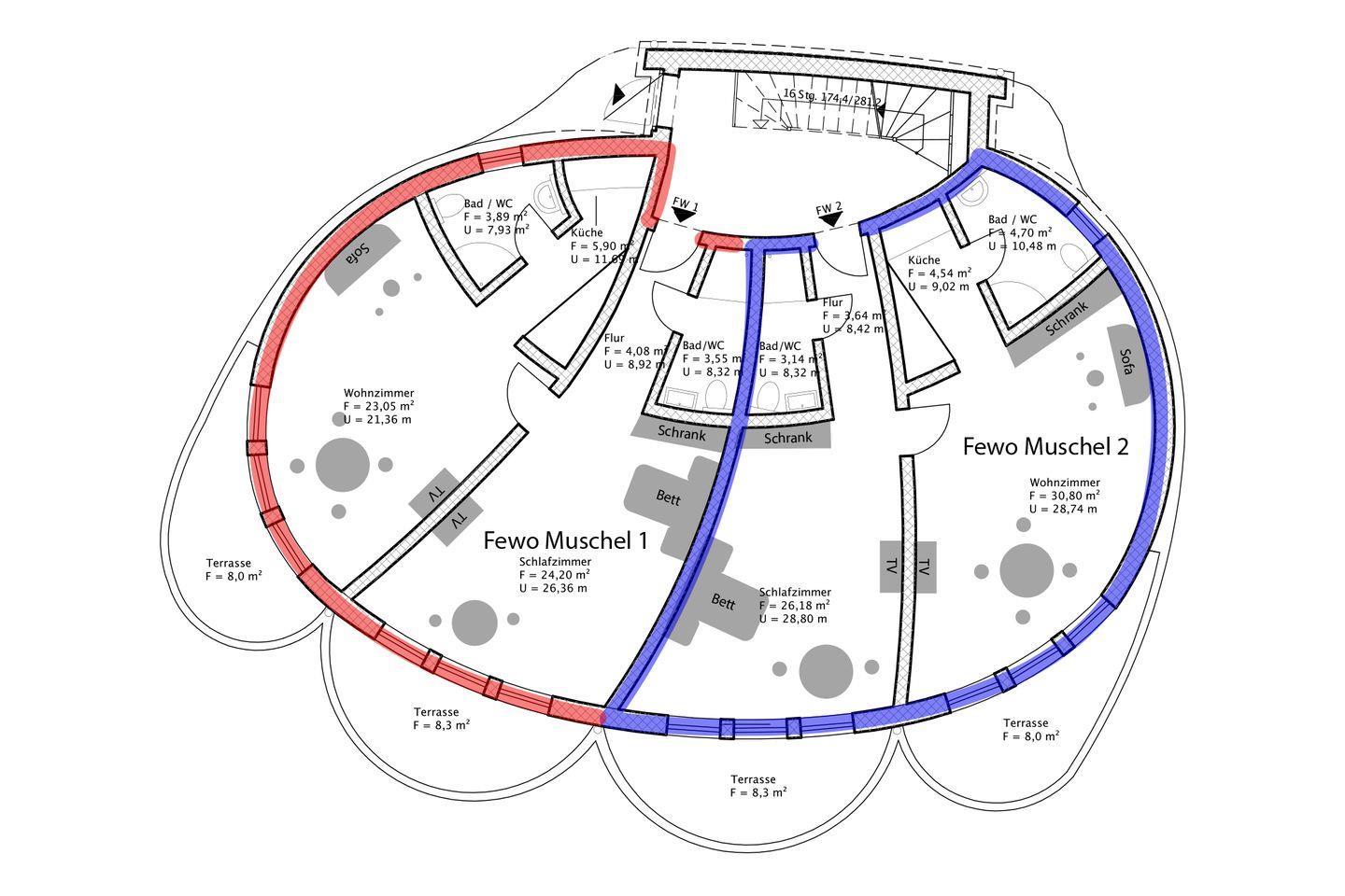 Die Unterkunft „Muschel 1“ befindet sich im Erdgeschoss des Hauses. Großzügige Räume, helle Farben und modernes Mobiliar machen diese Ferienwohnung zu einem besonderen Urlaubsdomizil. Vom Flur mit Garderobe kommst du direkt in das erste Schlafzimmer, dass mit einem großen Doppelbett, Kleiderschrank, Sitzgelegenheit, TV und bodentiefen Fenstern ausgestattet ist. Auch ein Badezimmer mit Dusche und WC kannst du vom Flur aus betreten. Durch eine Tür gelangst du in den großzügigen Wohn- und Schlafbereich. Die vollausgestattete Küchenzeile ist offen integriert und lädt mit Herd, Backofen, Geschirrspüler und Essbereich zum Kochen und Klönen ein. Das gemütliche Sofa kann ausgezogen werden und bietet mit 160 cm Liegefläche einen komfortablen Schlafplatz für bis zu zwei Personen. Abgerundet wird die neu modernisierte Ferienwohnung durch ein zweites Bad mit Dusche und WC.