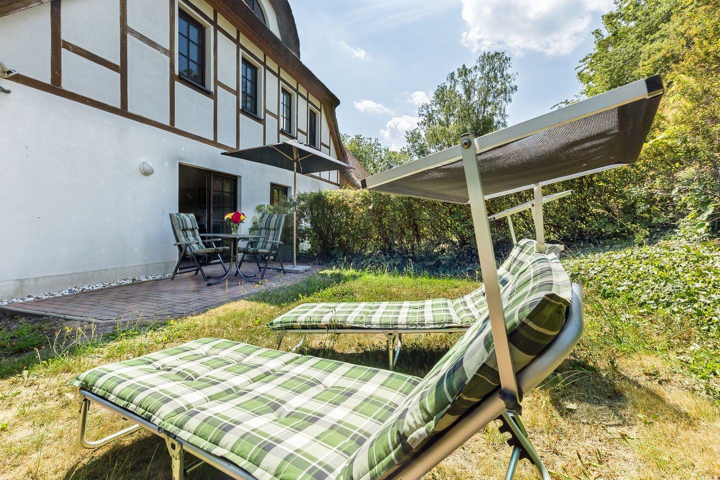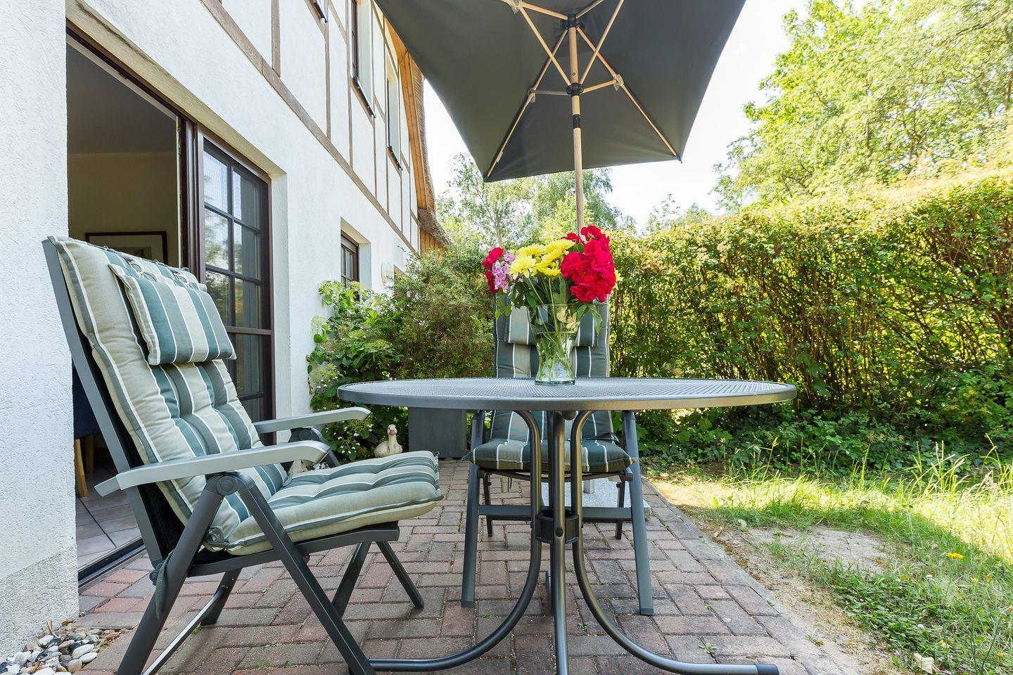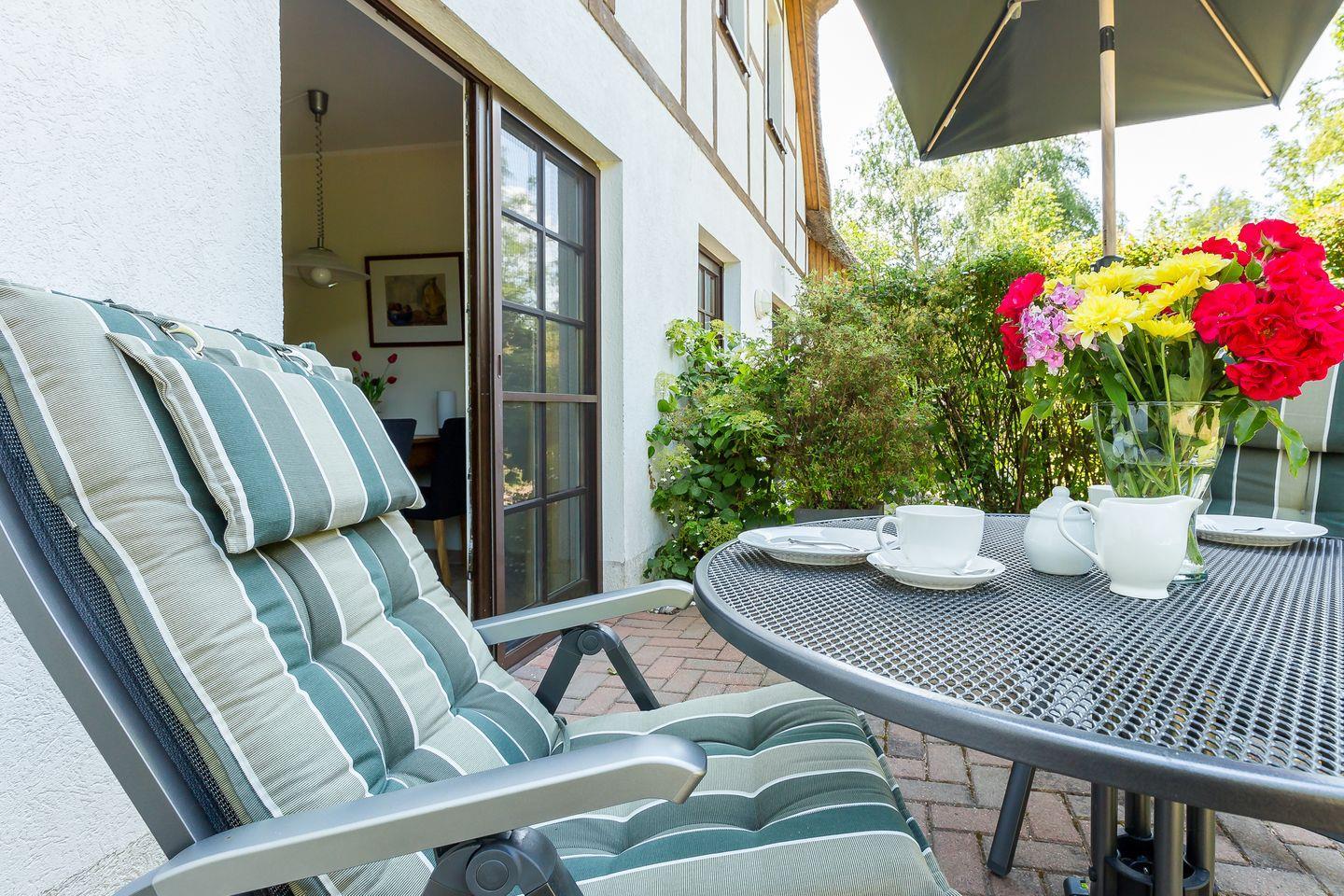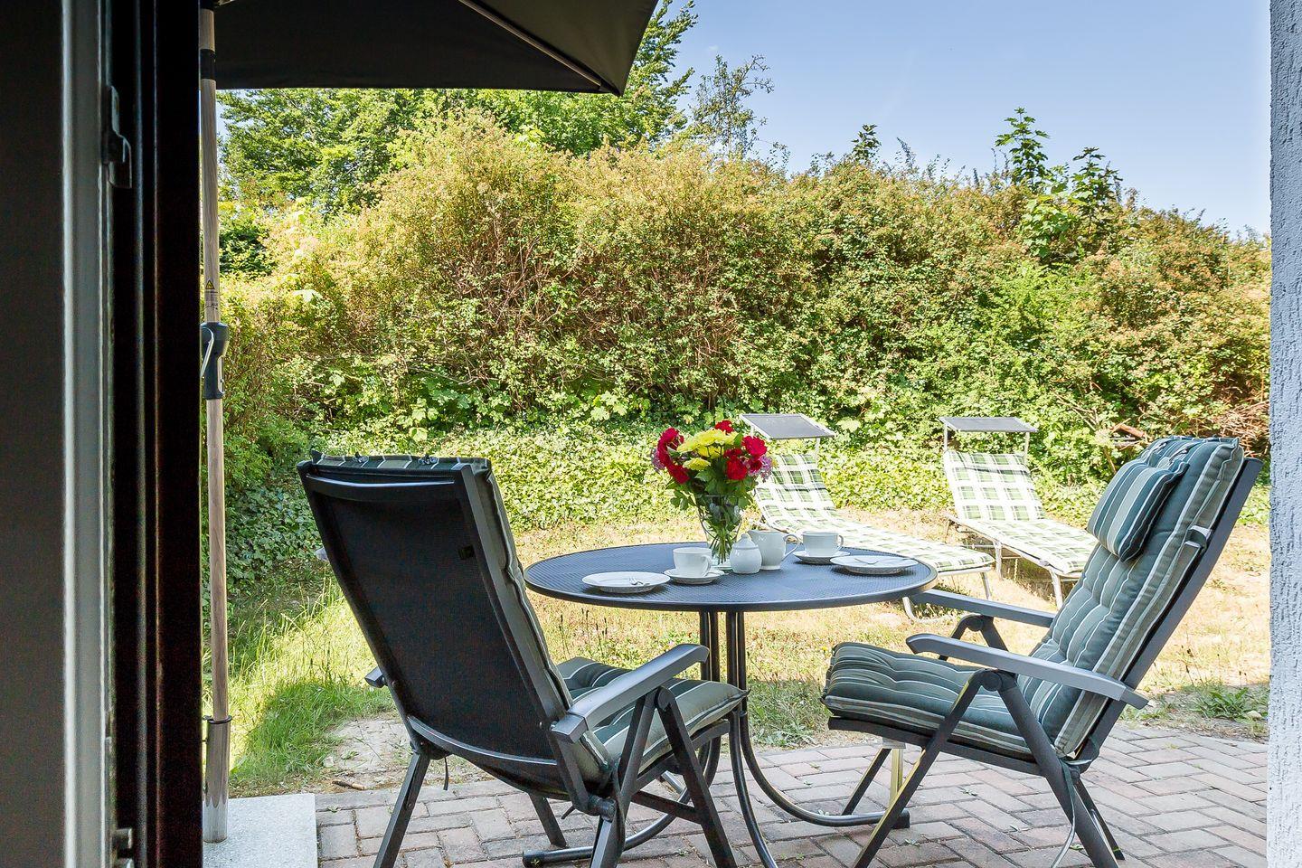 Der Außenbereich verfügt über eine Terrasse mit Südwestausrichtung, Outdoor-Möbeln, Sonnenliegen und Sonnenschirm. Hier lassen sich die Urlaubstage am Morgen beim Frühstück starten und am Abend bei einem Glas Wein und einem guten Buch ausklingen. So liest sich Urlaub? Finden wir auch. Zur Ferienwohnung gehört ein PKW-Stellplatz (gekennzeichnet mit dem Buchstaben "Q").