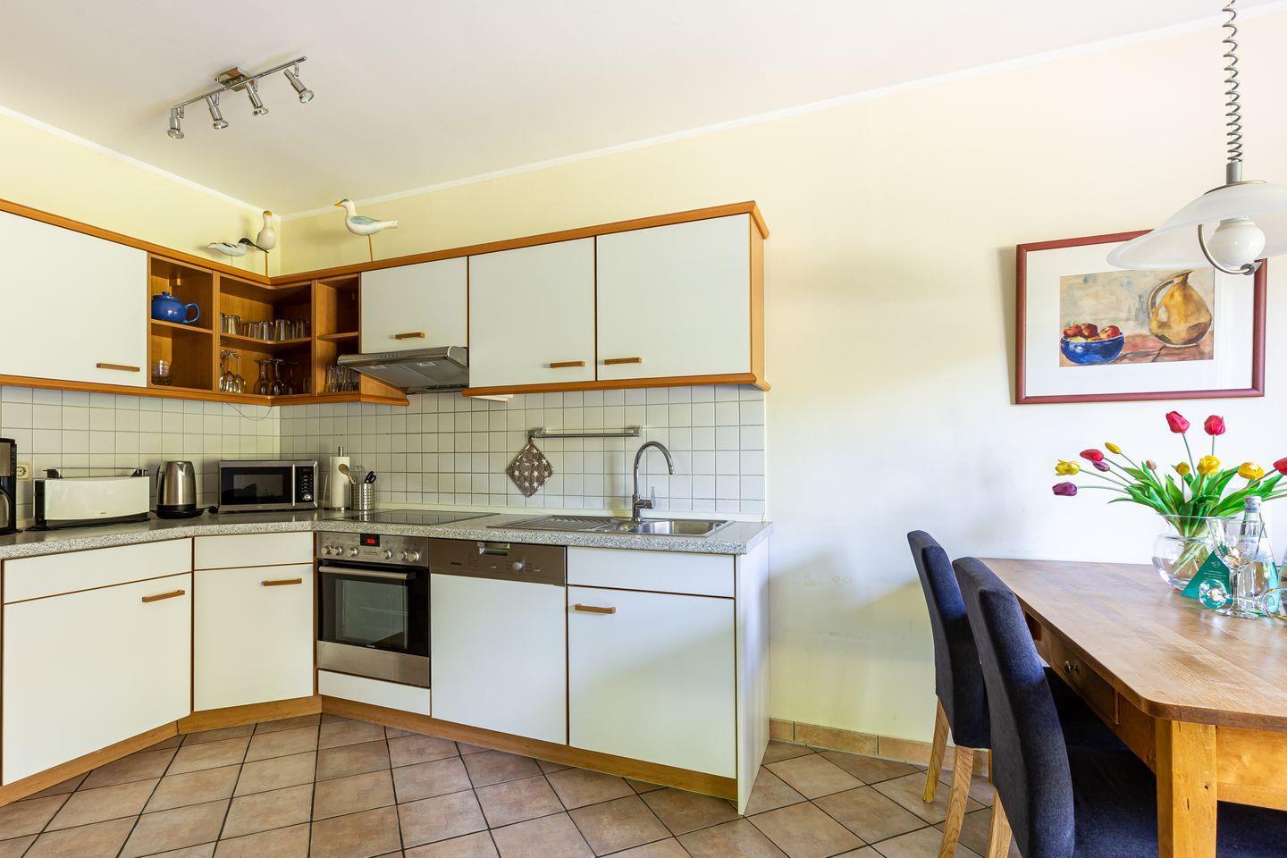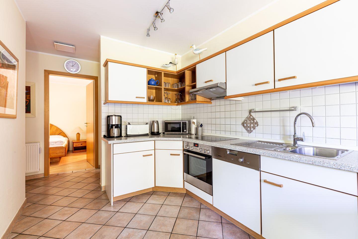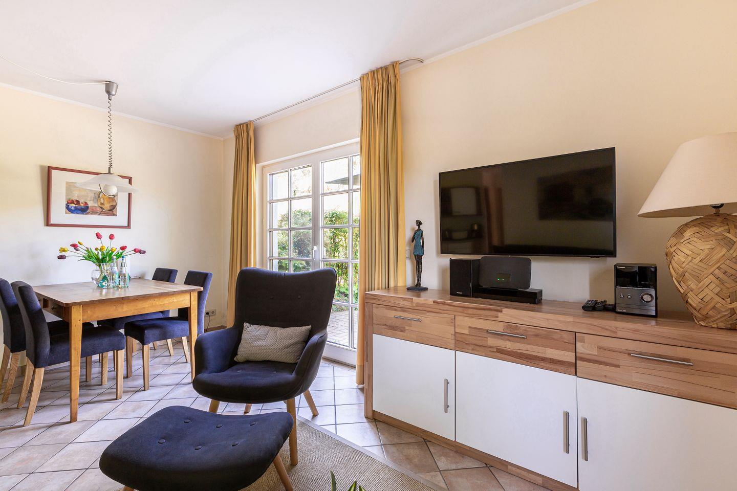 Die Erdgeschosswohnung ist gemütlich ausgestattet und bietet alles was es für einen erholsamen Urlaub zu zweit braucht. Der Wohnbereich verfügt über eine Couch und Sessel zum Relaxen. Offen gestaltet, befindet sich auch die Küchenzeile mit Esstisch mit im Raum. Top ausgestattet mit Geschirrspüler und Miele-Geräten lässt es sich hier komfortabel kochen. Auch das Schlafzimmer ist auf Erholung ausgelegt. Mit den Biomatratzen und großzügigem Doppelbett, Echtholzparkett und Verdunklungsvorhängen bekommt man hier den friedlichen Schlaf, den man sich im Urlaub wünscht. Abgerundet wird die 46 qm Wohnung mit einem Ankleidezimmer mit großem Kleiderschrank und einem Tageslichtbad mit Dusche und WC.