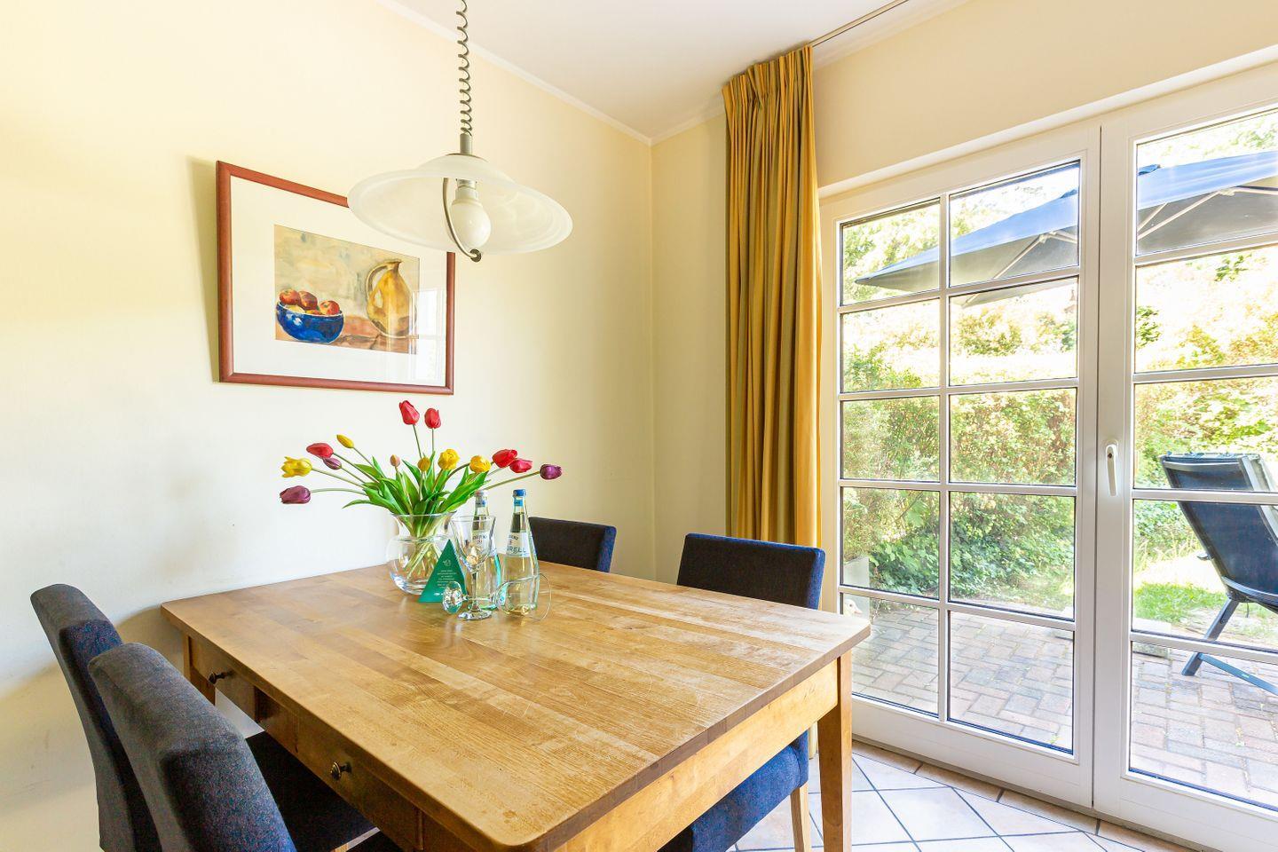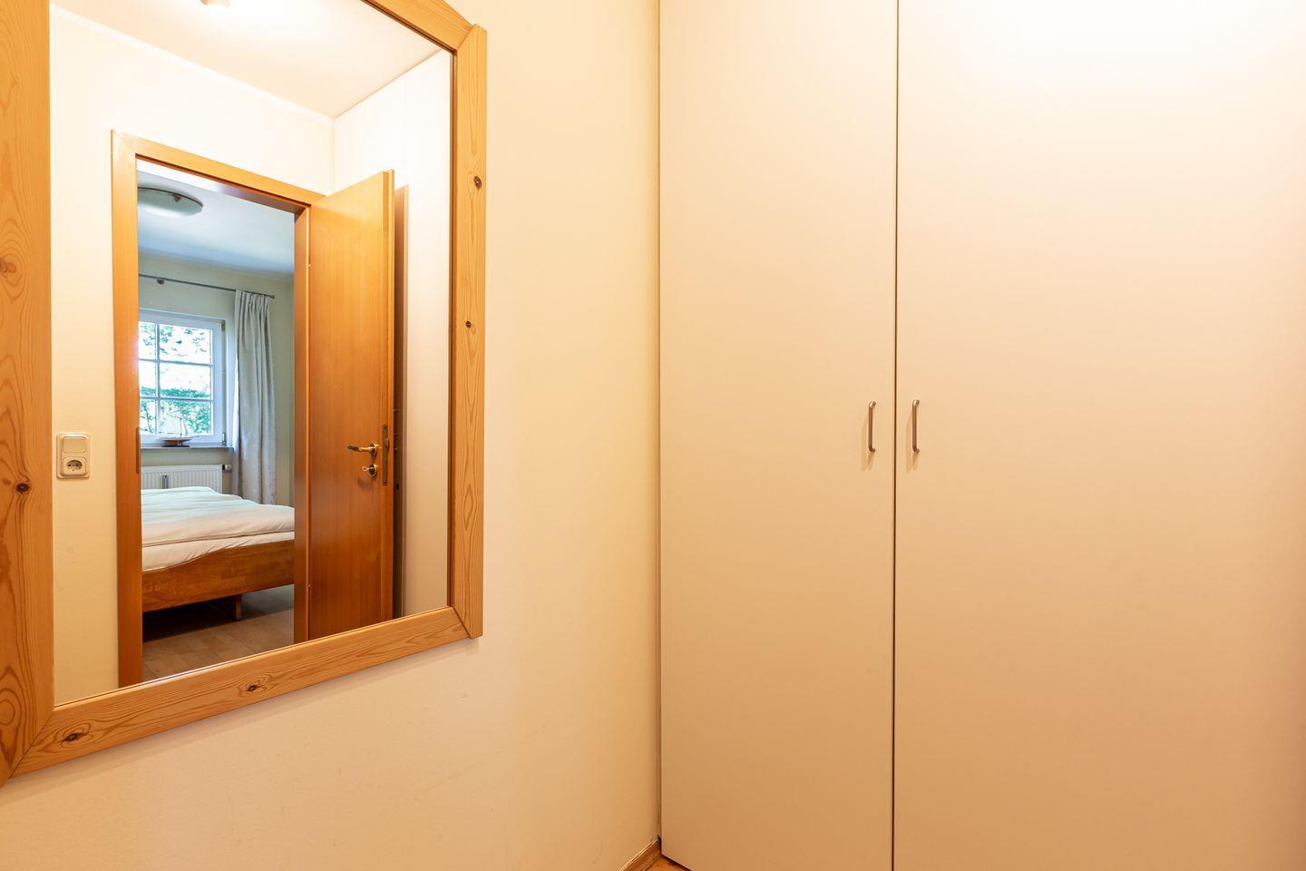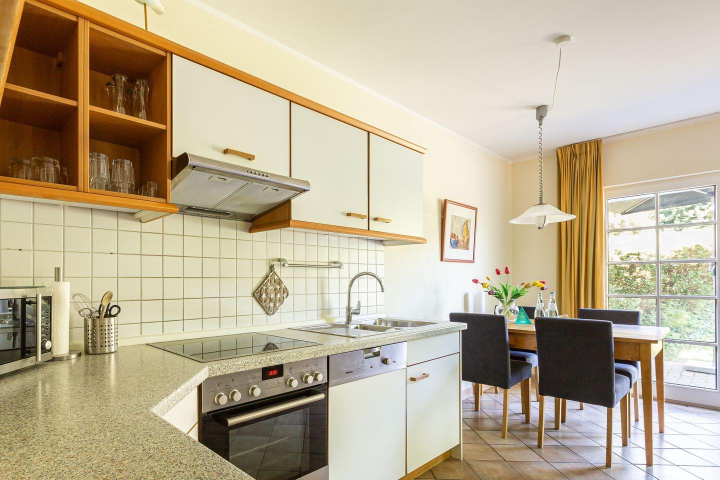 Die Erdgeschosswohnung ist gemütlich ausgestattet und bietet alles was es für einen erholsamen Urlaub zu zweit braucht. Der Wohnbereich verfügt über eine Couch und Sessel zum Relaxen. Offen gestaltet, befindet sich auch die Küchenzeile mit Esstisch mit im Raum. Top ausgestattet mit Geschirrspüler und Miele-Geräten lässt es sich hier komfortabel kochen. Auch das Schlafzimmer ist auf Erholung ausgelegt. Mit den Biomatratzen und großzügigem Doppelbett, Echtholzparkett und Verdunklungsvorhängen bekommt man hier den friedlichen Schlaf, den man sich im Urlaub wünscht. Abgerundet wird die 46 qm Wohnung mit einem Ankleidezimmer mit großem Kleiderschrank und einem Tageslichtbad mit Dusche und WC.
