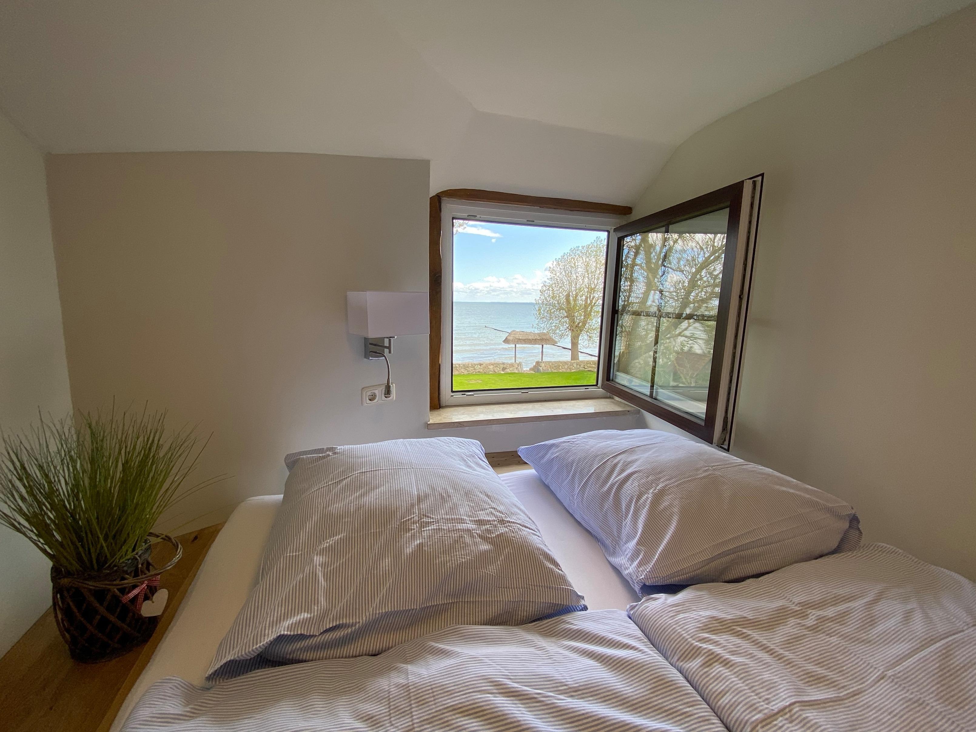 Meerblick! Große 2 Raum Ferienwohnung für 2 - 5 Personen in der 1. Etage. Das Wohnzimmer mit hochwertiger Schlafcouch, Esstisch, Flachbildfernseher und Radio strahlt mit der offenen komplett eingerichteten Küche eine gemütliche Urlaubsatmosphäre aus. Im 2 Zimmer befindet sich das Schlafzimmer mit direktem Merrblick aus dem großen Doppelbett. Das Duschbad mit ebenerdiger Dusche und der Flurbereich runden diese Ferienwohnung ab.