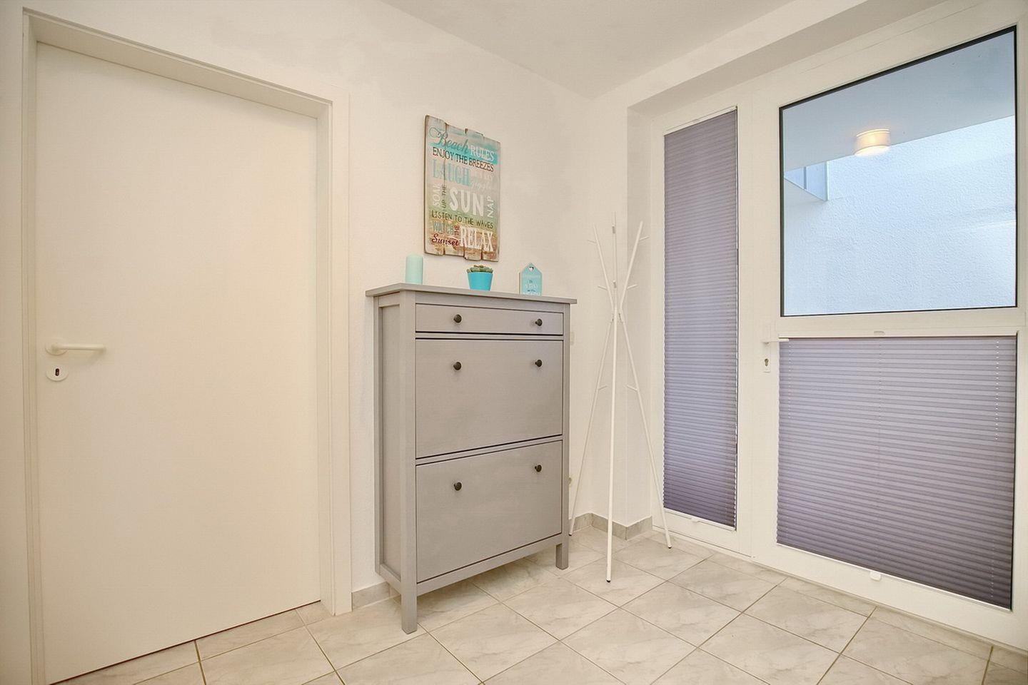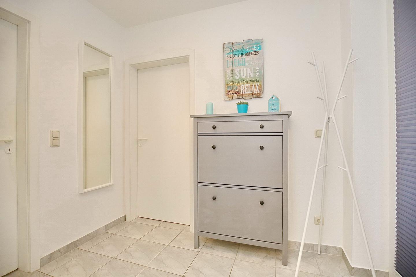 Vom Flur aus erreichst du das Duschbad. Als Bodenbelag wurde in der Ferienwohnung Design-Belag und Fliese gewählt. In dieser Nichtraucherwohnung ist maximal ein Haustier erlaubt.
