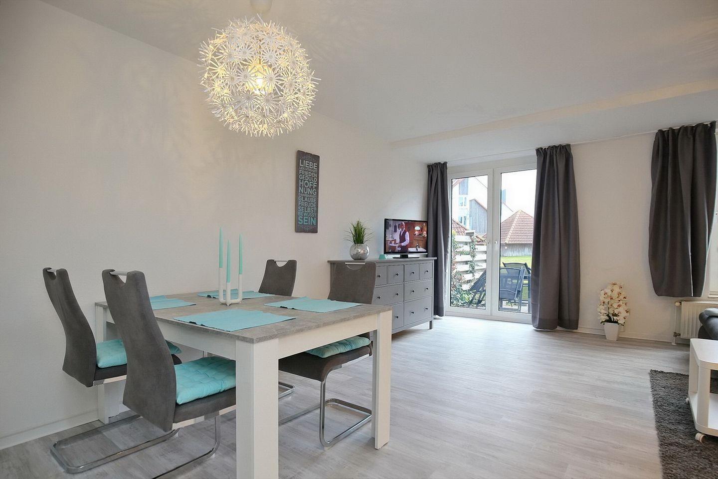 Die neue Küche der Ferienwohnung beinhaltet einen Kühlschrank mit Gefrierfach, ein Ceran-Kochfeld mit Backofen und ein Geschirrspüler. Ein gemütlicher Essplatz für 4 Personen erwartet dich im Wohnzimmer.