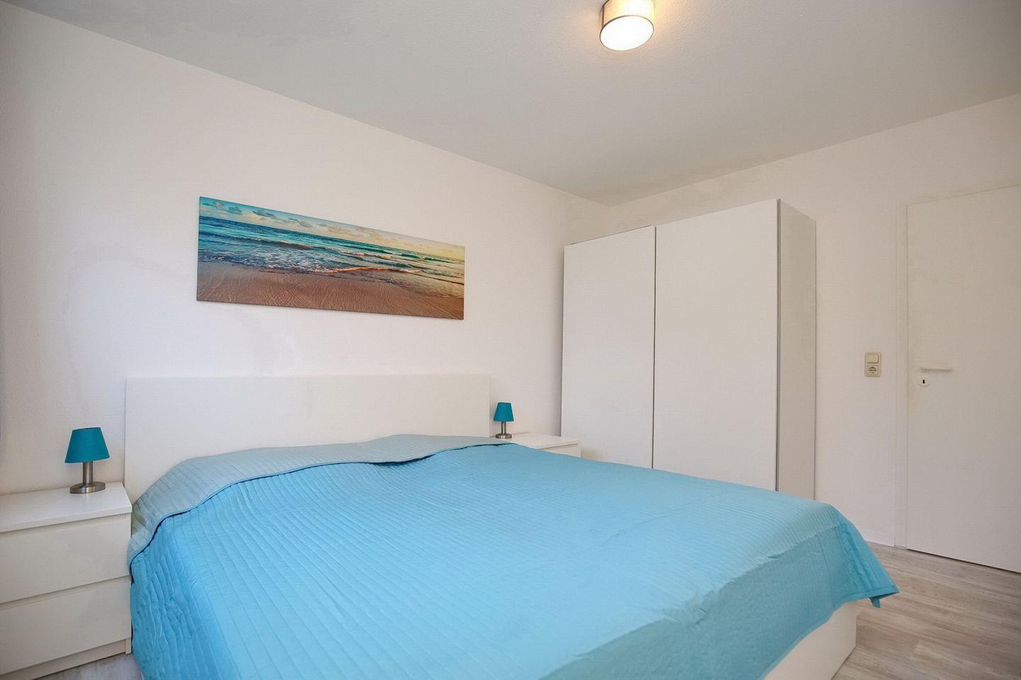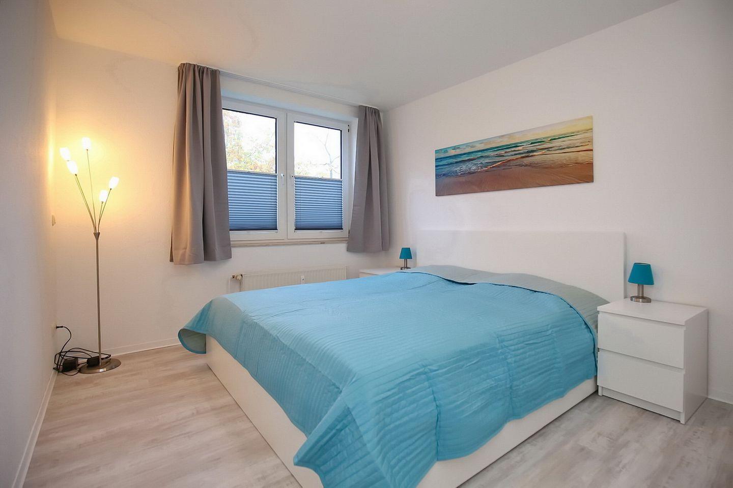 Das Schlafzimmer verfügt über ein Doppelbett (2 x 90 x 200 cm) und einen Kleiderschrank. Als Verdunkelung wurden Vorhänge sowie Plissees an die Fenster angebracht.