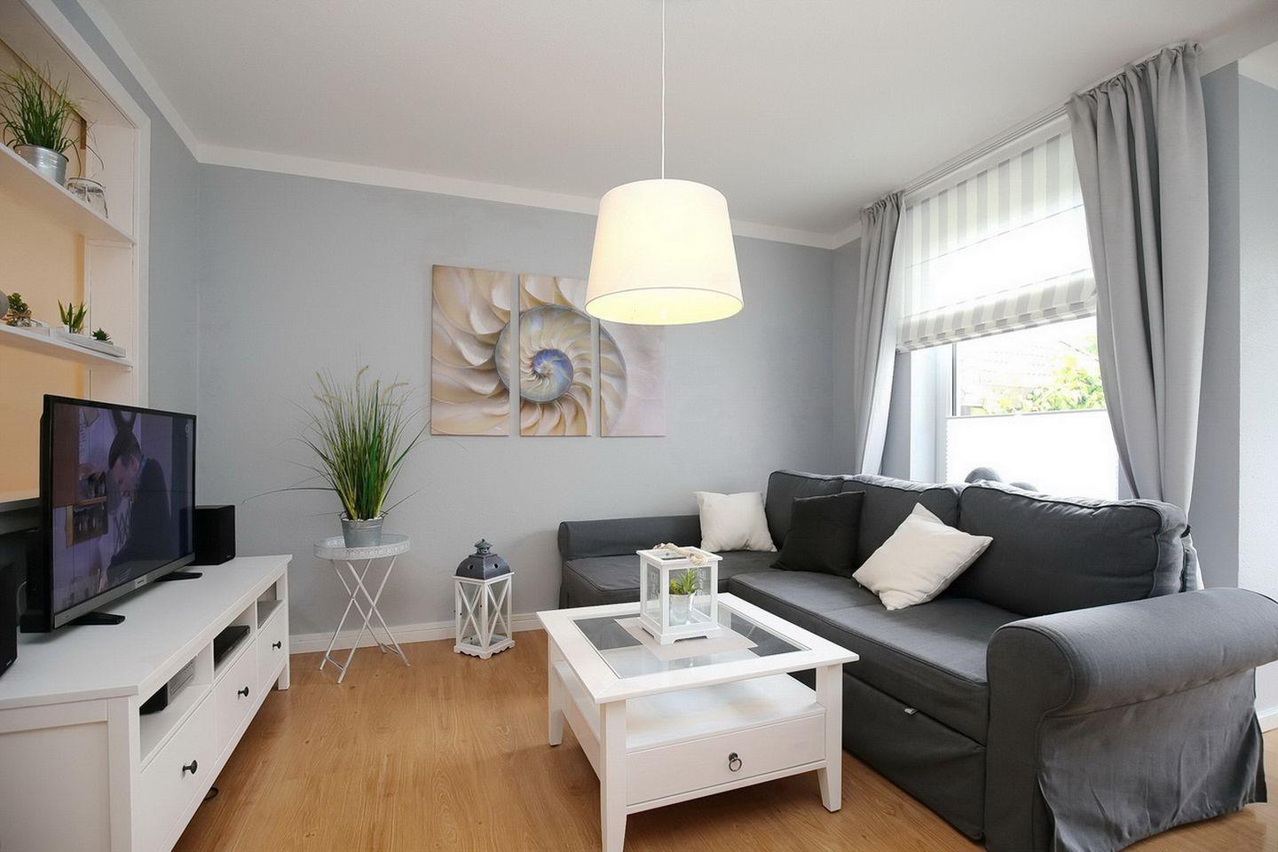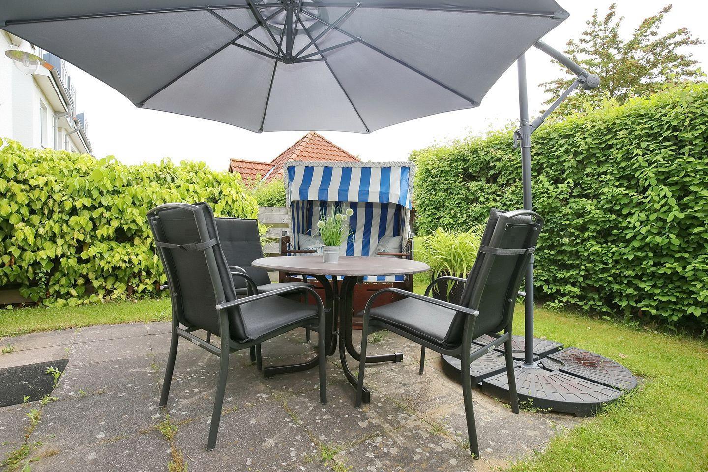 Vom Wohnbereich aus gelangst du auf die möblierte Terrasse, wo sich auch ein Strandkorb befindet. Eine kleine Hecke dient als Sichtschutz. Im lichtdurchfluteten Wohnzimmer befinden sich eine gemütliche Wohnlandschaft und der Essbereich. Zum Zeitvertreib stehen dir sowohl ein TV, eine Stereoanlage als auch eine Auswahl an Büchern zur Verfügung. Der Bodenbelag ist hier Laminat.