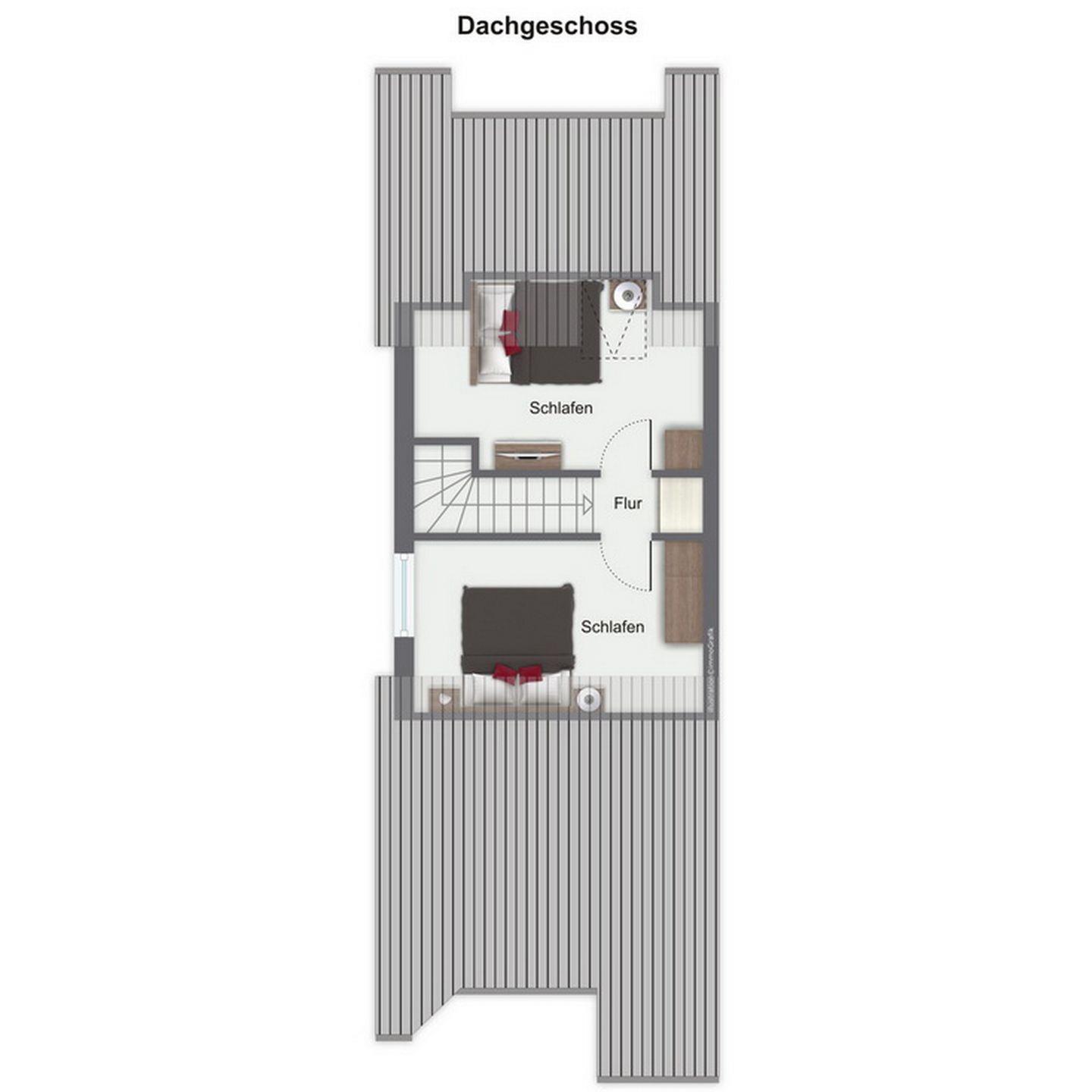 Über eine innenliegende Treppe im Wohnbereich erreichst du zwei weitere Schlafräume. Diese sind mit einem Doppelbett (180 x 200 cm), einem Einzelbett (90 x 200cm) und einem Kleiderschrank ausgestattet. In allen Schlafbereichen wurden an den Fenstern zur Abdunkelung Rollos angebracht. Der Boden ist im Obergeschoss mit Designbelag ausgelegt.