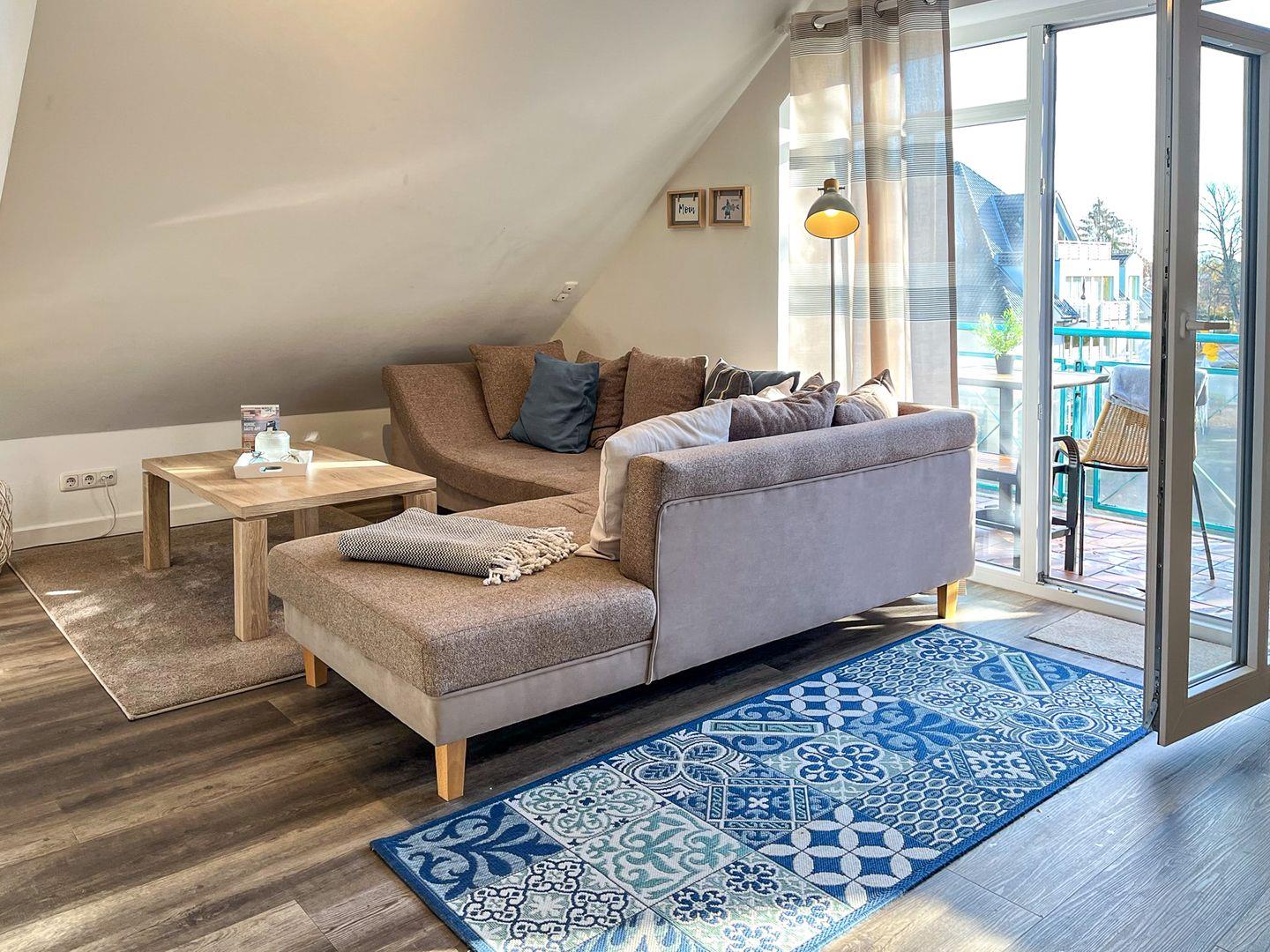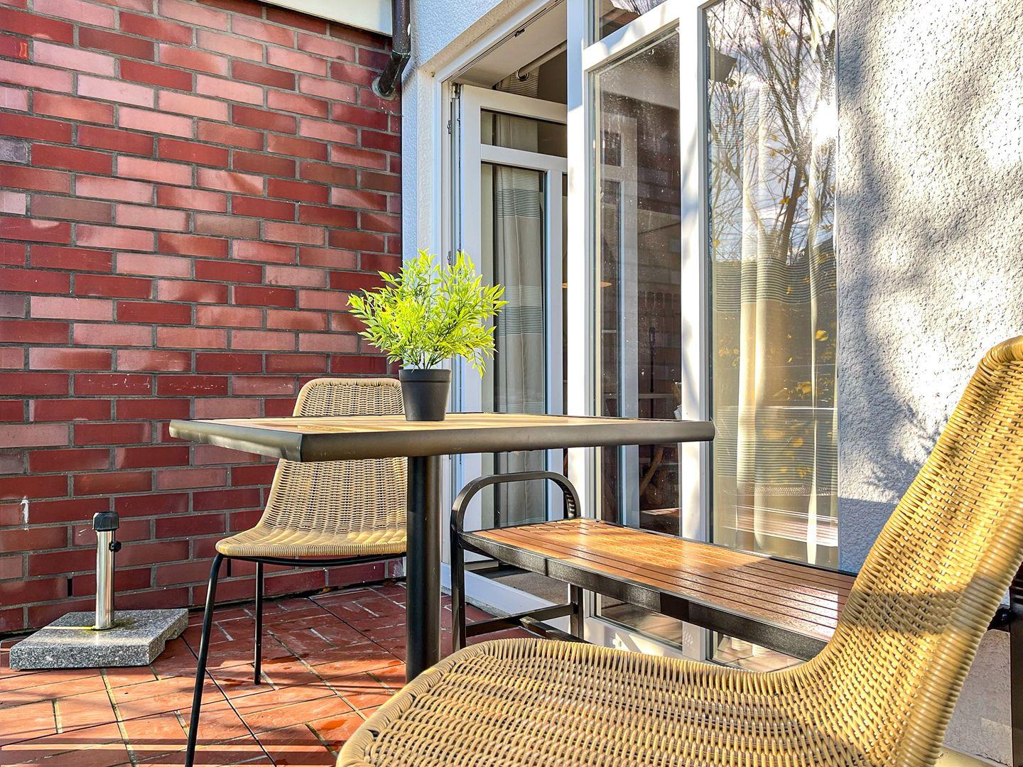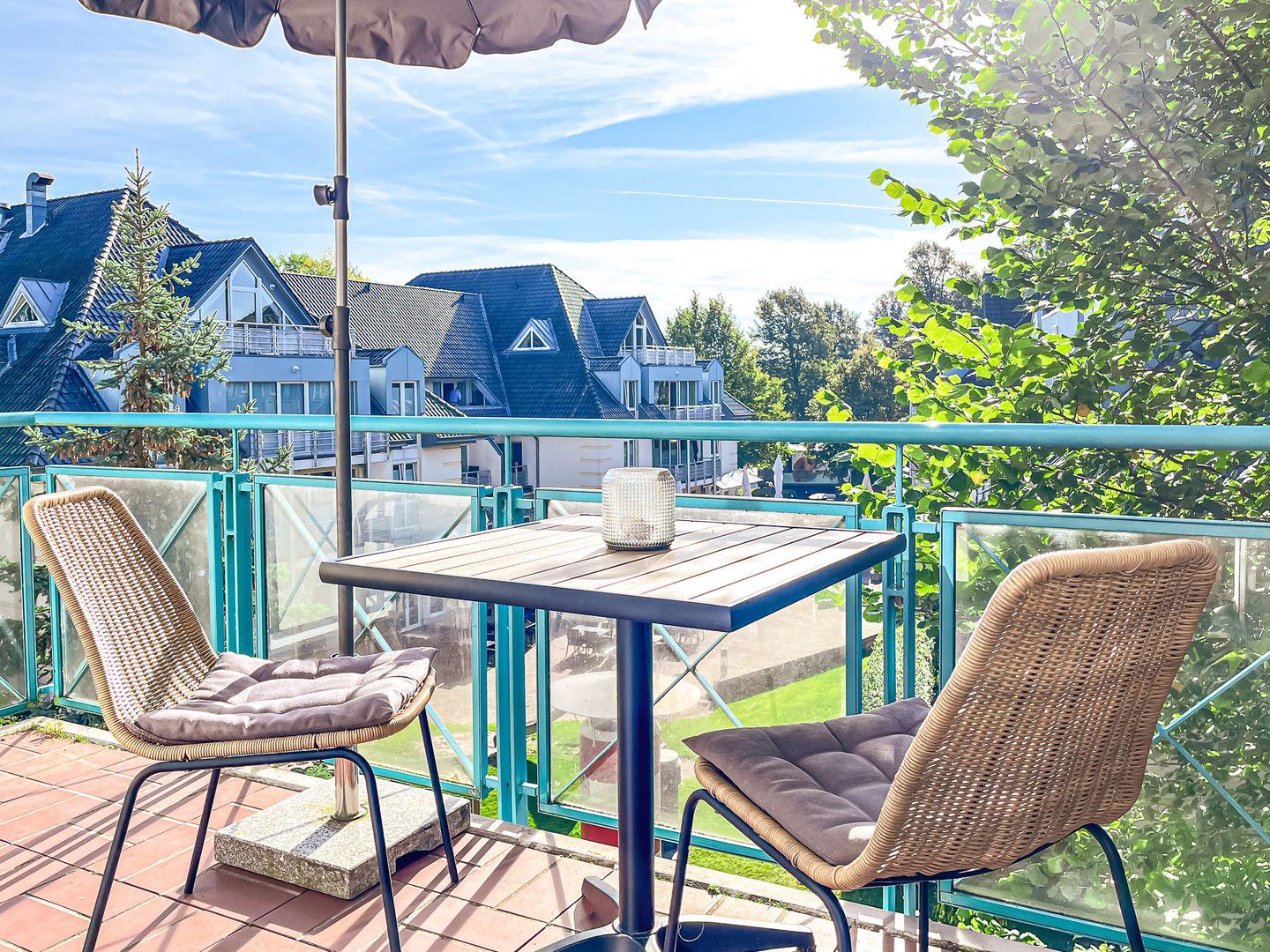 Die Wohnung Nr. 19 liegt im 2. OG. Du bewohnst auf 67 m² ein Wohnzimmer mit Küchenzeile, zwei Schlafzimmer, ein Duschbad sowie einen möblierten Balkon in Süd-Ost-Richtung. Die Strandentfernung beträgt ca. 100 Meter.