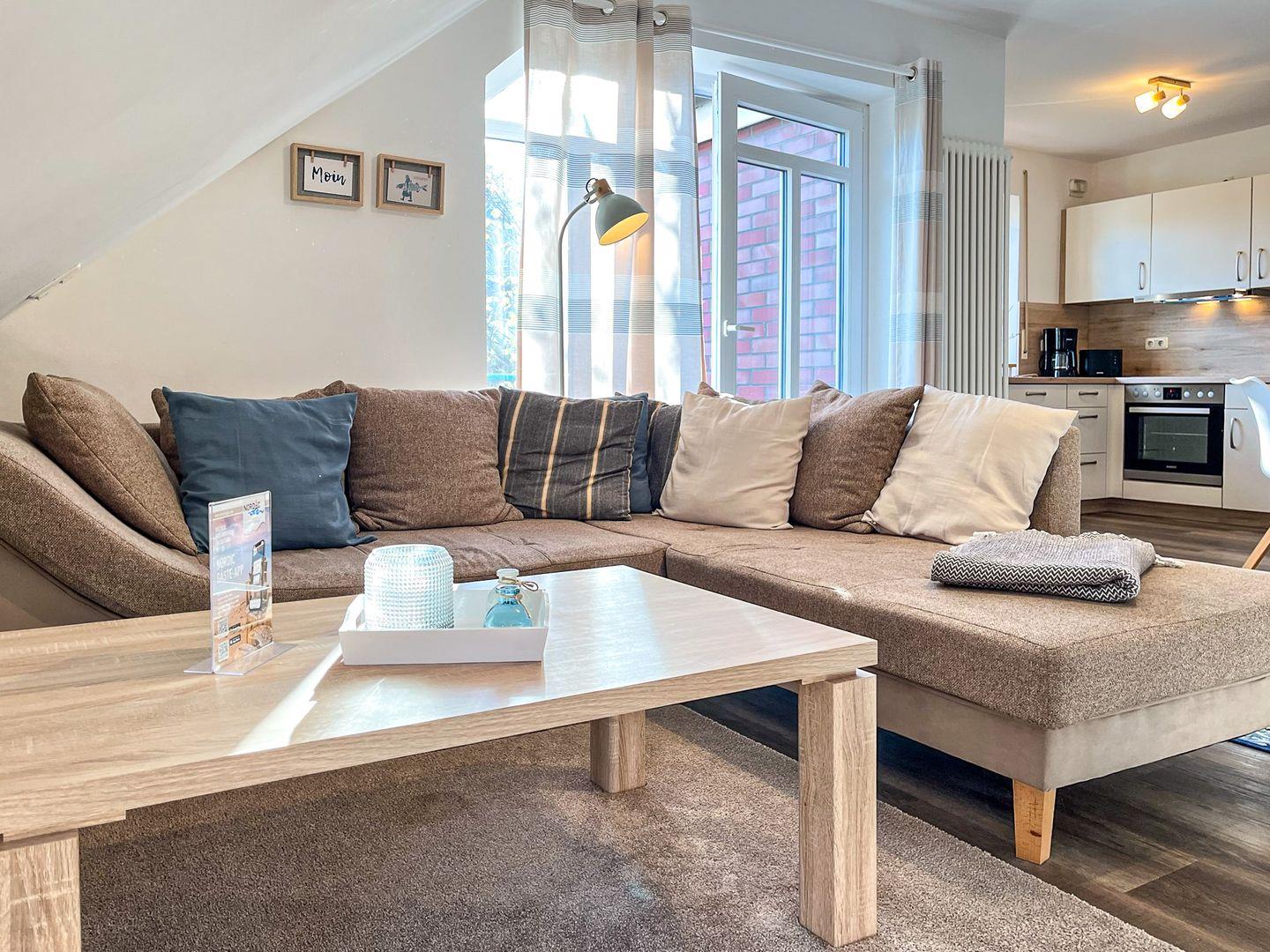 Im Wohnzimmer steht dir ein Smart-TV für die Unterhaltung am Abend zur Verfügung. Vorhänge am Fenster bieten Sichtschutz.