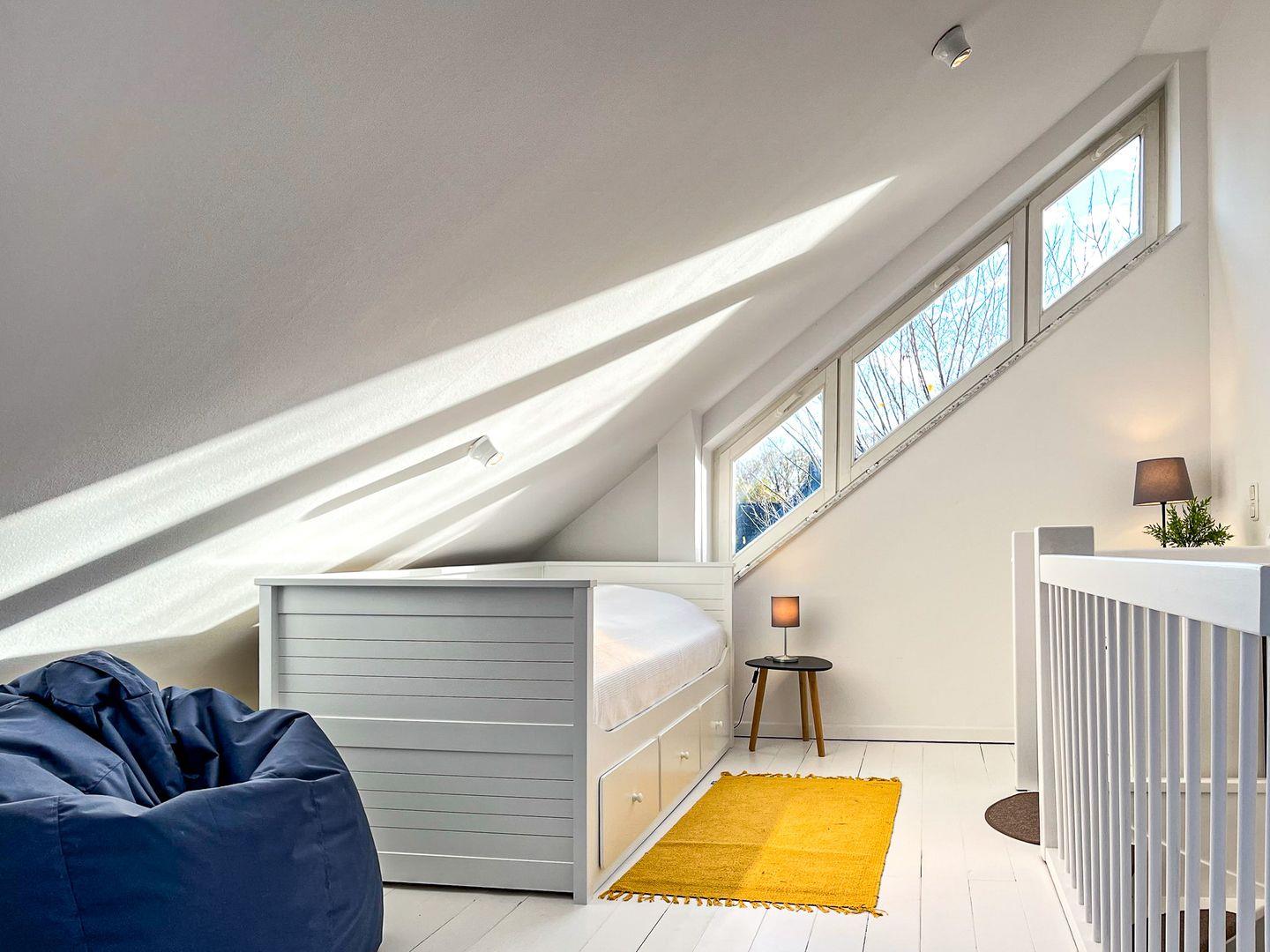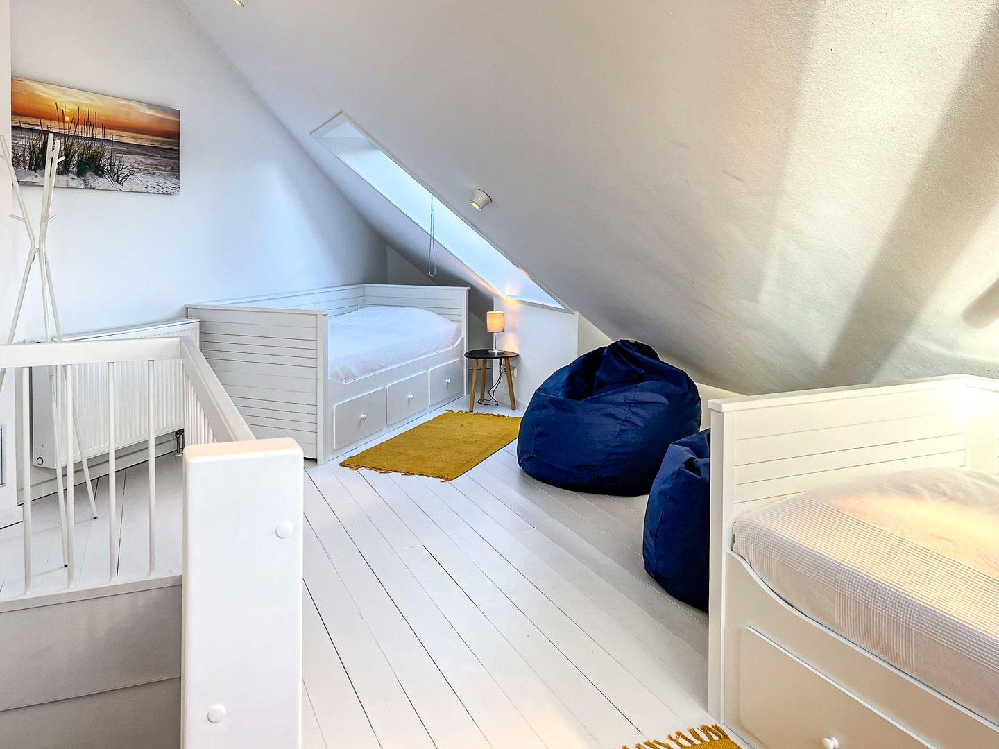 Das zweite Schlafzimmer befindet sich auf dem Spitzboden und verfügt über zwei Einzelbetten.