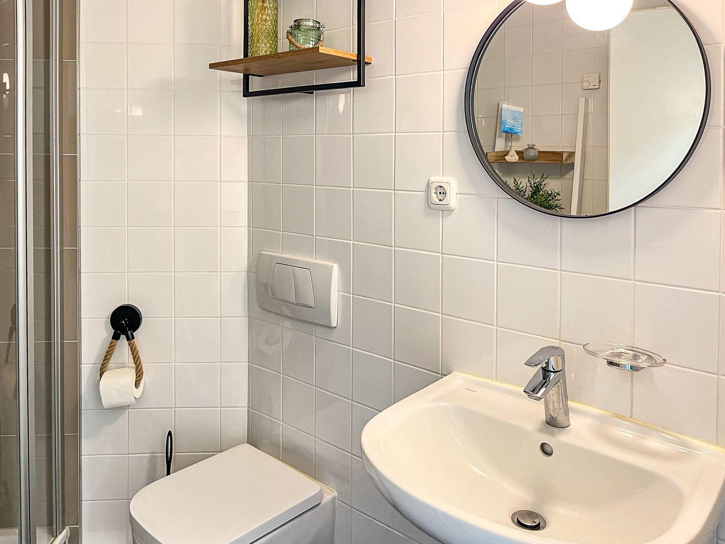 Das Duschbad ist gefliest. Der gesamte Wohnbereich wurde mit Vinyl-Belag ausgelegt.